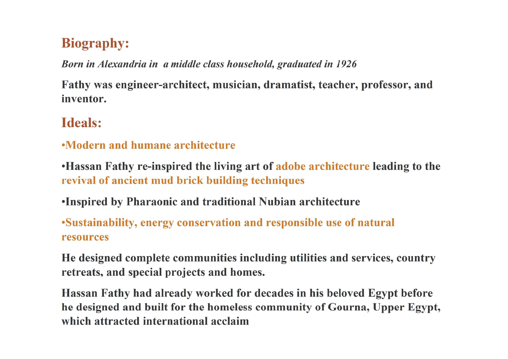 Biography: Born in Alexandria in a middle class household, graduated in 1926 Fathy was engineer-architect, musician, dramatist, teacher, professor, and inventor. Ideals: Modern and humane architecture Hassan Fathy re-inspired the living art of adobe architecture leading to the revival of ancient mud brick building techniques Inspired by Pharaonic and traditional Nubian architecture Sustainability, energy conservation and responsible use of natural resources He designed complete communities including utilities and services, country retreats, and special projects and homes. Hassan Fathy had already worked for decades in his beloved Egypt before he designed and built for the homeless community of Gourna, Upper Egypt, which attracted international acclaimRole in the Renascent (reborn) Arabism in architecture Fathy methodically searched for and empirically uncovered an all-but-forgotten method of construction deep within his own cultural context Attention to the value of traditional integrity and cultural identity amidst strong Temple of Ramses Upper Egypt. c.1292-1225 B.C. western influence Temple of Ramses II, Luxor, Egypt c1292-1225 BCThe Earth Tectonic models that express core beginnings of evolution of Arab architecture. Mud architecture stood for more than 1600 years proving its structural stability A mud-brick arch Durability and versatility of the material was discovered and the cultural links established Mediaeval Cairo and the Nubian villages of upper Egypt Nubian craftsmen were masters at constructing domed and vaulted roofs of mud brick which they also used for the walls. The structures were cheap, cool in the summer and the walls were heat-retaining in winter. Making mud bricksEnvironmental and Oa a Air Movement Study Aesthetic aspects of Mud Malkaf Mediaeval Cairo - Muhibb-al-din built around Dorqa'a 1350AD - Part of royal (roofed courtyard) / complex Qa'a Qa'a Mohibb-al-Din is most significant for introducing windcatch or 'Malkaf'. Environmentally sensitive building - predominant use Sahn (alcove) of northerly wind House of Muhilsh Al-Din survey showing air movements through the buildingHassan Fathy developed his own ideas, inculcating traditional Arab styles like the: malkhaf (wind catcher), shukshaykha (lantern dome) mashrabeya (wooden lattice screens) / (Sunshades) qa'a [a central, high-ceilinged upper-story room for receiving guests, constructed so as to provide natural light and ensure ventilation] was supplanted by the ordinary salon, and all such delights as the fountain, salsabil [a fountain or a basin of still water designed to increase air humidity] He encouraged the revival of such ancient crafts as claustra (lattice designs in the mud work) to adorn the buildings.L Salsab Qa'a Beit and Malkaf Qa'a / Shukshaykah and MashrabeyaKamariyya Plastic and stained glass window that do not open and Omriyad Small stained glass openings in star and hexagon - hammanSocio-Economic relations Village predominantly relying on Agriculture - Female interests in Domestic matters such as tending' Livestock and house maintenance Kaolinic clay as building material From nearby caves Each house is different especially the Placement of central courtyard Courtyard is the important outdoor room Reserved for family and friends Two important features are the 'Mandarah' House Aboul-Riche And 'Kheima' - Flat roofed LoggiaKheima service sleep living guest Mandarah Overall, Hassan Fathy showed great Historical and social perspective and A deep concern for climatic and cultural Issues that supercedes social status Or historical chronology 00 Kheima elevation of Plan and elevation of house in Aboul-Riche Section of a house in Aboul-RicheWork: Duality of eastern and western influences and contradictions Early works - tries to emulate British culture Later works - invents a style - incorporated esence of our own heritage Affected by mythology of Orientalism (study of Near and Far Eastern societies and cultures, languages, and peoples by Western scholars ) Philosophy: Rather than believing that people could be behaviorally conditioned by architectural space, Fathy felt human beings, nature and architecture should exist in harmonious balance Architecture is a communal art Reflect personal habits and traditions of a community than reforming or eradicating them Technology - subservient to social values, appropriate to needs SharmFeatures: 1. Seclusion and privacy for family Basic requirement of Islamic society Spaces for family and guests defined 2. Thesis of space Conversion of spaces into set of rules 3. Need for architecture to join rather than separate people from the natural world Eg: Al Sabah house Village of Baris Kharga Oasis - "Suq" Site plan - New Gourna Harraniya weaving village Riad house Ismail abd al razik resthouseBeit Souhemi, Cairo 1648 Family courtyard and formal aktaboosh (Loggia) Formal courtyard (Iwan) Seclusion and privacy for the family , thesis of space6 Principles of Hassan Fathy: 1. Fundamental humanism - primacy of human values in architecture 2. Importance of universal than limited approach 3. Appropriate technology 4. Need for socially oriented, co-operative construction techniques "self help" - eg Village of New Gourna, reconstruction of Sohar, Oman 5. Use of tradition in architecture 6. Reestablishment of national cultural pride through the act of buildingworksProject 1 - Royal Society of Agriculture, Bhatim, Egypt, 1941 Dome reflects sky - still paying symbolic respect Bhatim complex consists of housing, stable for cattle, granaries and a pigeon-cote all organized in within a boundary and pierced by one entry door Dome constructed based on ancient technology - revived [IIIIIIH No supports - centering Royal Society of elevations and plan.Kick-off wall - typical vault and dome construction without supports Typical sequence of and construction in mud brickProject 2 - Ezbet Al Basry, Egypt, 1942 Government housing quarters -Failed to be executed Qa'a Indirect Entry Iwan Taktaboosh