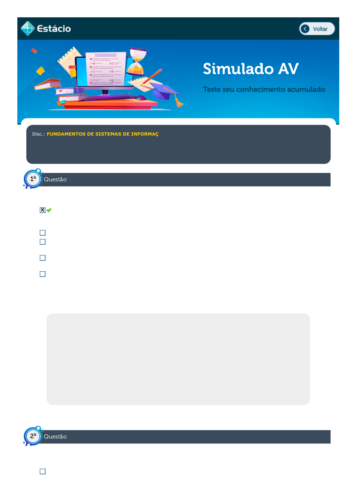09/06/2021 Estácio: Alunos https://simulado.estacio.br/alunos/?p0=91390356&user_cod=5368074&matr_integracao=202104641265 1/6 Simulado AV Teste seu conhecimento acumulado Disc.: FUNDAMENTOS DE SISTEMAS DE INFORMAÇÃO Aluno(a): WILLIAN LUIZ GIACOMITTI 202104641265 Acertos: 10,0 de 10,0 09/06/2021 Acerto: 1,0 / 1,0 Por que começaram a serem usados sistemas automatizados no lugar dos manuais. Porque na medida em que o volume de dados é grande, os sistemas tendem a ser automáticos produzindo informações mais precisas e de melhor qualidade, possibilitando às empresas uma administração mais eficiente. Porque nos sistemas automatizados são usados recursos simples como lápis e papel. Porque podemos identificar tipos de sistemas conforme o nível em que atuam nas organizações. Porque nos sistemas automatizados, a informação é gerada de forma anômala aos sistemas manuais. Porque na automação de tarefas existe um esforço muito grande e não compensa transferir essas rotinas para serem automatizadas. Respondido em 09/06/2021 10:45:56 Explicação: Nos sistemas automatizados, a informação é gerada de forma automática, usando- se recursos de processamento eletrônico tais como calculadoras ou computadores (tecnologias de hardware e software). Na medida em que o volume de dados é grande, os sistemas tendem a ser automáticos produzindo informações mais precisas e de melhor qualidade, possibilitando às empresas uma administração mais eficiente. A automação de tarefas rotineiras não só reduz os custos como também melhora o controle sobre as operações que, por sua vez, torna possível a melhoria no processo decisório com informações mais confiáveis. Acerto: 1,0 / 1,0 Com relação ao SOFTWARE, um dos principais componentes dos Sistemas de Informação (SI), podemos dizer que são VERDADEIRAS as afirmações abaixo, EXCETO: Um sistema pode ser entendido como sendo um conjunto de programas que, de forma integrada e ordenada, realiza cada qual uma tarefa específica. Questão1a Questão2a https://simulado.estacio.br/alunos/inicio.asp javascript:voltar();