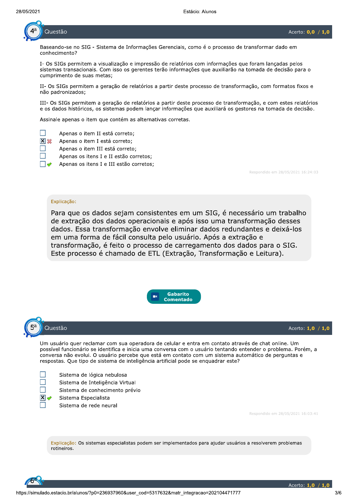 28/05/2021 Estácio: Alunos Questão Acerto: 0,0 / 1,0 Baseando-se no SIG Sistema de Informações Gerenciais, como é o processo de transformar dado em conhecimento? I- Os SIGs permitem a visualização e impressão de relatórios com informações que foram lançadas pelos sistemas transacionais. Com isso os gerentes terão informações que auxiliarão na tomada de decisão para o cumprimento de suas metas; II- Os SIGs permitem a geração de relatórios a partir deste processo de transformação, com formatos fixos e não padronizados; III- Os SIGs permitem a geração de relatórios a partir deste processo de transformação, e com estes relatórios e os dados históricos, os sistemas podem lançar informações que auxiliará os gestores na tomada de decisão. Assinale apenas o item que contém as alternativas corretas. Apenas o item II está correto; Apenas o item I está correto; Apenas o item III está correto; Apenas os itens I e II estão corretos; Apenas os itens I e III estão corretos; Respondido em 28/05/2021 16:24:03 Explicação: Para que os dados sejam consistentes em um SIG, é necessário um trabalho de extração dos dados operacionais e após isso uma transformação desses dados. Essa transformação envolve eliminar dados redundantes e deixá-los em uma forma de fácil consulta pelo usuário. Após a extração e transformação, é feito o processo de carregamento dos dados para o SIG. Este processo é chamado de ETL (Extração, Transformação e Leitura). Gabarito H Comentado Questão Acerto: Um usuário quer reclamar com sua operadora de celular e entra em contato através de chat online. Um possível funcionário se identifica e inicia uma conversa com o usuário tentando entender o problema. Porém, a conversa não evolui. usuário percebe que está em contato com um sistema automático de perguntas e respostas. Que tipo de sistema de inteligência artificial pode se enquadrar este? Sistema de lógica nebulosa Sistema de Inteligência Virtual Sistema de conhecimento prévio Sistema Especialista Sistema de rede neural Respondido em 28/05/2021 16:03:41 Explicação: Os sistemas especialistas podem ser implementados para ajudar usuários a resolverem problemas rotineiros. Acerto: 1,0 / 1,0 3/6