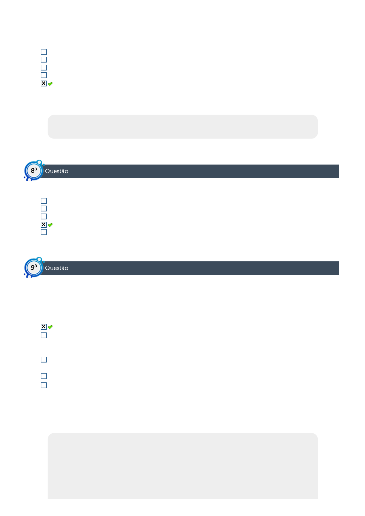 17/06/2021 Estácio: Alunos https://simulado.estacio.br/alunos/ 4/5 V - sempre envolve um vendedor e muitos compradores potenciais e tanto os consumidores individuais quanto os empresariais podem usar o mesmo marketplace do lado da venda Assinale a alterativa correta: Itens I, III, IV e V Itens I, IV e V Itens I, II e V Itens I, II e III Itens I, II, III, IV e V Respondido em 17/06/2021 22:28:25 Explicação: Todas as alternativas estão corretas Acerto: 1,0 / 1,0 Em relação a um Sistema de Processamento e Transação podemos afirmar: Processamento de informações estratégicas nas organizações Tem como objetivo o apoio ao gerenciamento e controle nas organizações Nda Tem como objetivo o apoio aos processos operacionais nas organizações Não requer prototipagem na implantação Respondido em 17/06/2021 21:35:15 Acerto: 1,0 / 1,0 Uma das linguagens mais utilizadas no Comércio Eletrônico é a linguagem JAVA. Isso aconteceu principalmente em função da sua portabilidade, ou seja, o compilador Java não gera instruções específicas a uma plataforma. Como se dá o fluxo no processo de compilação e execução da linguagem Java? O processo segue o seguinte fluxo: Compilação, Bytecode, JVM e Processador. O processador gera um programa em um código intermediário, denominado bytecode, que pode ser descrito como uma linguagem de máquina destinada a um processador virtual. O processo segue o seguinte fluxo: Programação, Compilação, Máquina Virtual e Processador. Programas Java sempre são carregados no computador central e nele executado. Os programas Java são transmitidos como JVM, onde podem rodar em qualquer computador apenas com uma nova compilação, independente da plataforma na qual ele será executado. Respondido em 17/06/2021 22:34:23 Explicação: Esse processo de fluxo está CORRETO porque: O compilador Java não gera instruções específicas a uma plataforma (conjunto de tecnologias de hardware e sistema operacional). Gera um programa em um código intermediário, denominado bytecode, que pode ser descrito como uma linguagem de máquina destinada a um processador virtual Questão8a Questão9a