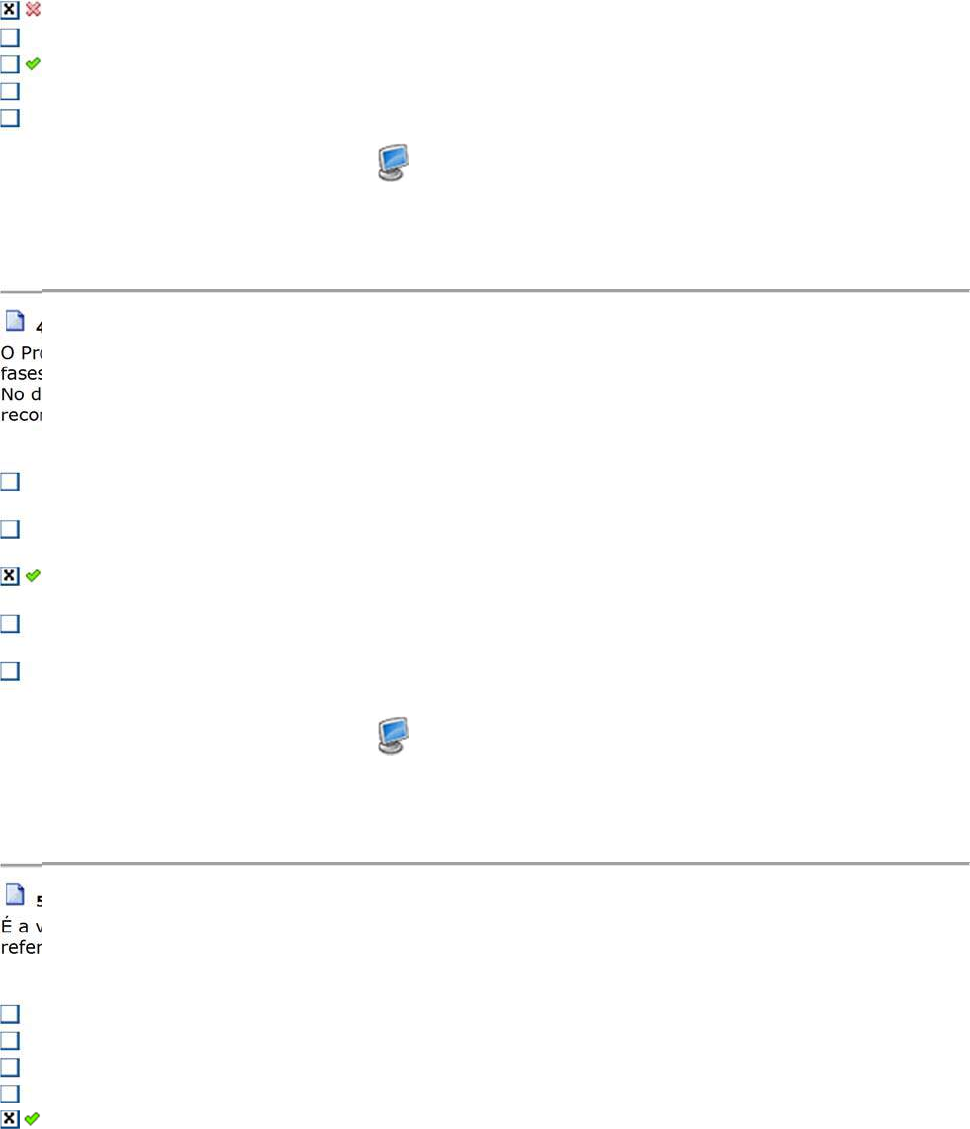 I. Código do livro. II. Encomendar livros. III. Editoras. IV. Conferir requisição. V. Resumo. II, III e IV estão corretas. III e IV estão corretas. II e IV estão corretas. I, III e IV estão corretas. I e IV estão corretas. Gabarito Comentado. 4a Questão (Ref.: 95294) Pontos: 1,0 / 1,0 O Processo Unificado divide a realização de um projeto para desenvolvimento de um sistema de software em fases. Em cada uma dessas fases, são executadas atividades de diversas disciplinas em diferentes proporções. No desenvolvimento de um sistema de software complexo, identifique a alternativa que esse processo recomenda: Entregar a primeira versão do sistema logo após a fase de transição, para evitar os problemas existentes no modelo de ciclo de vida em cascata tradicional. Ordenar os riscos envolvidos no projeto, para que os riscos menos críticos sejam considerados logo na fase de iniciação e os mais críticos nas fases finais. Usar a abordagem de desenvolvimento iterativa e incremental, para dividir as atividades em iterações em que cada iteração gera um incremento do software. Construir uma arquitetura executável ao final da fase de construção, para validar as regras do negócio e os requisitos funcionais do sistema. Criar um modelo de casos de uso durante a fase de elaboração, para documentar as regras do negócio e os requisitos não funcionais do sistema. Gabarito Comentado. 5a Questão (Ref.: 634449) Pontos: 0,5 / 0,5 É a visão que os usuários terão da solução ou do produto e a forma com que eles interagirão. Estamos nos referindo ao Desenho interno do produto de implementação local externo