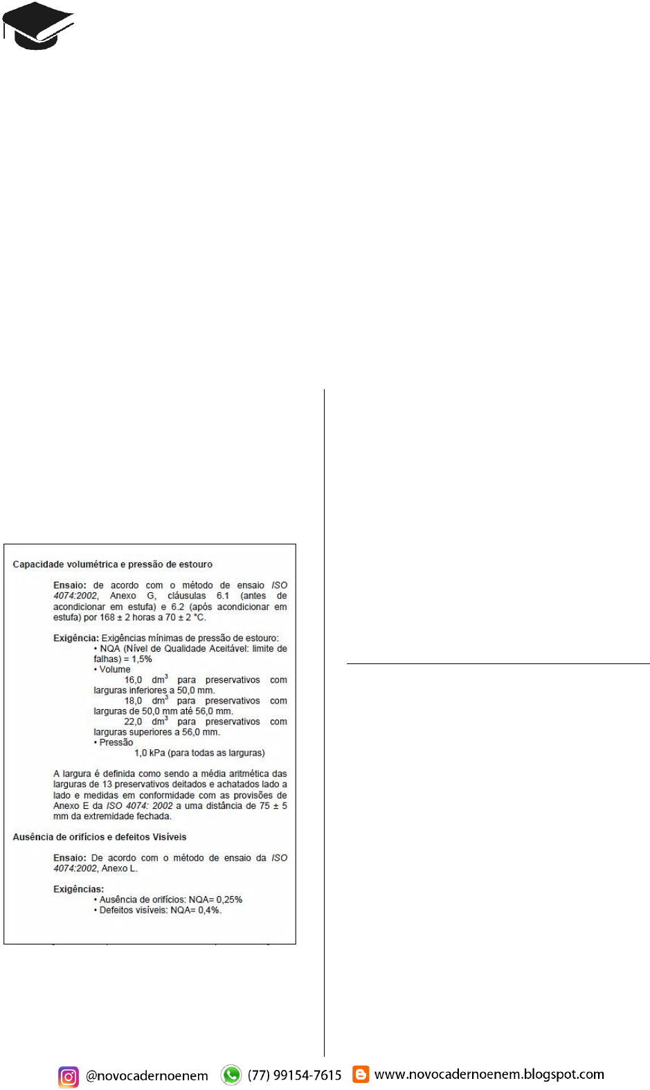 CADERNO BIOLOGIA ENEM 2009 a 2018 23 1. Nas primeiras quatro semanas, os indivíduos comeram alimentos comuns. 2. Da 4ª à 8ª semana, o suprimento de carboidrato foi apenas glicose. 3. Da 8ª à 12ª semana, a fonte de carboidrato foi mista; com 75% de glicose e 25% de sacarose. 4. Após a 12ª semana, a fonte de carboidrato voltou a ser glicose (como na fase 2). O gráfico apresentado no início da questão mostra os resultados obtidos nesse experimento, em termos de taxa de colesterol no sangue (em mg/dL) ao longo de 19 semanas. (PAULING, L. Como viver mais e melhor. 8Ed. Cristiane Perez Ribeiro. São Paulo: Best Seller, 1988, p. 72) Do experimento descrito, é correto concluir que o nível de colesterol no sangue pode ser diminuído com a redução da ingestão de: A) glicose. B) carboidratos. C) aminoácidos. D) açúcar comum. E) gorduras essenciais. Questão 67 (2009.3) O uso constante e correto do preservativo é essencial para se alcançar o nível de proteção necessária para evitar a gravidez indesejada e a transmissão de HIV. Um outro fator vital para isso é a qualidade do produto. A seguir, encon- tram-se especificações de testes a serem reali- zados em preservativos recomendadas pela Organização Mundial de Saúde (OMS). (Organização Mundial da Saúde. O Preservativo Masculino de Látex : especificações e diretrizes na aquisição de preservativos. WHO. Suíça, 2003) Considerando-se as orientações da OMS mos- tradas no quadro acima, um lote de preservati- vos deve ser avaliado: A) quanto à possibilidade de ocorrência de eventuais orifícios, com apenas um ensaio para a capacidade volumétrica e pressão de estouro. B) quanto à pressão mínima de estouro, que deve ser a mesma para todos os exemplares, e quanto à largura, que deve ser de 75 ± 5 mm. C) quanto ao volume de estouro, sendo que nenhum modelo deve ultrapassar 22,0 dm3, pois assim, ultrapassaria a pressão de 1 kPa. D) quanto à ocorrência de orifícios, sendo que o lote deve conter menos de 0,25% de exempla- res com orifícios. E) quanto à largura do modelo, caso em que devem ser medidos 13 exemplares à temperatu- ra de 70 ± 2 °C. Questão 68 (2009.3) A ideia de que uma pequena população de célu- las tronco malignas pode causar câncer não é exatamente nova. As primeiras pesquisas com células-tronco, nas décadas de 50 e 60 do sécu- lo passado, tiveram início justamente em tumo- res. (CLARK, M. F.; BECKER, M. W. O potencial maligno das células-tronco. Scientific American. Ano 5, no 51, 2006, p-39-46) As células capazes de gerarem tumores se pa- recem com as células-tronco em vários aspec- tos. Entre esses aspectos, inclui-se a capacida- de de: A) alta especialização. B) matar as células vitais circundantes. C) originar vários outros tipos de tecido. D) proliferação lenta, o que está relacionado à longevidade da célula. E) proliferação agressiva, que faz com que in- vadam outros tecidos distantes do órgão origi- nal.