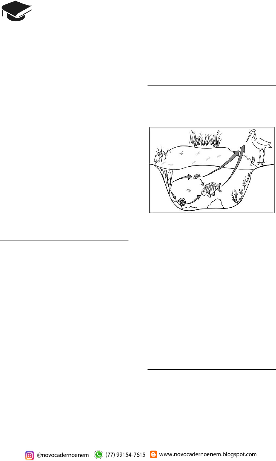 CADERNO BIOLOGIA ENEM 2009 a 2018 31 Questão 91 (2010.2) Um agricultor, buscando o aumento da produti- vidade de sua lavoura, utilizou o adubo NPK (nitrogênio, fósforo e potássio) com alto teor de sais minerais. A irrigação dessa lavoura é feita por canais que são desviados de um rio próximo dela. Após algum tempo, notou-se uma grande mortandade de peixes no rio que abastece os canais, devido à contaminação das águas pelo excesso de adubo usado pelo agricultor. Que processo biológico pode ter sido provocado na água do rio pelo uso do adubo NPK? A) Lixiviação, processo em que ocorre a lava- gem do solo, que acaba disponibilizando os nutrientes para a água do rio. B) Acidificação, processo em que os sais, ao se dissolverem na água do rio, formam ácidos. C) Eutrofização, ocasionada pelo aumento de fósforo e de nitrogênio dissolvidos na água, que resulta na proliferação do fitoplâncton. D) Aquecimento, decorrente do aumento de sais dissolvidos na água do rio, que eleva sua tem- peratura. E) Denitrificação, processo em que o excesso de nitrogênio que chega ao rio é disponibilizado para a atmosfera, prejudicando o desenvolvi- mento dos peixes. Questão 92 (2010.2) A Síndrome da Imunodeficiência Adquirida (AIDS) é a manifestação clínica da infecção pelo vírus HIV, que leva, em média, oito anos para se manifestar. No Brasil, desde a identificação do primeiro caso de AIDS em 1980 até junho de 2007, já foram identificados cerca de 474 mil casos da doença. O país acumulou, aproxima- damente, 192 mil óbitos devido à AIDS até ju- nho de 2006, sendo as taxas de mortalidade crescentes até meados da década de 1990 e estabilizando-se em cerca de 11 mil óbitos anu- ais desde 1998. […] A partir do ano 2000, essa taxa se estabilizou em cerca de 6,4 óbitos por 100 mil habitantes, sendo esta estabilização mais evidente em São Paulo e no Distrito Fede- ral. (Disponível em: http://www.aids.gov.br. Acesso em: 01 maio 2009 - adaptado) A redução nas taxas de mortalidade devido à AIDS a partir da década de 1990 é decorrente: A) do aumento do uso de preservativos nas relações sexuais, que torna o vírus HIV menos letal. B) da melhoria das condições alimentares dos soropositivos, a qual fortalece o sistema imuno- lógico deles. C) do desenvolvimento de drogas que permitem diferentes formas de ação contra o vírus HIV. D) das melhorias sanitárias implementadas nos últimos 30 anos, principalmente nas grandes capitais. E) das campanhas que estimulam a vacinação contra o vírus e a busca pelos serviços de saú- de. Questão 93 (2010.2) A figura representa uma cadeia alimentar em uma lagoa. As setas indicam o sentido do fluxo de energia entre os componentes dos níveis tróficos. Sabendo-se que o mercúrio se acumula nos tecidos vivos, que componente dessa cadeia alimentar apresentará maior teor de mercúrio no organismo se nessa lagoa ocorrer um derra- mamento desse metal? A) As aves, pois são os predadores do topo dessa cadeia e acumulam mercúrio incorporado pelos componentes dos demais elos. B) Os caramujos, pois se alimentam das raízes das plantas, que acumulam maior quantidade de metal. C) Os grandes peixes, pois acumulam o mercú- rio presente nas plantas e nos peixes pequenos. D) Os pequenos peixes, pois acumulam maior quantidade de mercúrio, já que se alimentam das plantas contaminadas. E) As plantas aquáticas, pois absorvem grande quantidade de mercúrio da água através de suas raízes e folhas. Questão 94 (2010.2) Segundo Jeffrey M. Smith, pesquisador de um laboratório que faz análises de organismos ge- neticamente modificados, após a introdução da soja transgênica no Reino Unido, aumentaram em 50% os casos de alergias. “O gene que é colocado na soja cria uma proteína nova que até então não existia na alimentação humana, a qual poderia ser potencialmente alergênica”, explica o pesquisador. (Correio do Estado/MS. 19 abr. 2004 - adaptado)
