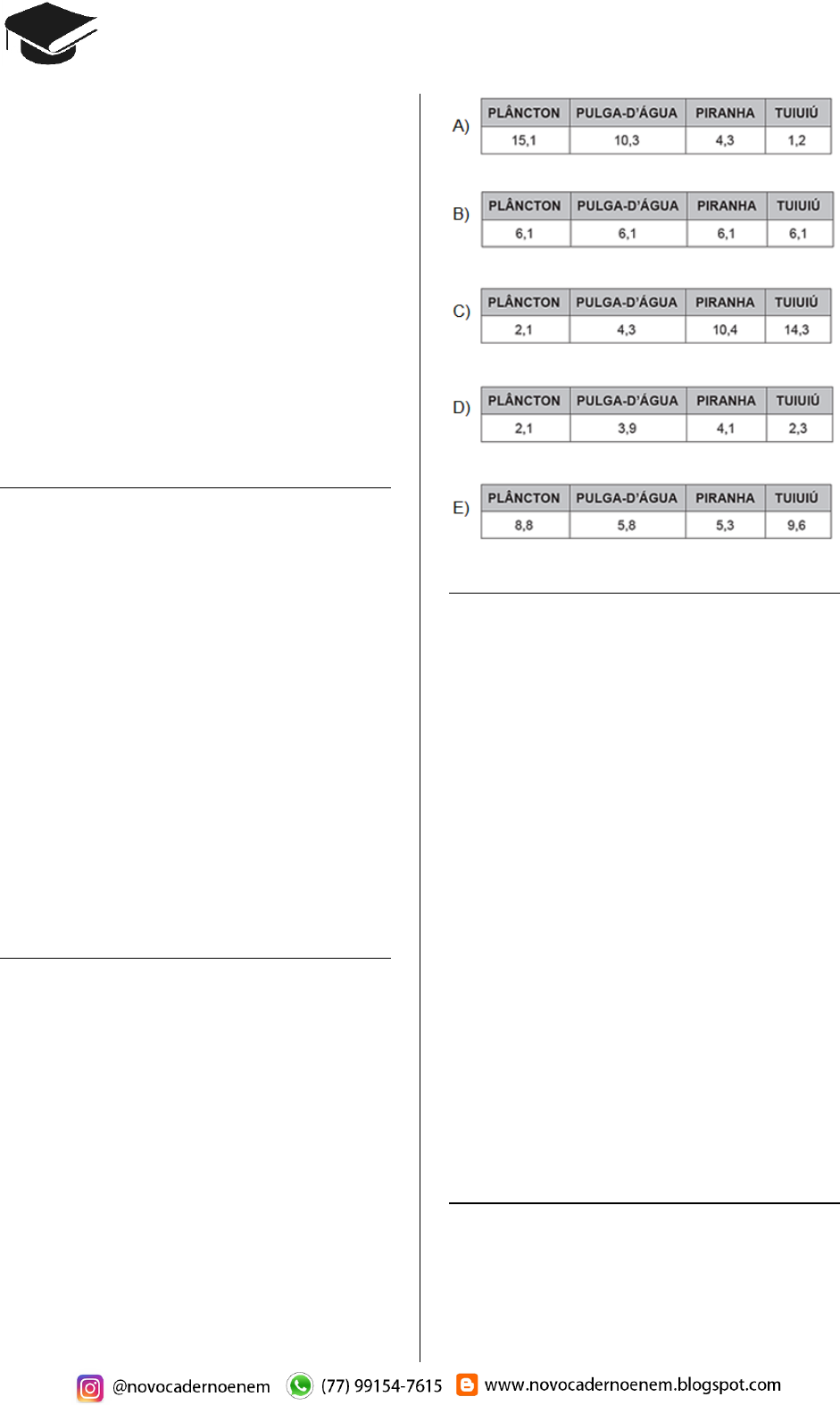 CADERNO BIOLOGIA ENEM 2009 a 2018 91 Quando essa bactéria é introduzida no A. ae- gypti, atua como uma “vacina”. estimulando o sistema imunológico e bloqueando a multiplica- ção do vírus dentro do inseto. (Disponível em: http://portalsaude.saude.gov.br. Acesso em: 20 dez 2012 - adaptado) Qual o conceito fundamental relacionado a essa estratégia? A) Clonagem. B) Mutualismo. C) Parasitismo. D) Transgênese. E) Controle biológico. Questão 324 (2016.2) Darwin, em viagem às ilhas Galápagos, obser- vou que os tentilhões apresentavam bicos com formatos diferentes em cada ilha, de acordo com o tipo de alimentação disponível. Lamarck, ao explicar que o pescoço da girafa teria estica- do para colher folhas e frutos no alto das árvo- res, elaborou ideias importantes sobre a evolu- ção dos seres vivos. O texto aponta que uma ideia comum às teorias da evolução, propostas por Darwin e por La- marck, refere-se à interação entre os organis- mos e seus ambientes, que é denominada de: A) mutação. B) adaptação. C) seleção natural. D) recombinação gênica. E) variabilidade genética. Questão 325 (2016.2) Suponha que um pesticida lipossolúvel que se acumula no organismo após ser ingerido tenha sido utilizado durante anos na região do Panta- nal, ambiente que tem uma de suas cadeias alimentares representadas no esquema: PLÂNCTON → PULGA-D’ÁGUA → LAMBARI → PIRANHA → TUIUIÚ Um pesquisador avaliou a concentração do pesticida nos tecidos de lambaris da região e obteve um resultado de 6,1 partes por milhão (ppm). Qual será o resultado compatível com a concen- tração do pesticida (em ppm) nos tecidos dos outros componentes da cadeia alimentar? Questão 326 (2016.2) Companheira viajante Suavemente revelada? Bem no interior de nos- sas células, uma clandestina e estranha alma existe. Silenciosamente, ela trama e aparece cumprindo seus afazeres domésticos cotidianos, descobrindo seu nicho especial em nossa fogo- sa cozinha metabólica, mantendo entropia em apuros, em ciclos variáveis noturnos e diurnos. Contudo, raramente ela nos acende, apesar de sua fornalha consumi-la. Sua origem? Microbia- na, supomos. Julga-se adapta da às células eucariontes, considerando-se como escrava – uma serva a serviço de nossa verdadeira evolu- ção. (McMURRAY, W. C. The traveler. Trends In Blochcmical Sciences, 1994 - adaptado) A organela celular descrita de forma poética no texto e o(a): A) centríolo. B) lisossomo. C) mitocôndria. D) complexo golgiense. E) retículo endoplasmático liso. Questão 327 (2016.3) Um pesquisador preparou um fragmento do caule de uma flor de margarida para que pudes- se ser observado em microscopia óptica. Também preparou um fragmento de pele de rato com a mesma finalidade. Infelizmente, após algum descuido, as amostras forma misturadas.