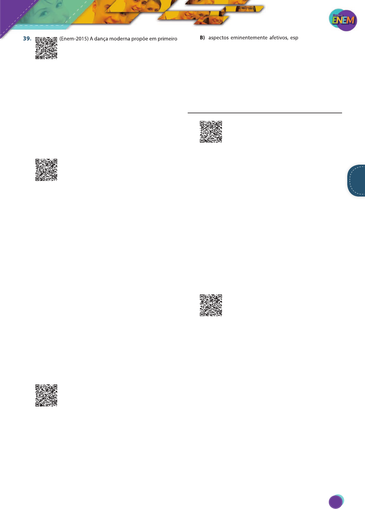39. (Enem-2015) A dança moderna propõe em primeiro lugar o conhecimento de si e o autodomínio. Minha proposta é esta: através do conhecimento e do auto- domínio chego à forma, à minha forma – e não o contrário. É uma inversão que muda toda a estética, toda a razão do movimento. A técnica na dança tem apenas uma finalidade: preparar o corpo para responder à exigência do espírito artístico. (VIANNA, K.; CARVALHO, M. A. A dança. São Paulo: Siciliano, 1990.) Na abordagem dos autores, a técnica, o autodomínio e o conhe- cimento do bailarino estão a serviço da A) padronização do movimento da dança. B) subordinação do corpo a um padrão. C) concretização da criação pessoal. D) ideia preconcebida de forma. E) busca pela igualdade entre os bailarinos. 40. (Enem-2013) Própria dos festejos juninos, a quadrilha nasceu como dança aristocrática, oriunda dos salões franceses, depois difundida por toda a Europa. No Brasil foi introduzida como dança de salão e, por sua vez, apropriada e adaptada pelo gosto popular. Para sua ocorrência, é importante a presença de um mestre “marcante” ou “marcador”, pois é quem determina as figurações diversas que os dançadores desenvolvem. Observa-se a constância das seguintes marcações: “Tour”, “Em avant”, “Chez des dames” , “Chez des Chevaliê” , “Cestinha de flor”, “Balancê”, “Caminho da roça”, “olha a chuva”, “Garranchê” “Passeio”, “Coroa de flores”, “Coroa de espinhos” etc. No Rio de Janeiro, em contexto urbano, apresenta trans- formações: surgem novas figurações, o Francês aportuguesado inexiste, o uso de gravações substitui a música ao vivo, além do aspecto de competição, que sustenta os festivais de quadrilha, promovidos por órgãos de turismo. (CASCUDO, L. C. Dicionário do folclore brasileiro, Rio de Janeiro: Melhoramentos, 1976.) As diversas formas de dança são demonstrações da diversidade cultural do nosso país. Entre elas, a quadrilha é considerada uma dança folclórica por A) possuir como característica principal os atributos divinos e religiosos e, por isso, identificar uma nação ou região. B) abordar as tradições e costumes de determinados povos ou regiões distintas de uma mesma nação. C) apresentar cunho artístico e técnica apuradas, sendo, tam- bém, considerada dança-espetáculo. D) necessitar de vestuário específico para a sua prática, o qual define seu país de origem. E) acontecer em salões e festas e ser influenciada por diversos gêneros musicais. 41. (Enem-2011) A dança é um importante componente cultural da humanidade. O folclore brasileiro é rico em danças que representam as tradições e a cultura de várias regiões do país. Estão ligadas aos aspectos religiosos, festas, lendas, fatos históricos, acontecimentos do cotidiano e brincadeiras e caracterizam-se pelas músicas ani- madas (com letras simples e populares), figurinos e cenários representativos. (SECRETARIA DA EDUCAÇÃO. Proposta Curricular do Estado de São Paulo: Educação Física. São Paulo: 2009. Adaptado.) A dança, como manifestação e representação da cultura rítmica, envolve a expressão corporal própria de um povo. Considerando-a como elemento folclórico, a dança revela A) manifestações afetivas, históricas, ideológicas, intelectuais e espirituais de um povo, refletindo seu modo de expres- sar-se no mundo. B) aspectos eminentemente afetivos, espirituais e de entre- tenimento de um povo, desconsiderando fatos históricos. C) acontecimentos do cotidiano, sob influência mitológica e religiosa de cada região, sobrepondo aspectos políticos. D) tradições culturais de cada região, cujas manifestações rít- micas são classificadas em um ranking das mais originais. E) lendas, que se sustentam em inverdades históricas, uma vez que são inventadas, e servem apenas para a vivência lúdica de um povo. Teatro 42. (Enem-2017) E aqui, antes de continuar este espetá- culo, é necessário que façamos uma advertência a todos e a cada um. Neste momento, achamos funda- mental que cada um tome posição definida, não é possível continuamos. É fundamental que cada um tome uma posição, seja para a esquerda, seja para a direita. Admitimos mesmo que alguns tomem uma posição neutra, fiquem de braços cruzados. Mas é preciso que cada um, uma vez tomada sua posição, fique nela! Porque senão, companheiros, as cadeiras do teatro rangem muito e ninguém ouve nada. (FERNANDES, M.; RANGEL, F. Liberdade, liberdade. Porto Alegre: L&PM, 2009.) A peça Liberdade, liberdade, encenada em 1964, apresenta o impasse vivido pela sociedade brasileira em face do regime vigente. Esse impasse é representado no fragmento pelo(a) A) barulho excessivo produzido pelo ranger das cadeiras do teatro. B) indicação da neutralidade como a melhor opção ideológi- ca naquele momento. C) constatação da censura em função do engajamento social do texto dramático. D) correlação entre o alinhamento político e a posição corpo- ral dos espectadores. E) interrupção do espetáculo em virtude do comportamento inadequado do público. 43. (Enem-2015) Um relacionamento de grupo saudável exige um número de indivíduos trabalhando inter- dependentemente para completar um projeto, com total participação individual e contribuição pessoal. Se uma pessoa domina, os outros membros têm pouco cresci- mento ou prazer na atividade, não existe um verdadeiro rela- cionamento no grupo. O teatro é uma atividade artística que exige o talento e a energia de muitas pessoas – desde a primeira ideia de uma peça ou cena até o último eco de aplauso. Sem esta interação não há lugar para o ator individualmente, pois sem o funcionamento do grupo, para quem iria ele representar, que materiais usaria e que efeitos poderia produzir? O aluno-ator deve aprender que “como atuar”, assim como no jogo, está in- trinsecamente ligado a todas as outras 