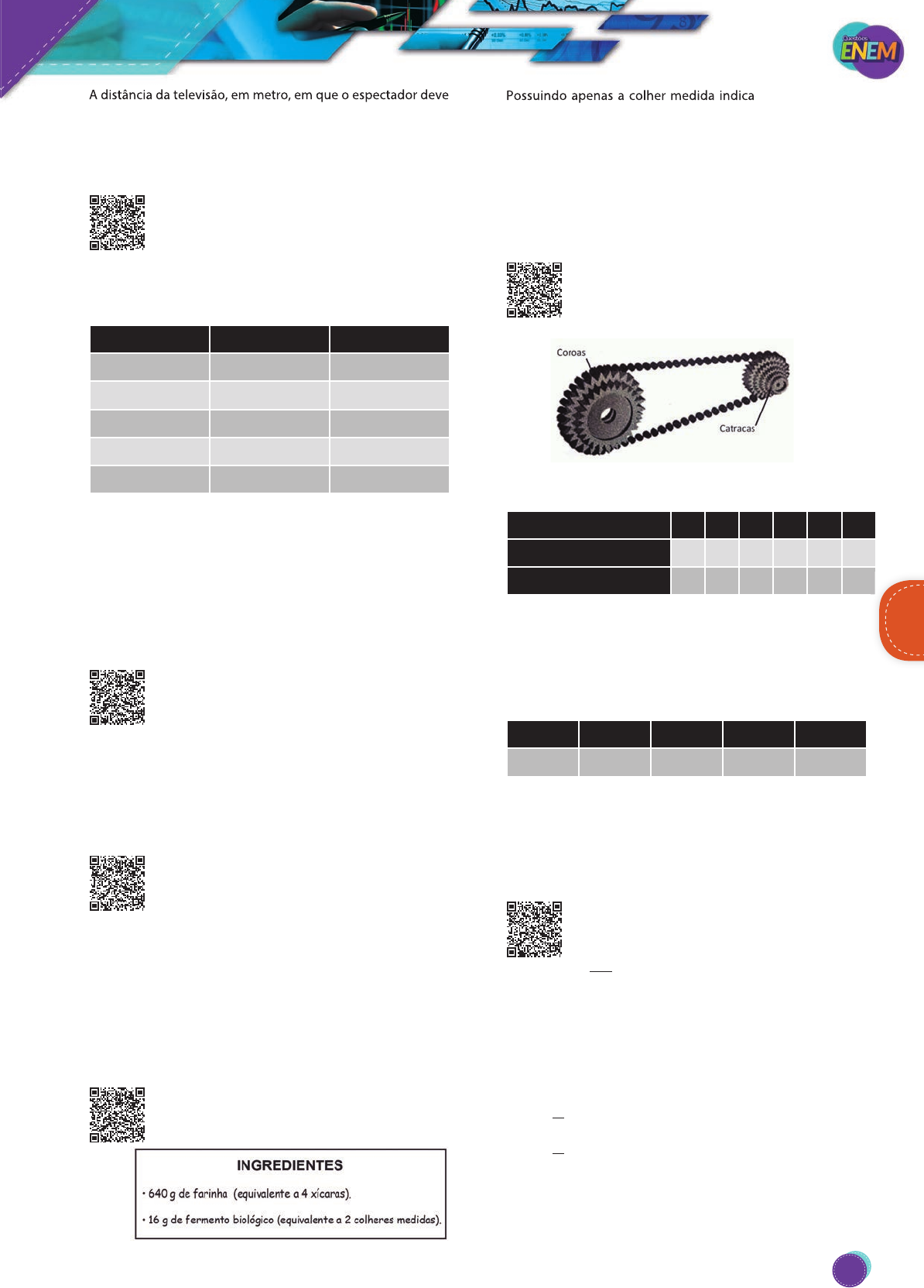 A distância da televisão, em metro, em que o espectador deve se posicionar para que tenha conforto visual é mais próxima de A) 0,33. B) 0,96. C) 1,57. D) 3,37. E) 3,60. 50. (Enem-2017) Numa tarefa escolar, um aluno precisava fazer a planta baixa de sua casa em uma escala de 1:40. Ele verificou que a base da sua casa era retan- gular, tendo 12 metros de comprimento e 8 metros de largura. O aluno foi a uma papelaria e lá observou que havia cinco tipos de folhas de papel, todas com diferentes dimensões. O quadro contém os cinco tipos de folhas, com seus compri- mentos e larguras fornecidos em centímetro. Folha de papel Comprimento Largura Tipo I 16 12 Tipo II 30 20 Tipo III 32 22 Tipo IV 34 24 Tipo V 48 32 O aluno analisou os cinco tipos de folha e comprou a que pos- suía as dimensões mínimas necessárias para que ele fizesse a planta de sua casa na escala desejada, deixando exatamente 2 centímetros de margem em cada um dos quatro lados da folha. A folha escolhida pelo aluno foi a de tipo A) I. B) II. C) III. D) IV. E) V. 51. (Enem-2017) Uma equipe de ambientalistas apresen- tou um mapa de uma reserva ambiental em que faltava a especificação da escala utilizada para a sua confecção. O problema foi resolvido, pois um dos integrantes da equipe lembrava-se de que a distância real de 72 km, percorrida na reserva, equivalia a 3,6 cm no mapa. Qual foi a escala utilizada na confecção do mapa? A) 1:20. B) 1:2 000. C) 1:20 000. D) 1:200 000. E) 1:2 000 000. 52. (Enem-2017) O governo decidiu reduzir de 25% para 20% o teor de álcool anidro misturado à gasolina vendida nos postos do país. Considere que a média de desempenho, ou seja, a quantidade de quilôme- tros (km) que um carro anda com 1 litro de combustível, é dire- tamente proporcional à porcentagem de gasolina presente no combustível, e que a média de desempenho de um carro antes da decisão do governo era de 13,5 km/L. Nas condições do texto, qual será a estimativa da média de desempenho após a redução de álcool anidro no combustível? A) 10,80 km/L B) 12,65 km/L C) 12,82 km/L D) 14,15 km/L E) 14,40 km/L 53. (Enem-2017) Em uma embalagem de farinha encon- tra-se a receita de um bolo, sendo parte dela repro- duzida a seguir: Possuindo apenas a colher medida indicada na receita, uma dona de casa teve que fazer algumas conversões para poder medir com precisão a farinha. Considere que a farinha e o fer- mento possuem densidades iguais. Cada xícara indicada na receita é equivalente a quantas colheres de medidas? A) 10 B) 20 C) 40 D) 80 E) 320 54. (Enem-2017) Uma bicicleta do tipo mountain bike tem uma coroa com 3 engrenagens e uma catraca com 6 engrenagens, que, combinadas entre si, determinam 18 marchas (número de engrenagens da coroa vezes o número de engrenagens da catraca). Os números de dentes das engrenagens das coroas e das catra- cas dessa bicicleta estão listados no quadro. Engrenagens 1ª 2ª 3ª 4ª 5ª 6ª Nº de dentes da coroa 46 36 26 - - - Nº de dentes da catraca 24 22 20 18 16 14 Sabe-se que o número de voltas efetuadas pela roda traseira a cada pedalada é calculado dividindo-se a quantidade de dentes da coroa pela quantidade de dentes da catraca. Durante um passeio em uma bicicleta desse tipo, deseja-se fazer um percurso o mais devagar possível, escolhendo, para isso, uma das seguintes combinações de engrenagens (coroa x catraca): I II III IV V 1ª × 1ª 1ª × 6ª 2ª × 4ª 3ª × 1ª 3ª × 6ª A combinação escolhida para realizar esse passeio da forma desejada é A) I. B) II. C) III. D) IV. E) V. 55. (Enem-2017) O estado de qualquer substância gasosa é determinado pela medida de três grandezas: o volume (V), a pressão (P) e a temperatura (T) dessa substância. Para os chamados gases “ideais” o valor do quociente P V T ⋅ é sempre constante. Considere um reservatório que está cheio de um gás ideal. Sem vazar o gás, realiza-se uma compressão do reservatório, reduzin- do seu volume à metade. Ao mesmo tempo, uma fonte de calor faz a temperatura do gás ser quadruplicada. Considere P0 e P1 respectivamente, os valores da pressão do gás no reservatório, antes e depois do procedimento descrito. A relação entre P0 e P1 é A) P P 1 0 8 = B) P P 1 0 2 = C) P P1 0= D) P P1 02= E) P P1 08= A distância da televisão, em metro, em que o espectador deve Possuindo apenas a colher medida indicada na receita, uma MatemáticaMatemática MatemáticaMatemática 163 PG18EA445SD00_QE_2018_MIOLO.indb 163 26/02/2018 16:43:07