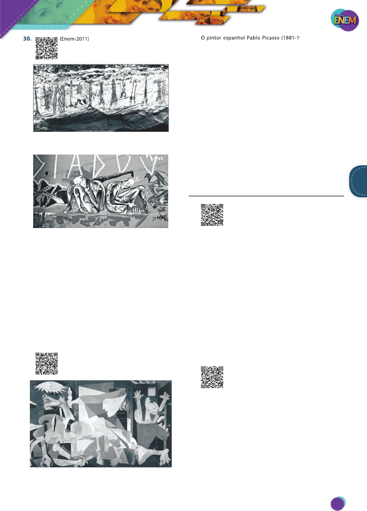 30. (Enem-2011) Texto I Toca do Salitre – Piauí (Disponível em: . Acesso em: 27 jul. 2010.) Texto II Arte Urbana. Foto: Diego Singh (Disponível em: . Acesso em: 27 jul. 2010.) O grafite contemporâneo, considerado em alguns momentos como uma arte marginal, tem sido comparado às pinturas murais de várias épocas e às escritas pré-históricas. Observando as imagens apresen- tadas, é possível reconhecer elementos comuns entre os tipos de pinturas murais, tais como A) a preferência por tintas naturais, em razão de seu efeito estético. B) a inovação na técnica de pintura, rompendo com modelos estabelecidos. C) o registro do pensamento e das crenças das sociedades em várias épocas. D) a repetição dos temas e a restrição de uso pelas classes dominantes. E) o uso exclusivista da arte para atender aos interesses da elite. 31. (Enem-2011) PICASSO, P. Guernica. Óleo sobre tela. Museu Reina So� a, Espanha, 1937. (Disponível em: . Acesso em: 26 jul. 2010.) O pintor espanhol Pablo Picasso (1881-1973), um dos mais valorizados no mundo artístico, tanto em termos financeiros quanto históricos, criou a obra Guernica em protesto ao ataque aéreo à pequena cidade basca de mesmo nome. A obra, feita para integrar o Salão Internacional de Artes Plásticas de Paris, percorreu toda a Europa, chegando aos EUA e instalando-se no MoMA, de onde sairia apenas em 1981. Essa obra cubista apresenta elementos plásticos identificados pelo A) painel ideográfico, monocromático, que enfoca várias di- mensões de um evento, renunciando à realidade, colocan- do-se em plano frontal ao espectador. B) horror da guerra de forma fotográfica, com o uso da pers- pectiva clássica, envolvendo o espectador nesse exemplo brutal de crueldade do ser humano. C) uso das formas geométricas no mesmo plano, sem emoção e expressão, despreocupado com o volume, a perspectiva e a sensação escultórica. D) esfacelamento dos objetos abordados na mesma narrativa, minimizando a dor humana a serviço da objetividade, ob- servada pelo uso do claro-escuro. E) uso de vários ícones que representam personagens frag- mentados bidimensionalmente, de forma fotográfica livre de sentimentalismo. Música 32. (Enem-2016) O hip hop tem filosofia própria, com valores construídos pela condição das experiências vividas nas periferias de muitas cidades. Colocando- -se como um contraponto à miséria, às drogas, ao crime e à violência, o hip hop busca interpretar a realidade social. Seu objetivo é justamente encontrar saídas e fornecer uma al- ternativa à população excluída. (SOUZA, J.; FIALHO, V. M.; ARALDI, J. Hip hop: da rua para a escola. Porto Alegre: Sulina, 2008.) As autoras abordam no texto um movimento cultural que tam- bém tem características reconhecidas A) nos traços e formas que representam personagens de olhos desproporcionalmente maiores e expressivos, co- nhecidos como mangá. B) nas formas de se vestir e de cortar os cabelos com objeti- vos contestadores à ordem social, próprios do movimento punk. C) nas frases e dizeres de qualquer espécie, rabiscados sobre fachadas de edifícios, que marcam a pichação. D) nos movimentos leves e sincronizados com os pés que des- locam o dançarino, denominado moonwalk. E) nas declamações rápidas e ritmadas de um texto, com altu- ras aproximadas, características do rap. 33. (Enem-2015) O rap constitui-se em uma expressão artística por meio da qual os MCs relatam poetica- mente a condição social em que vivem e retratam suas experiências cotidianas. (SOUZA, J.; FIALHO, V. M.; ARALDI, J. Hip hop: da rua para a escola. Porto Alegre: Sulina, 2008.) O “relato poético” é uma característica fundamental desse gênero musical, em que A) MC canta de forma melodiosa as letras, que retratam a complexa realidade em que se encontra. B) rap se limita a usar sons eletrônicos nas músicas, que se- riam responsáveis por retratar a realidade da periferia. C) rap se caracteriza pela proximidade das notas na melodia, em que a letra é mais recitada do que cantada, como em uma poesia. D) MC canta enquanto outros músicos o acompanham com instrumentos, tais como o contrabaixo elétrico e o teclado. E) MC canta poemas amplamente conhecidos, fundamentan- do sua atuação na memorização de suas letras. 30. (Enem-2011) O pintor espanhol Pablo Picasso (1881-1973), um dos mais valorizados no mundo artístico, tanto em termos financeiros ArteArte ArteArte 141 PG18EA445SD00_QE_2018_MIOLO.indb 141 26/02/2018 16:42:47
