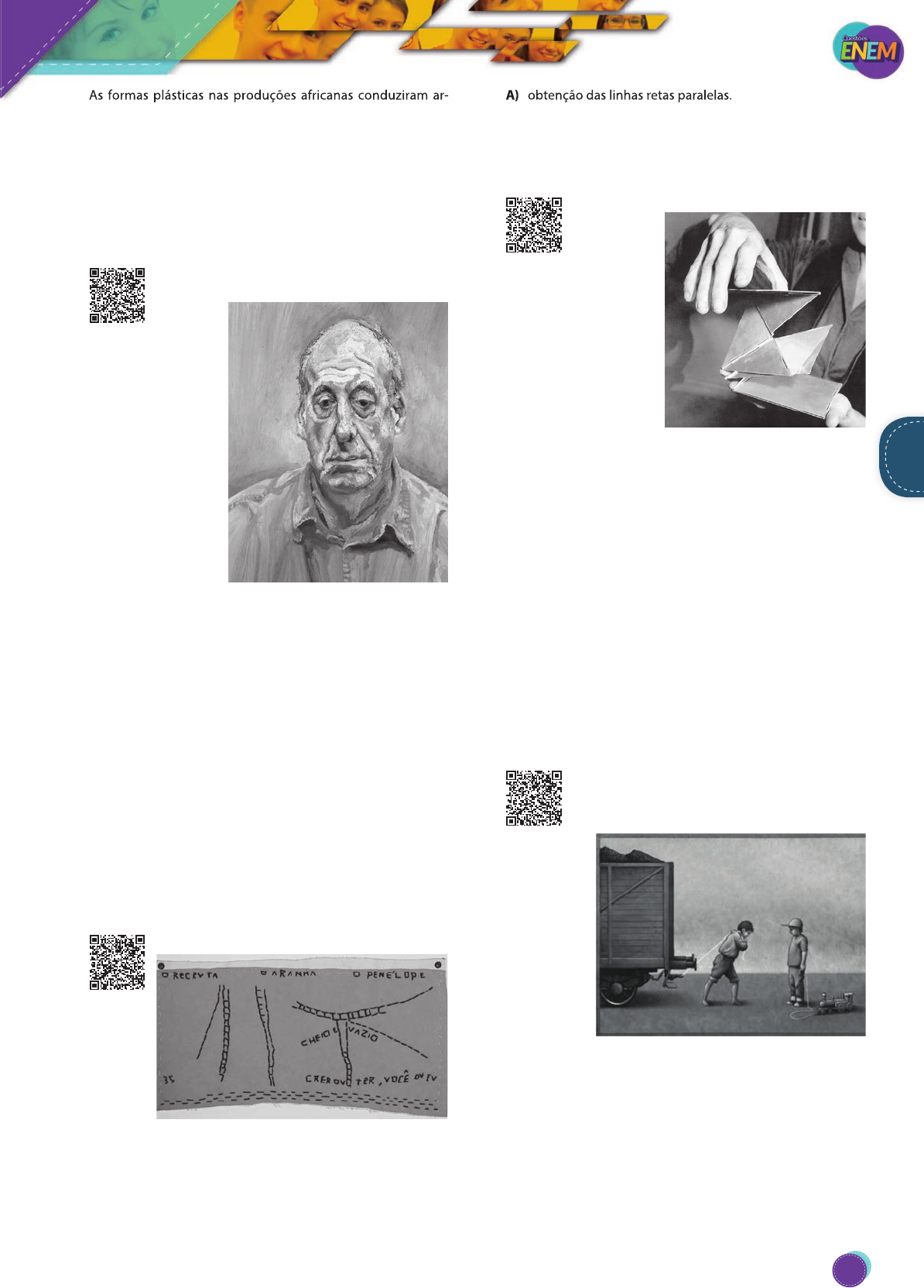 As formas plásticas nas produções africanas conduziram ar- tistas modernos do início do século XX, como Pablo Picasso, a algumas proposições artísticas denominadas vanguardas. A máscara remete à A) preservação da proporção. B) idealização do movimento. C) estruturação assimétrica. D) sintetização das formas. E) valorização estética. 22. (Enem-2015) Texto I FREUD, L. Francis Wyndham. 1993. Óleo sobre tela. 64 cm x 52 cm. Coleção pessoal. Texto II Lucian Freud é, como ele próprio gosta de relembrar às pes- soas, um biólogo. Mais propriamente, tem querido registrar verdades muito específicas sobre como é tomar posse deste determinado corpo nesta situação particular, neste específico espaço de tempo. (SMEE, S. Freud. Köln: Taschen, 2010.) Considerando a intencionalidade do artista, mencionada no Texto II, e a ruptura da arte no século XX com o parâmetro acadêmico, a obra apresentada trata do(a) A) exaltação da figura masculina. B) descrição precisa e idealizada da forma. C) arranjo simétrico e proporcional dos elementos. D) representação do padrão do belo contemporâneo. E) fidelidade à forma realista isenta do ideal de perfeição. 23. (Enem-2015) LEONILSON. O recruta, o aranha e o penélope. 1992. Borda- do sobre tecido. (Disponível em: . Acesso em: 3 ago. 2012.) A obra do artista plástico Leonilson (1953-1993) marca presença no panorama da arte brasileira e internacional. Nessa obra, ele utilizou a habilidade técnica do bordado manual para A) obtenção das linhas retas paralelas. B) valorização do tracejado retilíneo. C) exploração de diferentes texturas. D) obtenção do equilíbrio assimétrico. E) inscrição homogênea das formas e palavras. 24. (Enem-2014) CLARK, L. Bicho de bolso. Placas de metal, 1966. O objeto escultórico produzido por Lygia Clark, representante do Neoconcretismo, exemplifica o início de uma vertente importante na arte contemporânea, que amplia as funções da arte. Tendo como referência a obra Bicho de bolso, identifica-se essa vertente pelo(a) A) participação efetiva do espectador na obra, o que determi- na a proximidade entre arte e vida. B) percepção do uso de objetos cotidianos para a confecção da obra de arte, aproximando arte e realidade. C) reconhecimento do uso de técnicas artesanais na arte, o que determina a consolidação de valores culturais. D) reflexão sobre a captação artística de imagens com meios ópticos, revelando o desenvolvimento de uma linguagem própria. E) entendimento sobre o uso de métodos de produção em série para a confecção da obra de arte, o que atualiza as linguagens artísticas. 25. (Enem-2013) Kuczynskiego. P. Ilustração, 2008. (Disponível em: . Acesso em: 3 ago. 2012.) O artista gráfico polonês Pawla Kuczynskiego nasceu em 1976 e recebeu diversos prêmios por suas ilustrações. Nessa obra, ao abordar o trabalho infantil, Kuczynskiego usa sua arte para A) difundir a origem de marcantes diferenças sociais. B) estabelecer uma postura proativa da sociedade. C) provocar a reflexão sobre essa realidade. D) propor alternativas para solucionar esse problema. E) retratar como a questão é enfrentada em vários países do mundo. As formas plásticas nas produções africanas conduziram ar- A) obtenção das linhas retas paralelas. ArteArte ArteArte 139 PG18EA445SD00_QE_2018_MIOLO.indb 139 26/02/2018 16:42:44