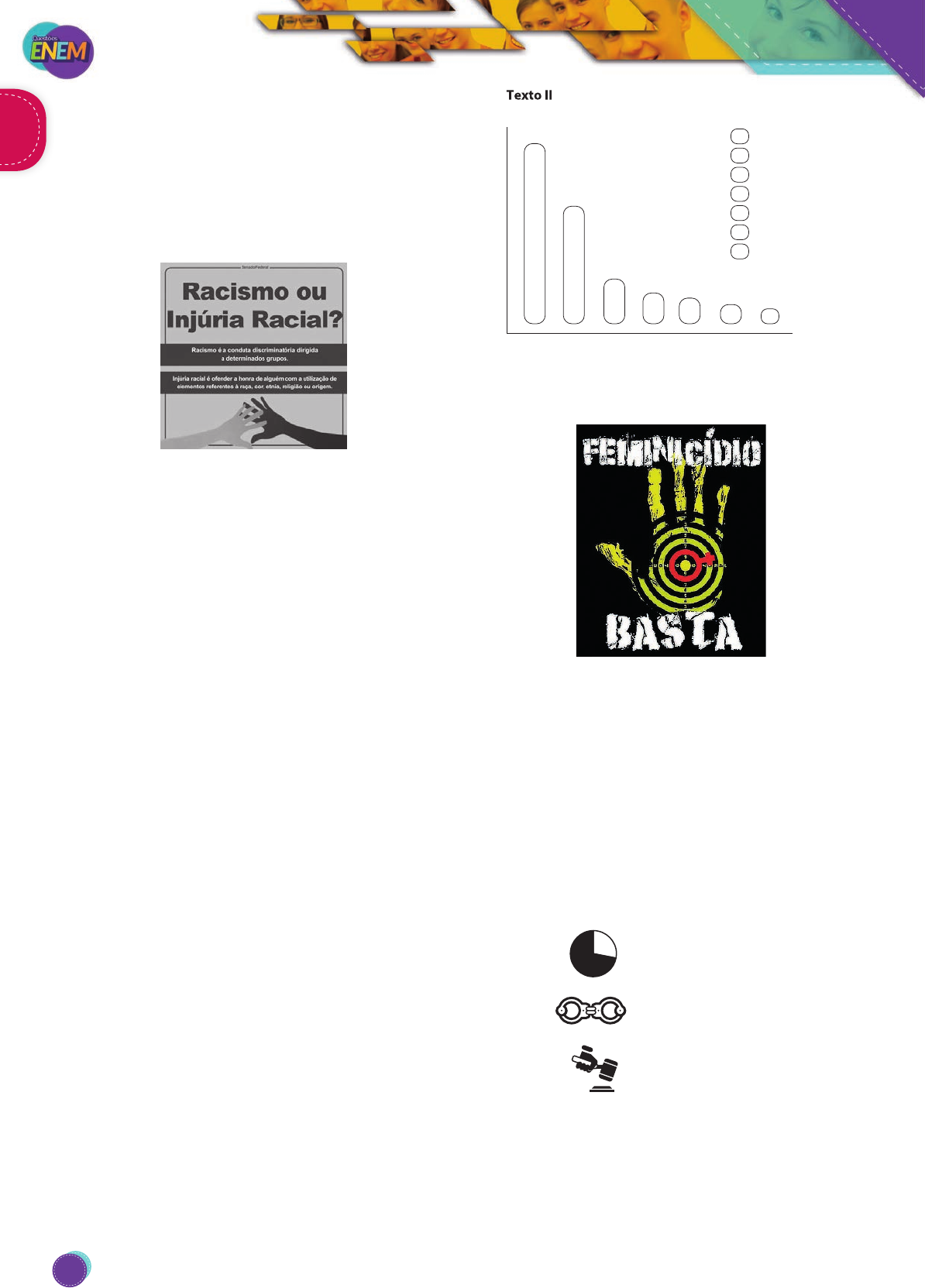 Texto II LEI N.º 7.716, DE 5 DE JANEIRO DE 1989 Define os crimes resultantes de preconceito de raça ou de cor Art. 1.º – Serão punidos, na forma desta Lei, os crimes resultantes de discriminação ou preconceito de raça, cor, etnia, religião ou procedência nacional. (Disponível em: . Acesso em: 25 maio 2016. Fragmento.) Texto III (Disponível em: . Acesso em: 25 maio 2016.) Texto IV O que são ações afirmativas Ações afirmativas são políticas públicas feitas pelo governo ou pela iniciativa privada com o objetivo de corrigir desigualdades raciais presentes na sociedade, acumuladas ao longo de anos. Uma ação afirmativa busca oferecer igualdade de oportuni- dades a todos. As ações afirmativas podem ser três tipos: com o objetivo de reverter a representação negativa; para promover igualdade de oportunidades; e para combater o preconceito e o racismo. Em 2012, o Supremo Tribunal Federal (STF) decidiu por una- nimidade que as ações afirmativas são constitucionais e políticas essenciais para a redução de desigualdades e discriminações existentes no país. No Brasil, as ações afirmativas integram uma agenda de combate à herança histórica de escravidão, segregação racial e racismo contra a população negra. (Disponível em: . Acesso em: 25 maio 2016. Fragmento.) PROPOSTA DE REDAÇÃO A partir da leitura dos textos motivadores e com base nos conhecimentos construídos ao longo de sua formação, redija texto dissertativo-argumentativo em modalidade escrita formal da língua portuguesa sobre o tema “Caminhos para combater o racismo no Brasil”, apresentando proposta de intervenção que respeite os direitos humanos. Selecione, organize e relacione, de forma coerente e coesa, argumentos e fatos para defesa de seu ponto de vista. 5. (Enem-2015 – 1.ª aplicação) A partir da leitura dos textos motiva- dores seguintes e com base nos conhecimentos construídos ao longo de sua formação, redija texto dissertativo-argumentativo em modalidade escrita formal da língua portuguesa sobre o tema “A persistência da violência contra a mulher na sociedade brasileira”, apresentando proposta de intervenção que respeite os direitos humanos. Selecione, organize e relacione, de forma coerente e coesa, argumentos e fatos para defesa de seu ponto de vista. Texto I Nos 30 anos decorridos entre 1980 e 2010 foram assassi- nadas no país acima de 92 mil mulheres, 43,7 mil só na última década. O número de mortes nesse período passou de 1 353 para 4 465, que representa um aumento de 230%, mais que triplican- do o quantitativo de mulheres vítimas de assassinato no país. (WALSELFISZ, J. J. Mapa da violência 2012. Atualização: Homicídio de mulheres no Brasil. Disponível em: . Acesso em: 8 jun. 2015.) Texto II Tipo de violência relatada 51,68% A B C D E F G A B C D E F G Violência física Violência psicológica Violência moral Violência sexual Violência patrimonial Cárcere privado Trá�co de pessoas 31,81% 9,68% 1,94%2,86% 1,76% 0,26% (BRASIL. Secretaria de Políticas para as Mulheres. Balanço 2014. Central de atendimento à mulher: Disque 180. Brasília, 2015. Disponível em: . Acesso em: 24 jun. 2015. Adaptado.) Texto III (Disponível em: . Acesso em: 24 jun. 2015. Adaptado.) Texto IV O impacto em números Com base na Lei Maria da Penha, mais de 330 mil processos foram instaurados apenas nos juizados e varas especializados 332.216 processos que envolvem a Lei Maria da Penha chegaram, entre setembro de 2006 e março de 2011, aos 52 juizados e varas especializados em Violência Doméstica e Familiar contra a Mulher existentes no País. O que resultou em: 33,4% de processos julgados 9.715 prisões em �agrante 1.577 prisões preventivas decretadas 58 mulheres e 2 777 homens enquadrados na Lei Maria da Penha estavam presos no País em dezembro de 2010. Ceará, Rio de Janeiro e Rio Grande do Sul não constam desse levantamento feito pelo Departamento Penitenciário Nacional. 237 mil relatos de violência foram feitos ao Ligue 180, serviço telefônico da Secretaria de Políticas para as Mulheres. Sete de cada dez vítimas que telefonaram para o Ligue 180 a�rmaram ter sido agredidas pelos companheiros. Língua PortuguesaLíngua Portuguesa Texto II Língua PortuguesaLíngua Portuguesa 76 Redação PG18EA445SD00_QE_2018_MIOLO.indb 76 26/02/2018 16:42:00