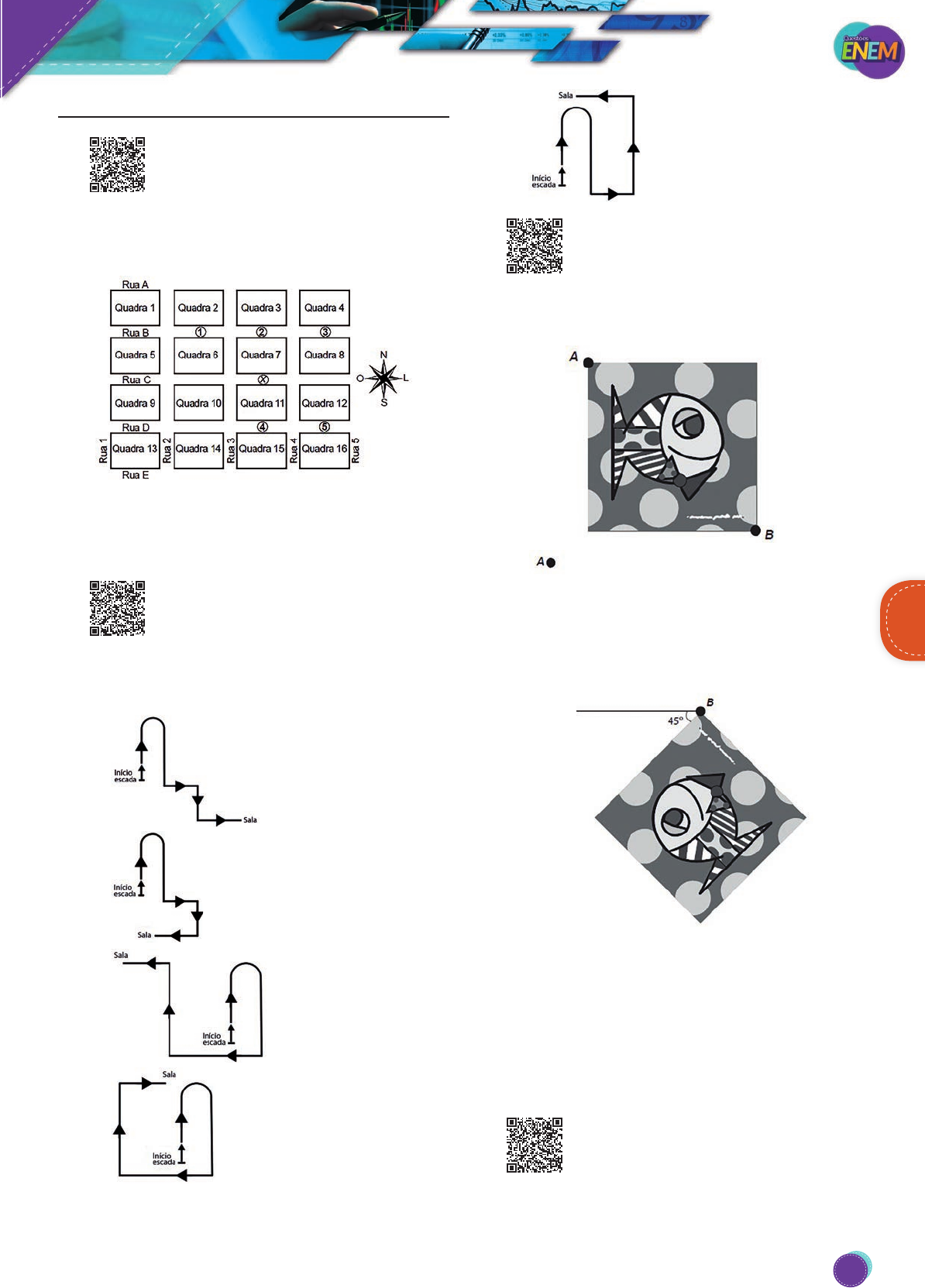 MatemáticaMatemática 217 MatemáticaMatemática Geometria plana 331. (Enem-2017) Um menino acaba de se mudar para um novo bairro e deseja ir à padaria. Pediu ajuda a um amigo que lhe forneceu um mapa com pontos nu- merados, que representam cinco locais de interesse, entre os quais está a padaria. Além disso, o amigo passou as seguintes instruções: a partir do ponto em que você se encontra, representado pela letra X, ande para oeste, vire à direita na primeira rua que encontrar, siga em frente e vire à esquerda na próxima rua. A padaria estará logo a seguir. A padaria está representada pelo ponto numerado com A) 1. B) 2. C) 3. D) 4. E) 5. 332. (Enem-2017) Uma pessoa pede informação na recep- ção de um prédio comercial de como chegar a uma sala, e recebe as seguintes instruções: suba a escada em forma de U à frente, ao final dela, vire à esquerda, siga um pouco à frente e em seguida vire à direita e siga pelo corredor. Ao final do corredor, vire à direita. Uma possível projeção vertical dessa trajetória no plano da base do prédio é A) B) C) D) E) 333. (Enem-2017) A imagem apresentada na figura é uma cópia em preto e branco da tela quadrada intitulada O peixe, de Marcos Pinto, que foi colocada em uma parede para exposição e fixada nos pontos A e B. Por um problema na fixação de um dos pontos, a tela se despren- deu, girando rente à parede. Após o giro, ela ficou posicionada como ilustrado na figura, formando um ângulo de 45° com a linha do horizonte. Para recolocar a tela na sua posição original, deve-se girá-la, rente à parede, no menor ângulo possível inferior a 360°. A forma de recolocar a tela na posição original, obedecendo ao que foi estabelecido, é girando-a em um ângulo de A) 90° no sentido horário. B) 135° no sentido horário. C) 180° no sentido anti-horário. D) 270° no sentido anti-horário. E) 315° no sentido horário. 334. (Enem-2017) Viveiros de lagostas são construídos, por cooperativas locais de pescadores, em formato de prismas reto-retângulares, fixados ao solo e com telas flexíveis de mesma altura, capazes de suportar a corrosão marinha. Para cada viveiro a ser construído, a coope- rativa utiliza integralmente 100 metros lineares dessa tela, que é usada apenas nas laterais. PG18EA445SD00_QE_2018_MIOLO.indb 217 26/02/2018 16:44:26