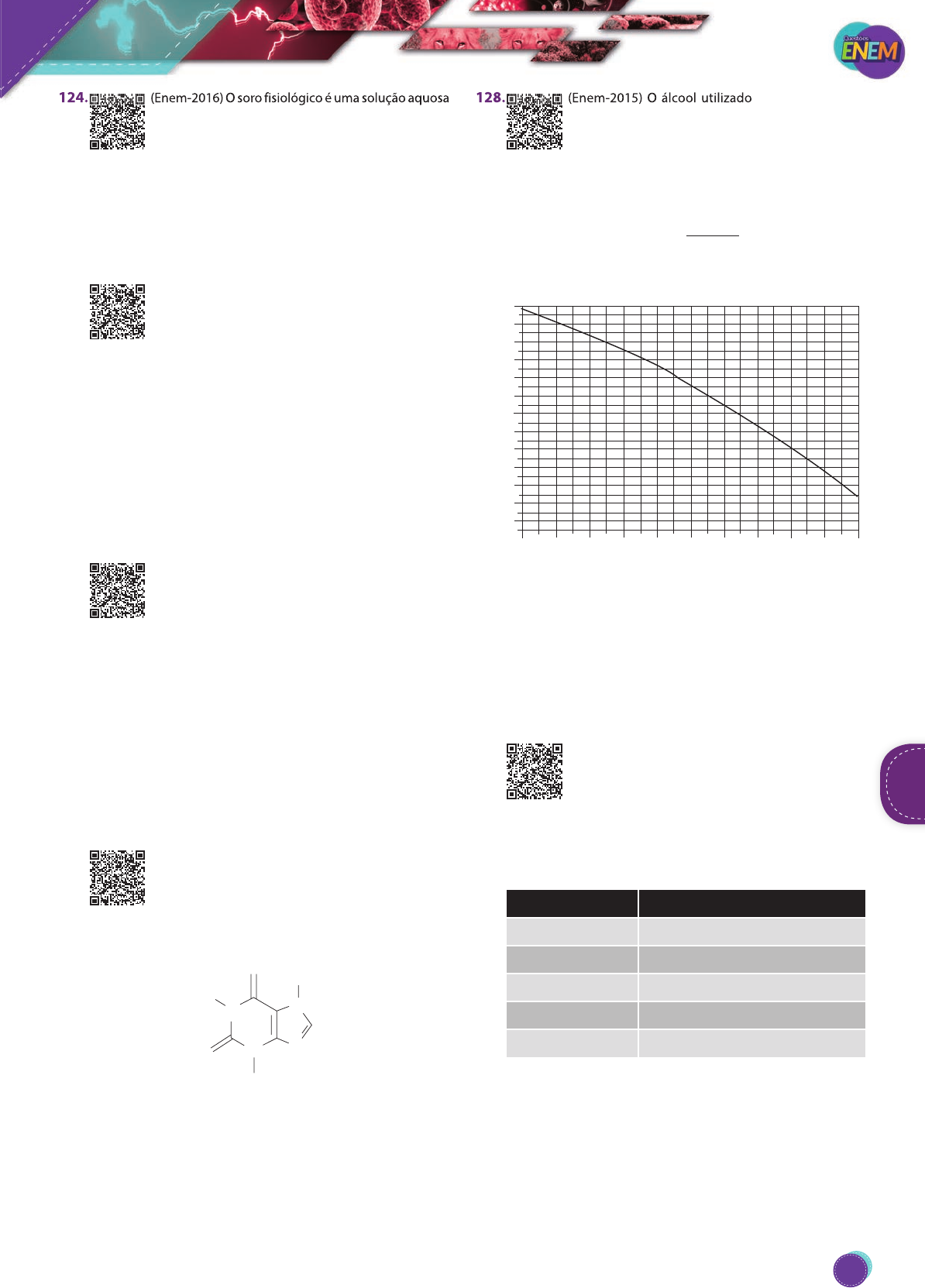 124. (Enem-2016) O soro fisiológico é uma solução aquosa de cloreto de sódio (NaC) comumente utilizada para higienização ocular, nasal, de ferimentos e de lentes de contato. Sua concentração é 0,90% em massa e densidade igual a 1,00 g/mL. Qual massa de NaC, em grama, deverá ser adicionada à água para preparar 500 mL? A) 0,45 B) 0,90 C) 4,50 D) 9,00 E) 45,00 125. (Enem-2015) A hidroponia pode ser definida como uma técnica de produção de vegetais sem necessa- riamente a presença de solo. Uma das formas de implementação é manter as plantas com suas raízes suspensas em meio líquido, de onde retiram os nutrientes es- senciais. Suponha que um produtor de rúcula hidropônica precise ajustar a concentração do íon nitrato (NO– 3) para 0,009 mol/L em um tanque de 5 000 litros e, para tanto, tem em mãos uma solução comercial nutritiva de nitrato de cálcio 90 g/L. As massas molares dos elementos N, O e Ca são iguais a 14 g/mol, 16 g/mol e 40 g/mol, respectivamente. Qual o valor mais próximo do volume da solução nutritiva, em litros, que o produtor deve adicionar ao tanque? A) 26 B) 41 C) 45 D) 51 E) 82 126. (Enem-2015) A obtenção de sistemas coloidais está- veis depende das interações entre as partículas dis- persas e o meio onde se encontram. Em um sistema coloidal aquoso, cujas partículas são hidrofílicas, a adição de um solvente orgânico miscível em água, como etanol, desestabiliza o coloide, podendo ocorrer a agregação das par- tículas preliminarmente dispersas. A desestabilização provocada pelo etanol ocorre porque A) a polaridade da água no sistema coloidal é reduzida. B) as cargas superficiais das partículas coloidais são diminuídas. C) as camadas de solvatação de água nas partículas são diminuídas. D) o processo de miscibilidade da água e do solvente libera calor para o meio. E) a intensidade dos movimentos brownianos das partículas coloidais é reduzida. 127. (Enem-2015) A cafeína é um alcaloide, identificado como 1,3,7-trimetilxantina (massa molar igual a 194 g/mol), cuja estrutura química contém uma unidade de purina, conforme representado. Esse alcaloide é encontrado em grande quantidade nas sementes de café e nas folhas de chá-verde. Uma xícara de café contém, em média, 80 mg de cafeína. H3C CH3 CH3 O O N N N N (MARIA, C. A. B.; MOREIRA, R. F. A. Cafeína: revisão sobre métodos de análise. Química Nova, n. 1, 2007. Adaptado.) Considerando que a xícara descrita contém um volume de 200 mL de café, a concentração, em mol/L, de cafeína nessa xícara é mais próxima de: A) 0,0004. B) 0,002. C) 0,4. D) 2. E) 4. 128. (Enem-2015) O álcool utilizado como combustível automotivo (etanol hidratado) deve apresentar uma taxa máxima de água em sua composição para não prejudicar o funcionamento do motor. Uma maneira simples e rápida de estimar a quantidade de etanol em misturas com água é medir a densidade da mistura. O gráfico mostra a variação da densidade da mistura (água e etanol) com a fração percentual da massa de etanol (fe), dada pela expressão fe = 100 · me me + ma em que me e ma são as massas de etanol e de água na mistura, respectivamente, a uma temperatura de 20°C. 1 0,98 0,96 0,94 0,92 0,9 0,88 0,86 0,84 0,82 0,8 0,78 ρ (g /c m 3) 0,76 fe 0 10 20 30 40 50 60 70 80 90 100 (Disponível em:. Acesso em: 8 ago. 2012.) Suponha que, em uma inspeção de rotina realizada em deter- minado posto, tenha-se verificado que 50,0 cm3 de álcool com- bustível tenham massa igual a 45,0 g. Qual é a fração percentual de etanol nessa mistura? A) 7%. B) 10%. C) 55%. D) 90%. E) 93%. 129. (Enem-2014) A utilização de processos de biorreme- diação de resíduos gerados pela combustão incom- pleta de compostos orgânicos tem se tornado cres- cente, visando minimizar a poluição ambiental. Para ocorrência de resíduos de naftaleno, algumas legislações limitam sua concentração em até 30 mg/kg para solo agrícola e 0,14 mg/L para água subterrânea. A quantificação desse resíduo foi reali- zada em diferentes ambientes, utilizando-se amostras de 500 g de solo e 100 mL de água, conforme apresentado no quadro. Ambiente Resíduo de naftaleno (g) Solo I 1,0 · 10–2 Solo II 2,0 · 10–2 Água I 7,0 · 10–6 Água II 8,0 · 10–6 Água III 9,0 · 10–6 O ambiente que necessita de biorremediação é o(a) A) solo I. B) solo II. C) água I. D) água II. E) água III. 124. (Enem-2016) O soro fisiológico é uma solução aquosa 128. (Enem-2015) O álcool utilizado como combustível QuímicaQuímica QuímicaQuímica 303 PG18EA445SD00_QE_2018_MIOLO.indb 303 26/02/2018 16:46:20