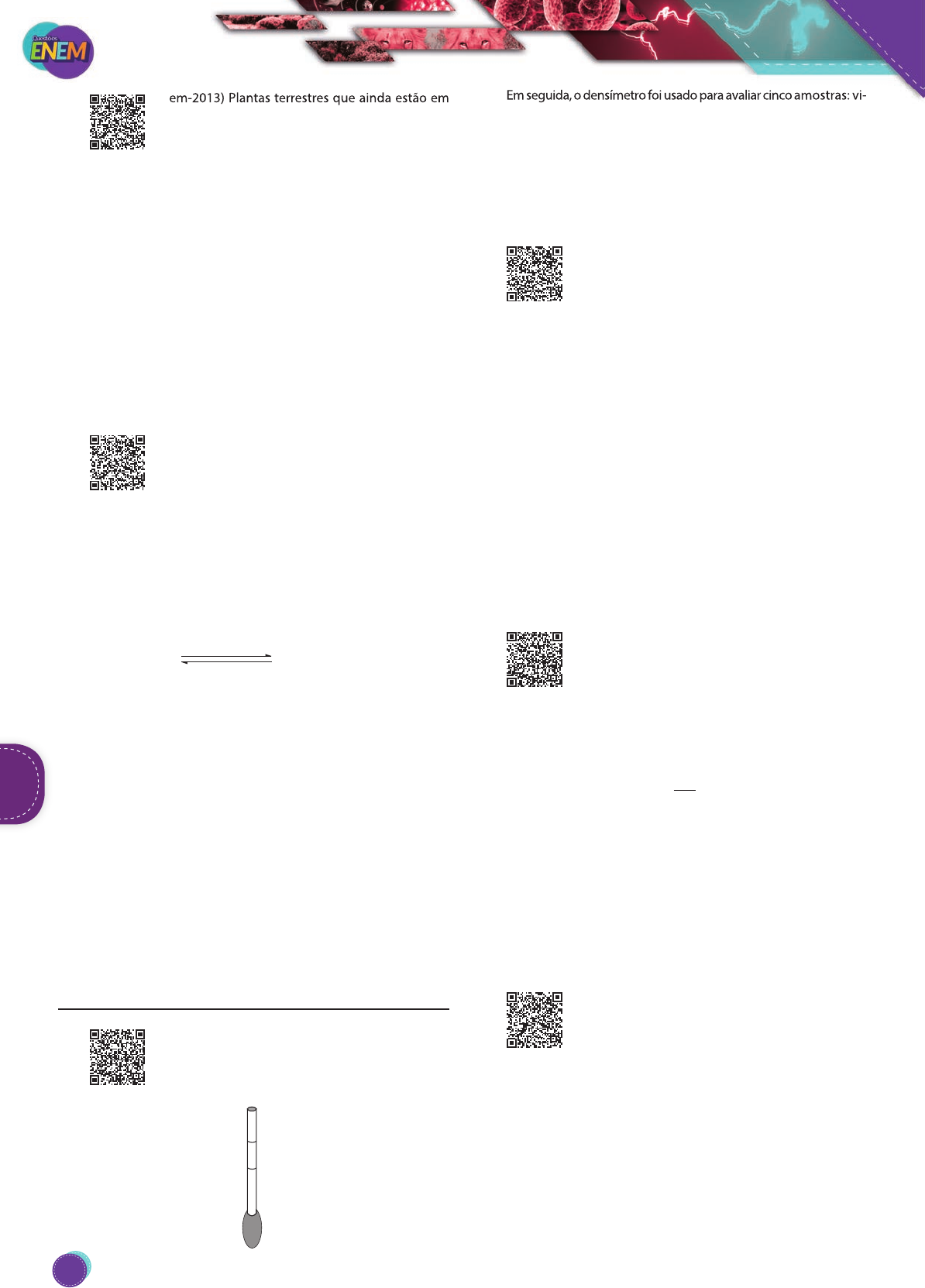 118. (Enem-2013) Plantas terrestres que ainda estão em fase de crescimento fixam grandes quantidades de CO2, utilizando-o para formar novas moléculas orgâ- nicas, e liberam grande quantidade de O2. No entanto, em florestas maduras, cujas árvores já atingiram o equilíbrio, o consumo de O2 pela respiração tende a igualar sua produção pela fotossíntese. A morte natural de árvores nessas florestas afeta temporariamente a concentração de O2 e de CO2 próximo à superfície do solo onde elas caíram. A concentração de O2 próximo ao solo, no local da queda, será A) menor, pois haverá consumo de O2 durante a decomposi- ção dessas árvores. B) maior, pois haverá economia de O2 pela ausência das ár- vores mortas. C) maior, pois haverá liberação de O2 durante a fotossíntese das árvores jovens. D) igual, pois haverá consumo e produção de O2 pelas árvores maduras restantes. E) menor, pois haverá redução de O2 pela falta da fotossíntese realizada pelas árvores mortas. 119. (Enem-2011) Os refrigerantes têm se tornado cada vez mais o alvo de políticas públicas de saúde. Os de cola apresentam ácido fosfórico, substância prejudicial à fixação de cálcio, o mineral que é o principal compo- nente da matriz dos dentes. A cárie é um processo dinâmico de desequilíbrio do processo de desmineralização dentária, perda de minerais em razão da acidez. Sabe-se que o principal compo- nente do esmalte do dente é um sal denominado hidroxiapatita. O refrigerante, pela presença da sacarose, faz descer o pH do biofilme (placa bacteriana), provocando a desmineralização do esmalte dentário. Os mecanismos de defesa salivar levam de 20 a 30 minutos para normalizar o nível do pH, remineralizando o dente. A equação química seguinte representa esse processo: Ca5(PO4)3OH(s) Hidroxiapatita mineralização desmineralização 5 Ca2+ (aq) + 3 PO4 3– (aq) + OH– (aq) (GROISMAN, S. Impacto do refrigerante nos dentes é avaliado sem tirá-lo da dieta. Disponível em: . Acesso em: 1 maio. 2010. Adaptado.) Considerando que uma pessoa consuma refrigerantes dia- riamente, poderá ocorrer um processo de desmineralização dentária, devido ao aumento da concentração de A) OH–, que reage com os íons Ca2+, deslocando o equilíbrio para a direita. B) H+, que reage com as hidroxilas OH–, deslocando o equilí- brio para a direita. C) OH–, que reage com os íons Ca2+, deslocando o equilíbrio para a esquerda. D) H+, que reage com as hidroxilas OH–, deslocando o equilí- brio para a esquerda. E) Ca2+, que reage com as hidroxilas OH– deslocando o equilí- brio para a esquerda. Soluções 120. (Enem-2017) Um estudante construiu um densíme- tro, esquematizado na figura, utilizando um canudi- nho e massa de modelar. O instrumento foi calibrado com duas marcas de flutuação, utilizando água (marca A) e etanol (marca B) como referências. B A Em seguida, o densímetro foi usado para avaliar cinco amostras: vi- nagre, leite integral, gasolina (sem álcool anidro), soro fisiológico e álcool comercial (92,8°GL). Que amostra apresentará marca de flutuação entre os limites A e B? A) Vinagre. B) Gasolina. C) Leite integral. D) Soro fisiológico. E) Álcool comercial. 121. (Enem-2017) A horticultura tem sido recomendada para a agricultura familiar, porém as perdas são gran- des devido à escassez de processos compatíveis para conservar frutas e hortaliças. O processo, denomina- do desidratação osmótica, tem se mostrado uma alternativa importante nesse sentido, pois origina produtos com boas condições de armazenamento e qualidade semelhante à matéria-prima. (GOMES, A. T.; CEREDA, M. P.; VILPOLJX, O. Desidratação osmótica: uma tecnologia de baixo custo para o desenvolvimento da agricultura familiar. Revista Brasileira de Gestão e Desenvolvimento Regional, n. 3, set.-dez. 2007. Adaptado.) Esse processo para conservar os alimentos remove a água por A) aumento do ponto de ebulição do solvente. B) passagem do soluto através de uma membrana semipermeável. C) utilização de solutos voláteis, que facilitam a evaporação do solvente. D) aumento da volatilidade do solvente pela adição de solu- tos ao produto. E) pressão gerada pela diferença de concentração entre o produto e a solução. 122. (Enem-2017) A absorção e o transporte de substâncias tóxicas em sistemas vivos dependem da facilidade com que estas se difundem através das membranas das células. Por apresentar propriedades químicas similares, testes laboratoriais empregam o octan-1-ol como modelo da atividade das membranas. A substância a ser testada é adicionada a uma mistura bifásica do octan-1-ol com água, que é agitada e, ao final, é medido o coeficiente de partição octan-1-ol:água (Koa): K C Coa oct a = , em que Coct é a concentração da substância na fase do octan-1-ol, e Ca a concentração da substância na fase aquosa. Foram avaliados cinco poluentes de sistemas aquáticos: benze- no, butano, éter dietílico, fluorobutano e metanol. O poluente que apresentou Koa tendendo a zero é o A) éter dietílico. B) fluorobutano. C) benzeno. D) metanol. E) butano. 123. (Enem-2016) Para cada litro de etanol produzido em uma indústria de cana-de-açúcar são gerados cerca de 18 L de vinhaça que é utilizada na irrigação das plantações de cana-de-açúcar, já que contém teores médios de nutrientes N, P e K iguais a 357 mg/L, 60 mg/L e 2 034 mg/L, respectivamente. (SILVA, M. A. S.; GRIEBELER, N. P.; BORGES, L. C. Uso de vinhaça e impactos nas propriedades do solo e lençol freático. Revista Brasileira de Engenharia Agrícola e Ambiental, n. 1, 2007. Adaptado.) Na produção de 27 000 L de etanol, a quantidade total de fósforo, em kg, disponível na vinhaça será mais próxima de: A) 1 B) 29 C) 60 D) 170 E) 1000 QuímicaQuímica (Enem-2013) Plantas terrestres que ainda estão em Em seguida, o densímetro foi usado para avaliar cinco amostras: vi- QuímicaQuímica 302 PG