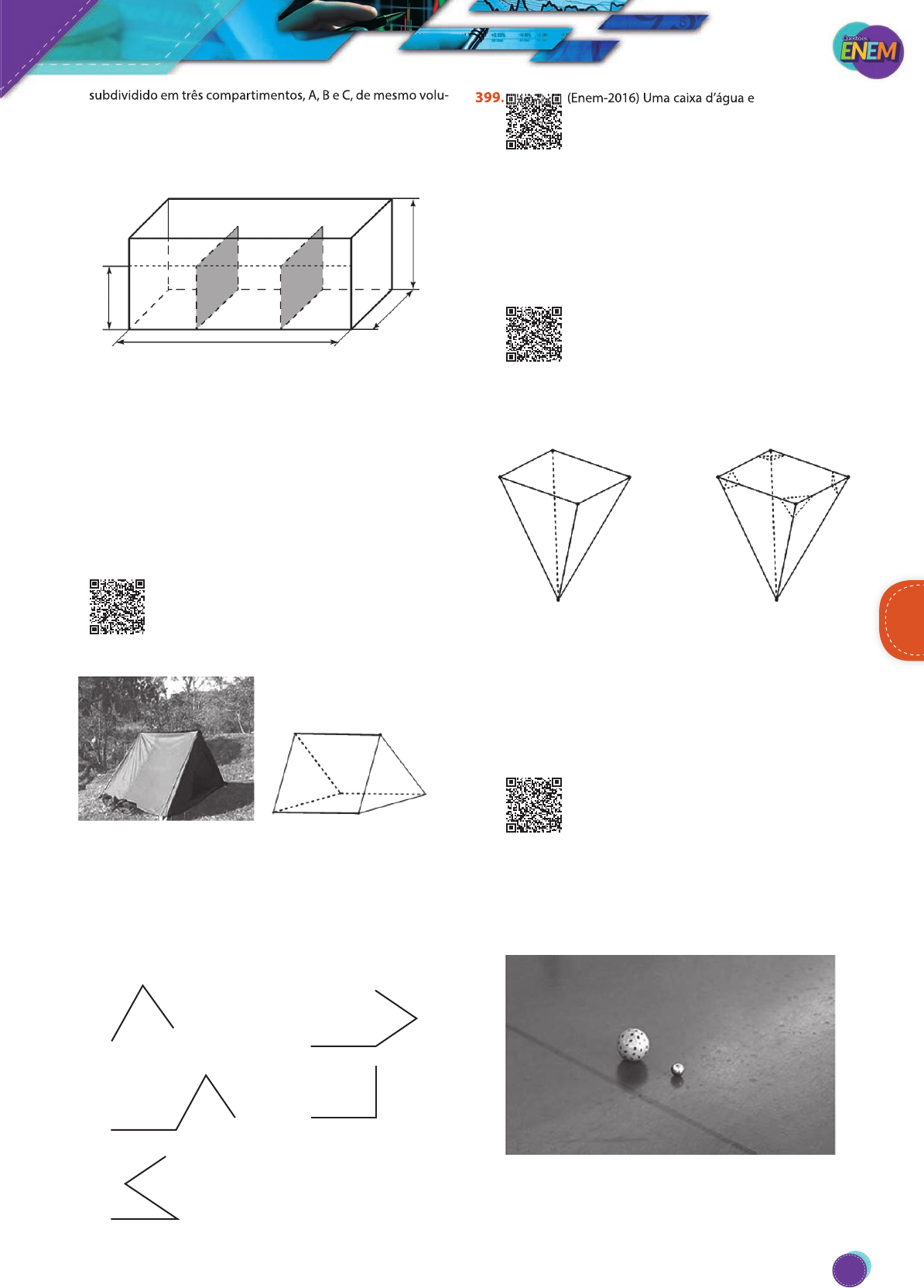 subdividido em três compartimentos, A, B e C, de mesmo volu- me, por duas placas de aço retangulares com dimensões de 7 m de altura e 10 m de base, de modo que os compartimentos são interligados, conforme a figura. Assim, caso haja rompimento no casco do reservatório, apenas uma parte de sua carga vazará. 7 m A B C 60 m 10 m 10 m Suponha que ocorra um desastre quando o petroleiro se encontra com sua carga máxima: ele sofre um acidente que ocasiona um furo no fundo do compartimento C. Para fins de cálculo, considere desprezíveis as espessuras das placas divisórias. Após o fim do vazamento, o volume de petróleo derramado terá sido de A) 1,4 × 103 m3 B) 1,8 × 103 m3 C) 2,0 × 103 m3 D) 3,2 × 103 m3 E) 6,0 × 103 m3 398. (Enem-2016) Um grupo de escoteiros mirins, numa atividade no parque da cidade onde moram, montou uma barraca conforme a foto da Figura 1. A Figura 2 mostra o esquema da estrutura dessa barraca, em forma de um prisma reto, em que foram usadas hastes metálicas. Figura 1 Figura 2 F E C BA D Após a armação das hastes, um dos escoteiros observou um inseto deslocar-se sobre elas, partindo do vértice A em direção ao vértice B, deste em direção ao vértice E e, finalmente, fez o tra- jeto do vértice E ao C. Considere que todos esses deslocamentos foram feitos pelo caminho de menor distância entre os pontos. A projeção do deslocamento do inseto no plano que contém a base ABCD é dada por A) B) C) D) E) 399. (Enem-2016) Uma caixa d’água em forma de um pa- ralelepípedo retângulo reto, com 4 m de comprimento, 3 m de largura e 2 m de altura, necessita de higieniza- ção. Nessa operação, a caixa precisará ser esvaziada em 20 min, no máximo. A retirada da água será feita com o auxílio de uma bomba de vazão constante, em que vazão é o volume do líquido que passa pela bomba por unidade de tempo. A vazão mínima, em litro por segundo, que essa bomba deverá ter para que a caixa seja esvaziada no tempo estipulado é A) 2 B) 3 C) 5 D) 12 E) 20 400. (Enem-2016) Um lapidador recebeu de um joalheiro a encomenda para trabalhar em uma pedra preciosa cujo formato é o de uma pirâmide, conforme ilustra a Figura 1. Para tanto, o lapidador fará quatro cortes de formatos iguais nos cantos da base. Os cantos retirados correspondem a pequenas pirâmides, nos vértices P, Q, R e S, ao longo dos segmentos tracejados, ilustrados na Figura 2. Figura 1 Figura 2 OO Q R S S P R Q P Depois de efetuados os cortes, o lapidador obteve, a partir da pedra maior, uma joia poliédrica cujos números de faces, arestas e vértices são, respectivamente, iguais a A) 9, 20 e 13. B) 9, 24 e 13. C) 7, 15 e 12. D) 10, 16 e 5. E) 11, 16 e 5. 401. (Enem-2016) A bocha é um esporte jogado em canchas, que são terrenos planos e nivelados, limi- tados por tablados perimétricos de madeira. O ob- jetivo desse esporte é lançar bochas, que são bolas feitas de um material sintético, de maneira a situá-las o mais perto possível do bolim, que é uma bola menor feita, prefe- rencialmente, de aço, previamente lançada. A Figura 1 ilustra uma bocha e um bolim que foram jogados em uma cancha. Suponha que um jogador tenha lançado uma bocha, de raio 5 cm, que tenha ficado encostada no bolim, de raio 2 cm, conforme ilustra a Figura 2. Figura 1 subdividido em três compartimentos, A, B e C, de mesmo volu- 399. (Enem-2016) Uma caixa d’água em forma de um pa- MatemáticaMatemática MatemáticaMatemática 231 PG18EA445SD00_QE_2018_MIOLO.indb 231 26/02/2018 16:44:46