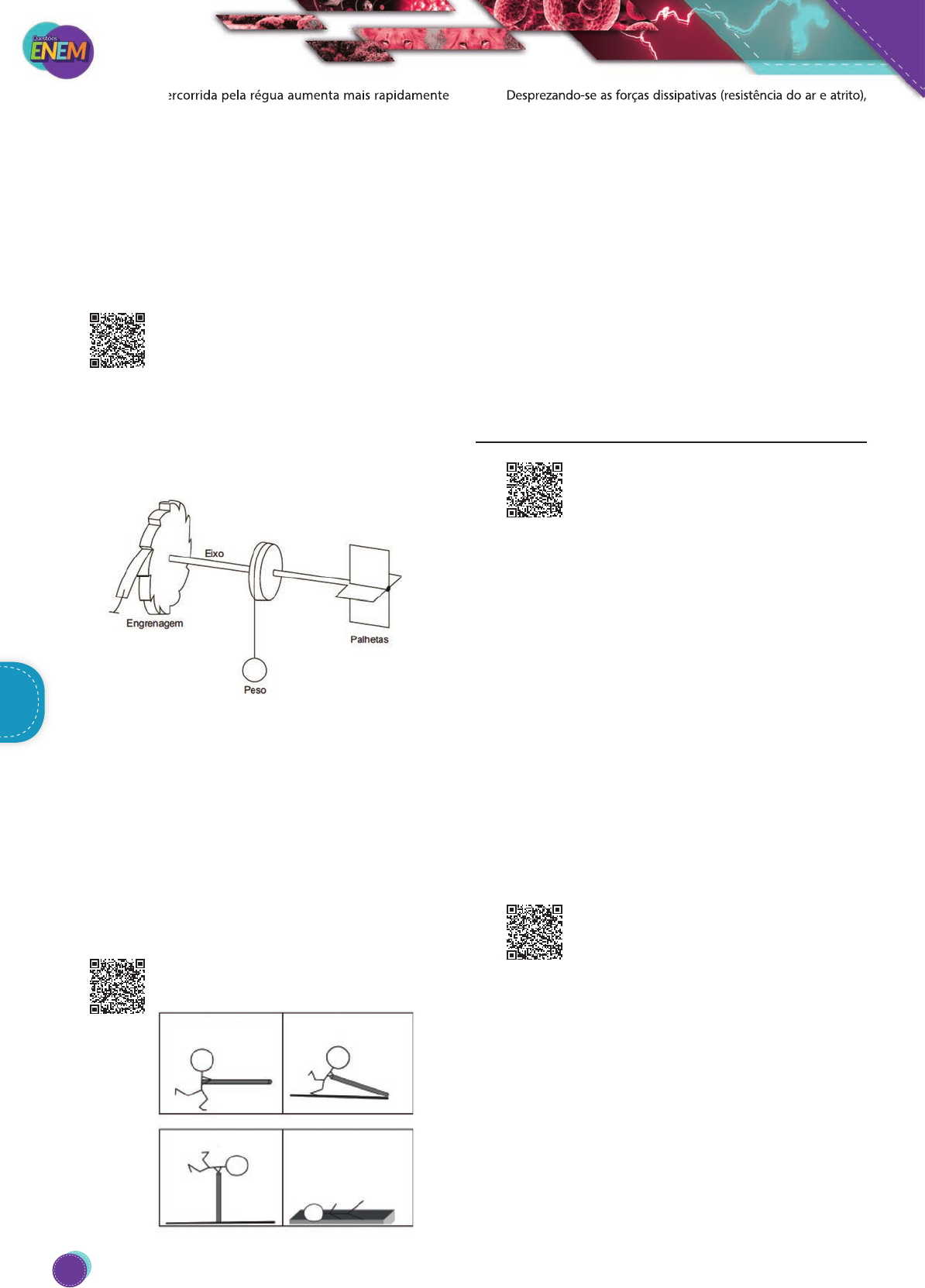 A distância percorrida pela régua aumenta mais rapidamente que o tempo de reação porque a A) energia mecânica da régua aumenta, o que a faz cair mais rápido. B) resistência do ar aumenta, o que faz a régua cair com me- nor velocidade. C) aceleração de queda da régua varia, o que provoca um mo- vimento acelerado. D) força peso da régua tem valor constante, o que gera um movimento acelerado. E) velocidade da régua é constante, o que provoca uma pas- sagem linear de tempo. 31. (Enem-2011) Partículas suspensas em um fluido apre- sentam contínua movimentação aleatória, chamado movimento browniano, causado pelos choques das partículas que compõem o fluido. A ideia de um inven- tor era construir uma série de palhetas, montadas sobre um eixo, que seriam postas em movimento pela agitação das partículas ao seu redor. Como o movimento ocorreria igualmente em ambos os sentidos de rotação, o cientista concebeu um segundo elemento, um dente de engrenagem assimétrico. Assim, em escala muito pequena, este tipo de motor poderia executar trabalho, por exem- plo, puxando um pequeno peso para cima. O esquema, que já foi testado, é mostrado a seguir. (Inovação Tecnológica. Disponível em: . Acesso em: 22 jul. 2010. Adaptado.) A explicação para a necessidade do uso da engrenagem com trava é: A) o travamento do motor, para que ele não se solte aleatoriamente. B) a seleção da velocidade, controlada pela pressão nos den- tes da engrenagem. C) o controle do sentido da velocidade tangencial, permitin- do, inclusive, uma fácil leitura do seu valor. D) a determinação do movimento, devido ao caráter aleató- rio, cuja tendência é o equilíbrio. E) a escolha do ângulo a ser girado, sendo possível, inclusive, medi-lo pelo número de dentes da engrenagem. 32. (Enem-2011) Uma das modalidades presentes nas Olimpíadas é o salto com vara. As etapas de um dos saltos de um atleta estão representadas nas figuras: Etapa I Etapa III Atleta corre com a vara Atleta atinge certa altura Atleta cai em um colchão Atleta apoia a vara no chão Etapa IV Etapa II Desprezando-se as forças dissipativas (resistência do ar e atrito), para que o salto atinja a maior altura possível, ou seja, o máximo de energia seja conservada, é necessário que A) a energia cinética, representada na etapa I, seja totalmente convertida em energia potencial elástica representada na etapa IV. B) a energia cinética, representada na etapa II, seja totalmen- te convertida em energia potencial gravitacional, represen- tada na etapa IV. C) a energia cinética, representada na etapa I, seja totalmente convertida em energia potencial gravitacional, representa- da na etapa III. D) a energia potencial gravitacional, representada na etapa II, seja totalmente convertida em energia potencial elástica, representada na etapa IV. E) a energia potencial gravitacional, representada na etapa I, seja totalmente convertida em energia potencial elástica, representada na etapa III. Mecânica dos fluídos 33. (Enem-2015) Sabe-se que nas proximidades dos polos do planeta Terra é comum a formação dos icebergs, que são grandes blocos de gelo flutuando nas águas oceânicas. Estudos mostram que a parte de gelo que fica emersa durante a flutuação corresponde a aproximadamen- te 10% do seu volume total. Um estudante resolveu simular essa situação introduzindo um bloquinho de gelo no interior de um recipiente contendo água, observando a variação de seu nível desde o instante de introdução até o completo derretimento do bloquinho. Com base nessa simulação, verifica-se que o nível da água no recipiente A) subirá com a introdução do bloquinho de gelo e, após o derretimento total do gelo, esse nível subirá ainda mais. B) subirá com a introdução do bloquinho de gelo e, após o derretimento total do gelo, esse nível descerá, voltando ao seu valor inicial. C) subirá com a introdução do bloquinho de gelo e, após o derretimento total do gelo, esse nível permanecerá sem alteração. D) não sofrerá alteração com a introdução do bloquinho de gelo, porém, após seu derretimento, o nível subirá devido a um aumento em torno de 10% no volume de água. E) subirá em torno de 90% do seu valor inicial com a introdu- ção do bloquinho de gelo e, após seu derretimento, o nível descerá apenas 10% do valor inicial. 34. (Enem-2015) No manual de uma torneira elétrica são fornecidas instruções básicas de instalação para que o produto funcione corretamente: • Se a torneira for conectada à caixa-d’água domiciliar, a pres- são da água na entrada da torneira deve ser no mínimo 18 kPa e no máximo 38 kPa. • Para pressões da água entre 38 kPa e 75 kPa ou água prove- niente diretamente da rede pública, é necessário utilizar o redutor de pressão que acompanha o produto. • Essa torneira elétrica pode ser instalada em um prédio ou em uma casa. Considere a massa específica da água 1 000 kg/m3 e a aceleração da gravidade 10 m/s2. FísicaFísica A distância percorrida pela régua aumenta mais rapidamente Desprezando-se as forças dissipativas (resistência do ar e atrito), FísicaFísica 254 PG18EA445SD00_QE_2018_MIOLO.indb 254 26/02/2018 16:45:13