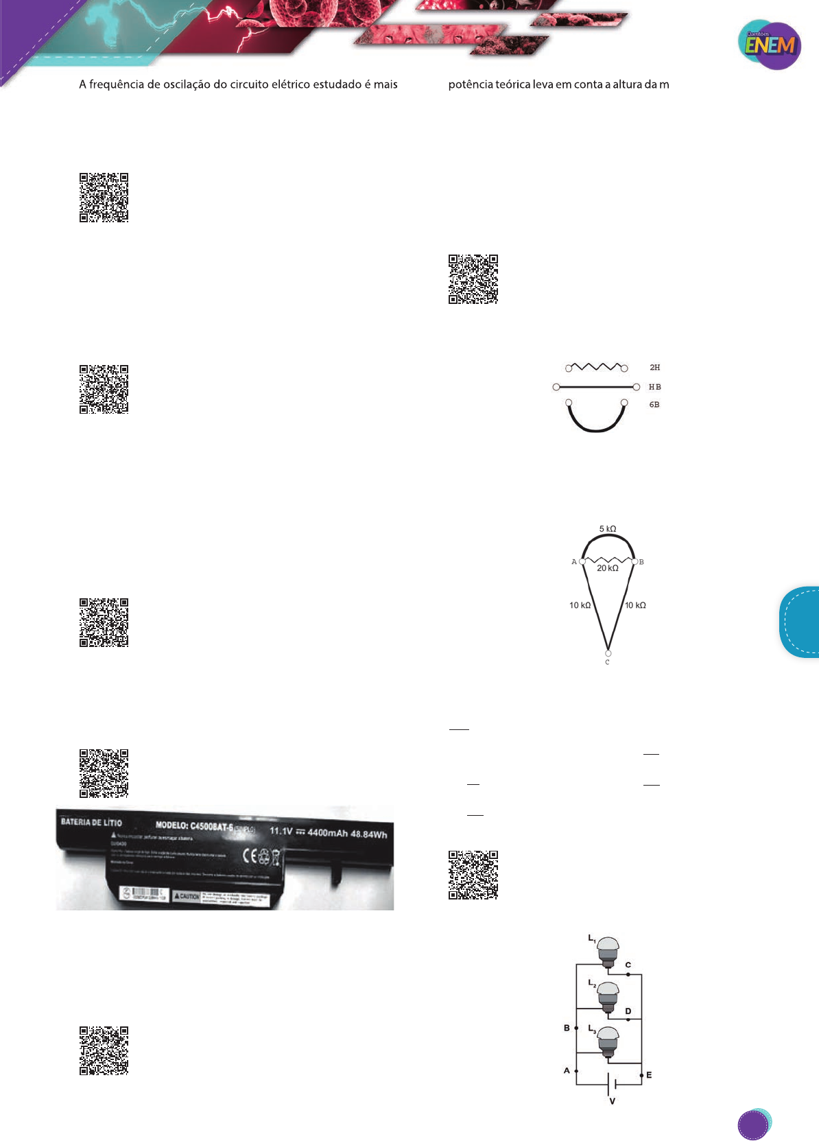A frequência de oscilação do circuito elétrico estudado é mais próxima de A) 300 Hz. B) 250 Hz. C) 200 Hz. D) 150 Hz. E) 125 Hz. 109. (Enem-2017) A capacidade de uma bateria com acu- muladores, tal como a usada no sistema elétrico de um automóvel, é especificada em ampere-hora (Ah). Uma bateria de 12 V e 100 Ah fornece 12 J para cada coulomb de carga que flui através dela. Se um gerador, de resistência interna desprezível, que fornece uma potência elétrica média igual a 600 W, fosse conectado aos terminais da bateria descrita, quanto tempo ele levaria para recarregá-la completamente? A) 0,5 h B) 2 h C) 12 h D) 50 h E) 100 h 110. (Enem-2017) As lâmpadas econômicas transformam 80% da energia elétrica consumida em luz e dissipam os 20% restantes em forma de calor. Já as incandes- centes transformam 20% da energia elétrica consu- mida em luz e dissipam o restante em forma de calor. Assim, quando duas dessas lâmpadas possuem luminosidades equi- valentes, a econômica apresenta uma potência igual a um quarto da potência da incandescente. Quando uma lâmpada incandescente de 60 W é substituída por uma econômica de mesma luminosidade, deixa-se de transferir para o ambiente, a cada segundo, uma quantidade de calor, em joule, igual a A) 3. B) 12. C) 15. D) 45. E) 48. 111. (Enem-2017) Uma lâmpada é conectada a duas pilhas de tensão nominal 1,5 V, ligadas em série. Um voltí- metro, utilizado para medir a diferença de potencial na lâmpada, fornece uma leitura de 2,78 V e um amperímetro indica que a corrente no circuito é de 94,2 mA. O valor da resistência interna das pilhas é mais próximo de A) 0,021 Ω. B) 0,220 Ω. C) 0,260 Ω. D) 2,3 Ω. E) 290 Ω. 112. (Enem-2017) A figura mostra a bateria de um com- putador portátil, a qual necessita de uma corrente elétrica de 2 A para funcionar corretamente. Quando a bateria está completamente carregada, o tempo máximo, em minuto, que esse notebook pode ser usado antes que ela “descarregue” completamente é A) 24,4. B) 36,7. C) 132. D) 333. E) 5/28. 113. (Enem-2016) A usina de Itaipu é uma das maiores hidrelétricas do mundo em geração de energia. Com 20 unidades geradoras e 14 000 MW de potência total instalada, apresenta uma queda de 118,4 m e vazão nominal de 690 m3/s por unidade geradora. O cálculo da potência teórica leva em conta a altura da massa de água repre- sada pela barragem, a gravidade local (10 m/s2) e a densidade da água (1 000 kg/m3). A diferença entre a potência teórica e a instalada é a potência não aproveitada. (Disponível em: . Acesso em: 11 maio 2013. Adaptado.) Qual é a potência, em MW, não aproveitada em cada unidade geradora de Itaipu? A) 0 B) 1,18 C) 116,96 D) 816,96 E) 13 183,04 114. (Enem-2016) Por apresentar significativa resistividade elétrica, o grafite pode ser utilizado para simular re- sistores elétricos em circuitos desenhados no papel, com o uso de lápis e lapiseiras. Dependendo da es- pessura e do comprimento das linhas desenhadas, é possível determinar a resistência elétrica de cada traçado produzido. No esquema foram utilizados três tipos de lápis diferentes (2H, HB e 6B) para efetuar três traçados distintos. Munido dessas informações, um estudante pegou uma folha de papel e fez o desenho de um sorvete de casquinha utilizando-se desses traçados. Os valores encontrados nesse experimento, para as resistências elétricas (R), medidas com o auxílio de um ohmí- metro ligado nas extremidades das resistências, são mostrados na figura. Verificou-se que os resistores obedeciam à Lei de Ohm. Na sequência, conectou o ohmímetro nos terminais A e B do desenho e, em seguida, conectou-o nos terminais B e C, anotan- do as leituras RAB e RBC, respectivamente. Ao estabelecer a razão , qual resultado o estudante obteve? A) 1 B) C) D) E) 115. (Enem-2016) Três lâmpadas idênticas foram ligadas no circuito esquematizado. A bateria apresenta resis- tência interna desprezível, e os fios possuem resis- tência nula. Um técnico fez uma análise do circuito para prever a corrente elétrica nos pontos: A, B, C, D e E; e rotulou essas correntes de IA, IB, IC, ID e IE, respectivamente. RAB RAC 4 7 10 27 14 81 4 81 A frequência de oscilação do circuito elétrico estudado é mais potência teórica leva em conta a altura da massa de água repre- FísicaFísica FísicaFísica 269 PG18EA445SD00_QE_2018_MIOLO.indb 269 26/02/2018 16:45:32