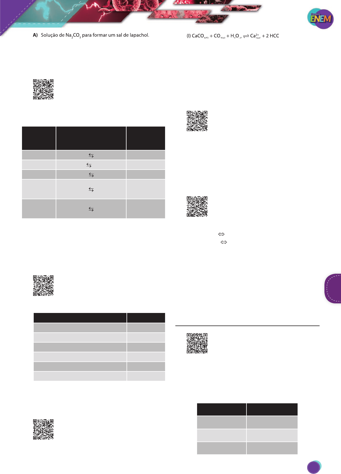 A) Solução de Na2CO3 para formar um sal de lapachol. B) Solução-tampão ácido acético/acetato de sódio (pH = 4,5). C) Solução de NaC a fim de aumentar a força iônica do meio. D) Solução de Na2SO4 para formar um par iônico com lapachol. E) Solução de HC a fim de extraí-lo por meio de reação ácido-base. 23. (Enem-2016) Após seu desgaste completo, os pneus podem ser queimados para a geração de energia. Dentre os gases gerados na combustão completa da borracha vulcanizada, alguns são poluentes e provo- cam a chuva ácida. Para evitar que escapem para a atmosfera, esses gases podem ser borbulhados em uma solução aquosa contendo uma substância adequada. Considere as informações das substâncias listadas no quadro. Substância Equilíbrio em solução aquosa Valor da constante de equilíbrio Fenol C6H5OH + H2O C6H5O– + H3O+ 1,3 · 10–10 Piridina C5H5N + H2O C5H5NH++ OH– 1,7 · 10–9 Metilamina CH3NH2 + H2O CH3NH3 ++ OH– 4,4 · 10–4 Hídrogeno- fosfato de potássio HPO4 2– + H2O H2PO4 – + OH– 2,8 · 10–2 Hidrogeno- sulfato de potássio HSO4 – + H2O SO4 2– + H3O+ 3,1 · 10–2 Dentre as substâncias listadas no quadro, aquela capaz de re- mover com maior eficiência os gases poluentes é o(a) A) fenol. B) piridina. C) metilamina. D) hidrogenofosfato de potássio. E) hidrogenosulfato de potássio. 24. (Enem-2015) Cinco indústrias de ramos diferentes foram instaladas ao longo do curso de um rio. O descarte dos efluentes dessas indústrias acarreta impacto na qualidade de suas águas. O pH foi deter- minado em diferentes pontos desse rio, a 25°C, e os resultados são apresentados no quadro. Pontos de coleta Valor do pH Antes da primeira indústria 5,5 Entre a primeira e a segunda indústria 5,5 Entre a segunda e a terceira indústria 7,5 Entre a terceira e a quarta indústria 7,0 Entre a quarta e a quinta indústria 7,0 Após a quinta indústria 6,5 A indústria que descarta um efluente com características básicas é a A) primeira. B) segunda. C) terceira. D) quarta. E) quinta. 25. (Enem-2015) Vários ácidos são utilizados em indús- trias que descartam seus efluentes nos corpos d’água, como rios e lagos, podendo afetar o equilíbrio am- biental. Para neutralizar a acidez, o sal carbonato de cálcio pode ser adicionado ao efluente, em quantidades apro- priadas, pois produz bicarbonato, que neutraliza a água. As equações envolvidas no processo são apresentadas: (I) CaCO3(S) + CO2(g) + H2O() Ca2+ (aq) + 2 HCO3 – (aq) (II) HCO3 – (aq) H+ (aq) + CO3 2– (aq) K1 = 3,0 · 10–11 (III) CaCO3(S) CO2+ (aq) + CO3 2– (aq) K2 = 6,0 · 10–9 (IV) CO2(g) + H2O() H+ (aq) + HCO3 – (aq) K3 = 2,5 · 10–7 Com base nos valores das constantes de equilíbrio das reações II, III e IV a 25°C, qual é o valor numérico da constante de equi- líbrio da reação I? A) 4,5 · 10–26 B) 5,0 · 10–5 C) 0,8 · 10–9 D) 0,2 · 105 E) 2,2 · 1026 26. (Enem-2014) Visando minimizar impactos ambientais, a legislação brasileira determina que resíduos quími- cos lançados diretamente no corpo receptor tenham pH entre 5,0 e 9,0. Um resíduo líquido aquoso gerado em um processo industrial tem concentração de íons hidroxila igual a 1,0 x 10–10 mol/L. Para atender a legislação, um químico separou as seguintes substâncias, disponibilizadas no almoxa- rifado da empresa: CH3COOH, Na2SO4, CH3OH, K2CO3 e NH4C. Para que o resíduo possa ser lançado diretamente no corpo re- ceptor, qual substância poderia ser empregada no ajuste do pH? A) CH3COOH B) Na2SO4 C) CH3OH D) K2CO3 E) NH4C 27. (Enem-2013) Uma das etapas do tratamento da água é a desinfecção, sendo a cloração o método mais empregado. Esse método consiste na dissolução do gás cloro numa solução sob pressão e sua aplicação na água a ser desinfetada. As equações das reações químicas envolvidas são: C2(g) + 2 H2O () HCO(aq) + H3O(aq) + C – (aq); HCO(aq) + H2O() H3O(aq) + CO– (aq) pK4 = –log Ka = 7,53 A ação desinfetante é controlada pelo ácido hipocloroso, que possui um potencial de desinfecção cerca de 80 vezes supe- rior ao ânion hipoclorito. O pH do meio é importante, porque influencia na extensão com que o ácido hipocloroso se ioniza. Para que a desinfecção seja mais efetiva, o pH da água a ser tratada deve estar mais próximo de A) 0 B) 5 C) 7 D) 9 E) 14 Estequiometria 28. (Enem-2017) A toxicidade de algumas substâncias é normalmente representada por um índice conhecido como DL50 (dose letal mediana). Ele representa a dosagem aplicada a uma população de seres vivos que mata 50% desses indivíduos e é normalmente medido utilizando-se ratos como cobaias. Esse índice é muito importante para os seres humanos, pois ao se extrapolar os dados obtidos com o uso de cobaias, pode-se determinar o nível tolerável de contaminação de alimentos, para que possam ser consumidos de forma segura pelas pessoas. O quadro apresenta três pesti- cidas e suas toxicidades. A unidade mg/kg indica a massa da substância ingerida pela massa da cobaia. Pesticidas DL50 (mg/kg) Diazinon 70 Malation 1 000 Atrazina 3 100 A) Solução de Na2CO3 para formar um sal de lapachol. (I) CaCO3(S) + CO2(g) + H2O() Ca2+ (aq) + 2 HCO QuímicaQuímica QuímicaQuímica 283 PG18EA445SD00_QE_2018_MIOLO.indb 283 26/02/2018 16:45:50