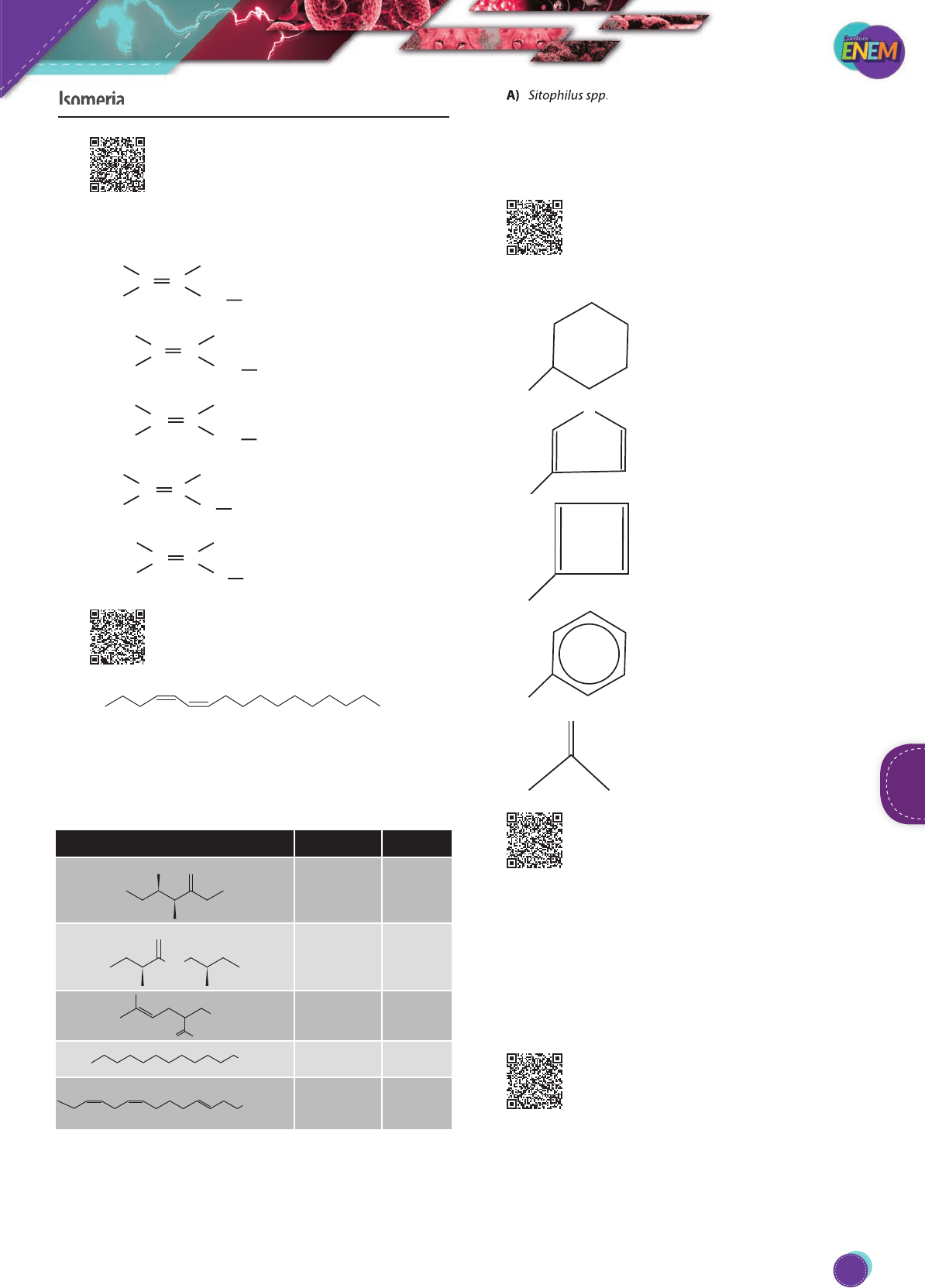 Isomeria 44. (Enem-2017) Em algumas regiões brasileiras, é co- mum se encontrar um animal com odor característico, o zorrilho. Esse odor serve para a proteção desse animal, afastando seus predadores. Um dos feromô- nios responsáveis por esse odor é uma substância que apresenta isomeria trans e um grupo tiol ligado à sua cadeia. A estrutura desse feromônio, que ajuda na proteção do zorrilho, é A) H C C H CH3 CH2 SH B) H3C C C H H CH2 SH C) H C C H3C H CH2 SH D) H C C H CH3 S CH3 E) H C C H3C H S CH3 45. (Enem-2016) Os feromônios são substâncias utilizadas na comunicação entre indivíduos de uma espécie. O primeiro feromônio isolado de um inseto foi o bom- bicol, substância produzida pela mariposa do bicho-da-seda. OH Bombicol O uso de feromônios em ações de controle de insetos-praga está de acordo com o modelo preconizado para a agricultura do futuro. São agentes altamente específicos e seus compostos químicos podem ser empregados em determinados cultivos, conforme ilustrado no quadro. Substância Inseto Cultivo OOH Sitophilus spp Milho O NH Migdolus fryanus Cana-de- -açúcar OH Anthonomus rubi Morango OH Grapholita molesta Frutas OCOCH3 Scrobipal- puloides absoluta Tomate (FERREIRA, J. T. B.; ZARBIN, P. H. G. Amor ao primeiro odor: a comunicação química entre os insetos. Química Nova na Escola, n. 7, maio 1998. Adaptado.) Considerando essas estruturas químicas, o tipo de estereoiso- meria apresentada pelo bombicol é também apresentada pelo feromônio utilizado no controle do inseto A) Sitophilus spp. B) Migdolus fryanus. C) Anthonomus rubi. D) Grapholita molesta. E) Scrobipalpuloides absoluta. 46. (Enem-2014) A forma das moléculas, como represen- tadas no papel, nem sempre é planar. Em um deter- minado fármaco, a molécula contendo um grupo não planar é biologicamente ativa, enquanto moléculas contendo substituintes planares são inativas. O grupo responsável pelo bioatividade desse fármaco é A) B) S C) D) E) O H 47. (Enem-2014) O estudo de compostos orgânicos permite aos analistas definir propriedades físicas e químicas responsáveis pelas características de cada substância descoberta. Um laboratório investiga moléculas quirais cuja cadeia carbônica seja insaturada, hete- rogênea e ramificada. A fórmula que se enquadra nas características da molécula investigada é: A) CH3 — (CH)2 — CH(OH) — CO — NH — CH3. B) CH3 — (CH)2 — CH(CH3) — CO — NH — CH3. C) CH3 — (CH)2 — CH(CH3) — CO — NH2. D) CH3 — CH2 — CH(CH3) — CO — NH — CH3. E) C6H5 — CH2 — CO — NH — CH3. 48. (Enem-2014) A talidomida é um sedativo leve e muito utilizado no tratamento de náuseas, comuns no início da gravidez. Quando foi lançada, era considerada se- gura para o uso de grávidas, sendo administrada como uma mistura racêmica composta pelos seus dois enantiômeros (R e S). Entretanto, não se sabia, na época, que o enantiômero S leva à malformação congênita, afetando principalmente o de- senvolvimento normal dos braços e pernas do bebê. (COELHO, F. A. S. Fármacos e quiralidade. Cadernos temáticos de Química Nova na Escola, São Paulo, n. 3, maio 2001. Adaptado.) Isomeria A) Sitophilus spp. QuímicaQuímica QuímicaQuímica 287 PG18EA445SD00_QE_2018_MIOLO.indb 287 26/02/2018 16:45:57