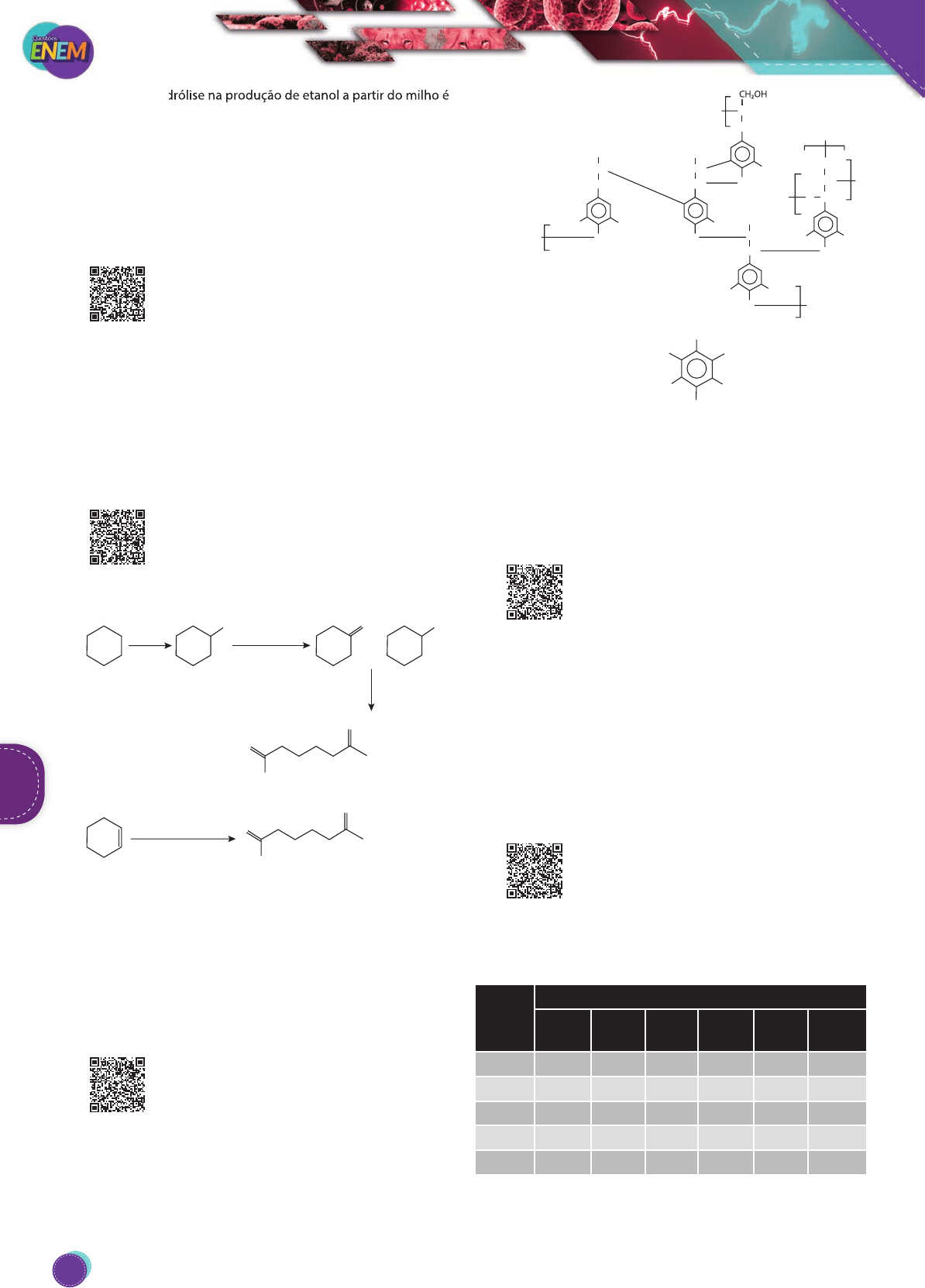 A etapa de hidrólise na produção de etanol a partir do milho é fundamental para que A) a glicose seja convertida em sacarose. B) as enzimas dessa planta sejam ativadas. C) a maceração favoreça a solubilização em água. D) o amido seja transformado em substratos utilizáveis pela levedura. E) os grãos com diferentes composições químicas sejam padronizados. 73. (Enem-2016) A descoberta dos organismos extremó- filos foi uma surpresa para os pesquisadores. Alguns desses organismos, chamados de acidófilos, são ca- pazes de sobreviver em ambientes extremamente ácidos. Uma característica desses organismos é a capacidade de produzir membranas celulares compostas de lipídeos feitos de éteres em vez dos ésteres de glicerol, comuns nos outros seres vivos (mesófilos), o que preserva a membrana celular desses organismos mesmo em condições extremas de acidez. A degradação das membranas celulares de organismos não extremófilos em meio ácido é classificada como A) hidrólise. B) termólise. C) eterificação D) condensação. E) saponificação. 74. (Enem-2015) A química verde permite o desenvolvi- mento tecnológico com danos reduzidos ao meio ambiente, e encontrar rotas limpas tem sido um grande desafio. Considere duas rotas diferentes uti- lizadas para a obtenção de ácido adípico, um insumo muito importante para a indústria têxtil e de plastificantes. Rota tradicional (marrom) lavagem cáustica O O O OH OH CO2+ + + + HNO3 V , Cu5+ N2O 4 H2O OH OOH Cr (III)Co 180°C 120°C 60% OH OH O O 75-90°C Na2WO4, 4 H2O2 Rota verde (LENARDÃO, E. J. et al. Green Chemistry – os 12 princípios da química verde e sua inserção nas atividades de ensino e pesquisa. Química Nova, n. 1, 2003. Adaptado.) Que fator contribui positivamente para que a segunda rota de síntese seja verde em comparação à primeira? A) Etapa única na síntese. B) Obtenção do produto puro. C) Ausência de reagentes oxidantes. D) Ausência de elementos metálicos no processo. E) Gasto de energia nulo na separação do produto. 75. (Enem-2015) O papel tem na celulose sua matéria- -prima, e uma das etapas de sua produção é o bran- queamento, que visa remover a lignina da celulose. Diferentes processos de branqueamento usam, por exemplo, cloro (Cℓ2), hipoclorito de sódio (NaCℓO), oxigênio (O2), ozônio (O3) ou peróxido de hidrogênio (H2O2). Alguns processos de branqueamento levam à formação de compostos organo- clorados. São apresentadas as estruturas de um fragmento da lignina e do tetracloroguaiacol, um dos organoclorados forma- dos no processo de branqueamento. CH2OH CH2 CHOH O O O OCH3 OCH3 OCH3 OCH3 OH C� C� C� C� O OCH3CH3O CH3O O O OCH3CH3O CH CH CH CH2OH Fragmento da Lignina Tetracloroguaiacol CHOH CH CH2OH CH CH CH2OH CH CH (SANTOS, C. P. et al. Papel: como se fabrica? Química Nova na Escola, n. 14. 2001. Adaptado.) Os reagentes capazes de levar à formação de organoclorados no processo citado são A) O2 e O3. B) Cℓ2 e O2. C) H2O2 e Cℓ2. D) NaCℓO e O3. E) NaCℓO e Cℓ2. 76. (Enem-2014) A capacidade de limpeza e a eficiência de um sabão dependem de sua propriedade de formar micelas estáveis, que arrastam com facilidade as moléculas impregnadas no material a ser limpo. Tais micelas têm em sua estrutura partes capazes de interagir com substâncias polares, como a água, e partes que podem interagir com substâncias apolares, como as gorduras e os óleos. (SANTOS, W. I. P.; MÓL, G. G. (Coords.) Química e sociedade. São Paulo: Nova Geração, 2005. Adaptado.) A substância capaz de formar as estruturas mencionadas é A) C18H36. B) C17H33COONa. C) CH3CH2COONa. D) CH3CH2CH2COOH. E) CH3CH2CH2CH2OCH2CH2CH2CH3. 77. (Enem-2014) O biodiesel não é classificado como uma substância pura, mas como uma mistura de ésteres derivados dos ácidos graxos presentes em sua maté- ria-prima. As propriedades do biodiesel variam com a composição do óleo vegetal ou gordura animal que lhe deu ori- gem, por exemplo, o teor de ésteres saturados é responsável pela maior estabilidade do biodiesel frente à oxidação, o que resulta em aumento da vida útil do biocombustível. O quadro ilustra o teor médio de ácidos graxos de algumas fontes oleaginosas. Fonte oleaginosa Teor médio de ácido graxo (% em massa) Mirístico (C14:0) Palmítico (C16:0) Esteárico (C18:0) Oleico (C18:1) Linoleico (C18:2) Linolênico (C18:3) Milho