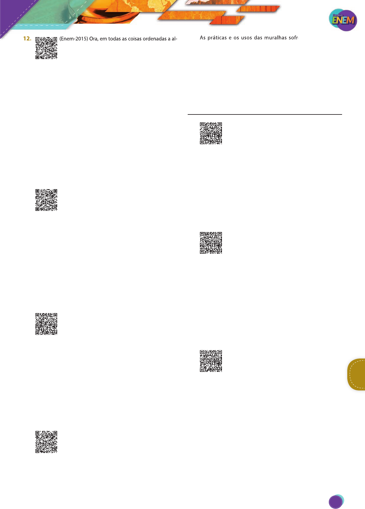 12. (Enem-2015) Ora, em todas as coisas ordenadas a al- gum fim, é preciso haver algum dirigente, pelo qual se atinja diretamente o devido fim. Com efeito, um navio, que se move para diversos lados pelo impulso dos ventos contrários, não chegaria ao fim de destino, se por in- dústria do piloto não fosse dirigido ao porto; ora, tem o homem um fim, para o qual se ordenam toda a sua vida e ação. Acontece, porém, agirem os homens de modos diversos em vista do fim, o que a própria diversidade dos esforços e ações humanas compro- va. Portanto, precisa o homem de um dirigente para o fim. (AQUINO. T. Do reino ou do governo dos homens: ao rei do Chipre. In: Escritos políticos de São Tomás de Aquino. Petrópolis: Vozes, 1995. Adaptado.) No trecho citado, Tomás de Aquino justifica a monarquia como o regime de governo capaz de A) refrear os movimentos religiosos contestatórios. B) promover a atuação da sociedade civil na vida política. C) unir a sociedade tendo em vista a realização do bem comum. D) reformar a religião por meio do retorno à tradição helenística. E) dissociar a relação política entre os poderes temporal e espiritual. 13. (Enem-2015) A casa de Deus, que acreditam una, está, portanto, dividida em três: uns oram, outros comba- tem, outros, enfim, trabalham. Essas três partes que coexistem não suportam ser separadas; os serviços prestados por uma são a condição das obras das outras duas; cada uma por sua vez encarrega-se de aliviar o conjunto… Assim a lei pode triunfar e o mundo gozar da paz. (ALDALBERON DE LAON. In: SPINOSA, F. Antologia de textos históricos medievais. Lisboa: Sá da Costa, 1981.) A ideologia apresentada por Aldalberon de Laon foi produzida durante a Idade Média. Um objetivo de tal ideologia e um pro- cesso que a ela se opôs estão indicados, respectivamente, em: A) justificar a dominação estamental / revoltas camponesas. B) subverter a hierarquia social / centralização monárquica. C) impedir a igualdade jurídica / revoluções burguesas. D) controlar a exploração econômica / unificação monetária. E) questionar a ordem divina / Reforma Católica. 14. (Enem-2014) Sou uma pobre velha mulher, Muito ignorante, que nem sabe ler. Mostraram-me na igreja da minha terra Um Paraíso com harpas pintado E o inferno onde fervem almas danadas, Um enche-me de júbilo, o outro me aterra. Os versos do poeta francês François Villon fazem referência às imagens presentes nos templos católicos medievais. Nesse contexto, as imagens eram usadas com o objetivo de A) refinar o gosto dos cristãos. B) incorporar ideais heréticos. C) educar os fiéis do olhar. D) divulgar a genialidade dos artistas católicos. E) valorizar esteticamente os templos religiosos. 15. (Enem-2011) Se a mania de fechar, verdadeiro habitus da mentalidade medieval nascido talvez de um pro- fundo sentimento de insegurança, estava difundida no mundo rural, estava do mesmo modo no meio urbano, pois que uma das características da cidade era de ser limitada por portas e por uma muralha. (DUBY, G. et al. Séculos XIV-XV. In: ARIÈS, P.; DUBY, G. História da vida privada da Europa feudal à Renascença. São Paulo: Cia. das Letras, 1990. Adaptado.) As práticas e os usos das muralhas sofreram importantes mudanças no final da Idade Média, quando elas assumiram a função de pontos de passagem ou pórticos. Este processo está diretamente relacionado com A) o crescimento das atividades comerciais e urbanas. B) a migração de camponeses e artesãos. C) a expansão dos parques industriais e fabris. D) o aumento do número de castelos e feudos. E) a contenção das epidemias e doenças. Idade Moderna 16. (Enem-2017) O garfo muito grande, com dois dentes, que era usado para servir as carnes aos convidados, é antigo, mas não o garfo individual. Este data mais ou menos do século XVI e difundiu-se a partir de Veneza e da Itália em geral, mas com lentidão. O uso só se ge- neralizaria por volta de 1750. (BRAUDEL, F. Civilização material, economia e capitalismo: séculos XV- XVIII; as estruturas do cotidiano. São Paulo: Martins Fontes, 1977. Adaptado.) No processo de transição para a modernidade, o uso do objeto descrito relaciona-se à A) construção de hábitos sociais. B) introdução de medidas sanitárias. C) ampliação das refeições familiares. D) valorização da cultura renascentista. E) incorporação do comportamento laico. 17. (Enem-2014) Todo homem de bom juízo, depois que tiver realizado sua viagem, reconhecerá que é um milagre manifesto ter podido escapar de todos os perigos que se apresentam em sua peregrinação; tanto mais que há tantos outros acidentes que diariamente podem aí ocorrer que seria coisa pavorosa àqueles que aí nave- gam querer pô-los todos diante dos olhos quando querem empreender suas viagens. (J. P. T. Histoire de plusieurs voyages aventureux. 1600. In: DELUMEAU, J. História do medo no Ocidente: 1300-1800. São Paulo: Cia das Letras, 2009. Adaptado.) Esse relato, associado ao imaginário das viagens marítimas da época moderna, expressa um sentimento de A) gosto pela aventura. B) fascínio pelo fantástico. C) temor do desconhecido. D) interesse pela natureza. E) purgação dos pecados. 18. (Enem-2013) Para que não haja abuso, é preciso orga- nizar as coisas de maneira que o poder seja contido pelo poder. Tudo estaria perdido se o mesmo homem ou o mesmo corpo dos principais, ou dos nobres, ou do povo, exercesse esses três poderes: o de fazer leis, o de executar as reso- luções públicas e o de julgar os crimes ou as divergências dos in- divíduos. Assim, criam-se os poderes Legislativo, Executivo e Judiciário, atuando de forma independente para a efetivação da liberdade, sendo que esta não existe se uma mesma pessoa ou grupo exercer os referidos poderes concomitantemente. (MONTESQUIEU, B. Do espírito das leis. São Paulo: Abril Cultural, 1979. Adaptado.) A divisão e a independência entre os poderes são 