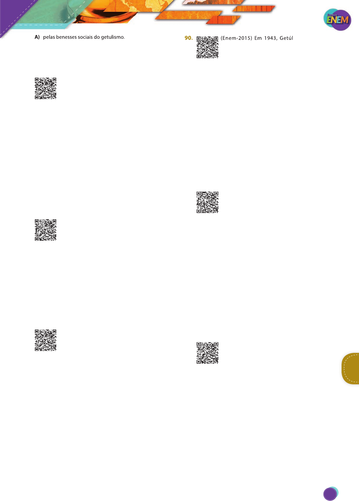 A) pelas benesses sociais do getulismo. B) por um diálogo democraticamente constituído. C) por uma legislação construída consensualmente. D) pelo reconhecimento de diferentes ideologias políticas. E) pela vinculação de direitos trabalhistas à tutela do Estado. 87. (Enem-2016) Em 1935, o governo brasileiro começou a negar vistos a judeus. Posteriormente, durante o Estado Novo, uma circular secreta proibiu a concessão de vistos a “pessoas de origem semita”, inclusive tu- ristas e negociantes, o que causou uma queda de 75% da imi- gração judaica ao longo daquele ano. Entretanto, mesmo com as imposições da lei, muitos judeus continuaram entrando ile- galmente no país durante a guerra e as ameaças de deportação em massa nunca foram concretizadas, apesar da extradição de alguns indivíduos por sua militância política. (GRIMBERG, K. Nova língua interior: 500 anos de história dos judeus no Brasil. In: IBGE. Brasil: 500 anos de povoamento. Rio de Janeiro: IBGE, 2000. Adaptado.) Uma razão para a adoção da política de imigração mencionada no texto foi o(a) A) receio do controle sionista sobre a economia nacional. B) reserva de postos de trabalho para a mão de obra local. C) oposição do clero católico à expansão de novas religiões. D) apoio da diplomacia varguista às opiniões dos líderes árabes. E) simpatia de membros da burocracia pelo projeto totalitário alemão. 88. (Enem-2015) A Justiça Eleitoral foi criada em 1932, como parte de uma ampla reforma no processo eleitoral incentivada pela Revolução de 1930. Sua criação foi um grande avanço institucional, garantin- do que as eleições tivessem o aval de um órgão teoricamente imune à influência dos mandatários. (TAYLOR, M. Justiça Eleitoral. In: AVRITZER, L.; ANASTASIA, F. Reforma política no Brasil. Belo Horizonte: UFMG, 2006. Adaptado). Em relação ao regime democrático no país, a instituição anali- sada teve o seguinte papel: A) Implementou o voto direto para presidente. B) Combateu as fraudes sistemáticas nas apurações. C) Alterou as regras para as candidaturas na ditadura. D) Impulsionou as denúncias de corrupção administrativa. E) Expandiu a participação com o fim de critério censitário. 89. (Enem-2015) Bandeira do Brasil, és hoje a única. Hasteada a esta hora em todo o território nacional, única e só, não há lugar no coração do Brasil para outras flâmulas, outras bandeiras, outros símbolos. Os brasileiros se reuniram em torno do Brasil e decretaram desta vez com determinação de não consentir que a discórdia volte novamente a dividi-lo! (DISCURSO do Ministro da Justiça Francisco Campos na cerimônia da festa da bandeira, em novembro de 1937. Apud OLIVEN, R. A parte e o todo: a diversidade cultural do Brasil Nação. Petrópolis, 1992.) O discurso proferido em uma celebração em que as bandeiras estaduais eram queimadas diante da bandeira nacional revela o pacto nacional proposto pelo Estado Novo, que se associa à A) supressão das diferenças socioeconômicas entre as regiões do Brasil, priorizando as regiões estaduais carentes. B) orientação do regime quanto ao reforço do federalismo, espelhando-se na experiência política norte-americana. C) adoção de práticas políticas autoritárias, considerando a contenção dos interesses regionais dispersivos. D) propagação de uma cultura política avessa aos ritos cívi- cos, cultivados pela cultura regional brasileira. E) defesa da unidade do território nacional, ameaçado por movimentos separatistas contrários à política varguista. 90. (Enem-2015) Em 1943, Getúlio Vargas criou o Departamento de Propaganda e Difusão Cultural junto ao Ministério da Justiça, esvaziando o Ministério da Educação não só da propaganda, mas também do rádio e do cinema. A decisão tinha como objetivo colocar os meios de comunicação de massa a serviço direto do Poder Executivo, iniciativa que tinha inspiração direta no recém-criado Ministério da Propaganda alemão. (CAPELATO, M. H. Propaganda política e controle dos meios de comunicação. Rio de Janeiro: FGV, 1999.) No contexto citado, a transferência de funções entre ministérios tece como finalidade o(a) A) desativação de um sistema tradicional de comunicação voltado para a educação. B) controle do conteúdo da informação por meio de uma orientação política e ideológica. C) subordinação do ministério da educação ao ministério da justiça e ao poder executivo. D) ampliação do raio de atuação das emissoras de rádio como forma de difusão da cultura popular. E) demonstração de força política do executivo diante de mi- nistérios herdados do governo anterior. 91. (Enem-2014) Ao deflagrar-se a crise mundial de 1929, a situação da economia cafeeira se apresentava como se segue. A produção, que se encontrava em altos níveis, terá que seguir crescendo, pois os produtores haviam continuado a expandir as plantações até aquele momento. Com efeito, a produção máxima seria alcançada em 1933, ou seja, no ponto mais baixo da depressão, como reflexo das grandes plantações de 1927 -1928. Entretanto, era totalmente impossível obter crédito no exterior para financiar a retenção de novos estoques, pois o mercado internacional de capitais se encontrava em profunda depressão, e o crédito do governo desaparecera com a evaporação das reservas. (FURTADO, C. Formação econômica do Brasil. São Paulo: Cia. Editora Nacional, 1997. Adaptado.) Uma resposta do Estado brasileiro à conjuntura econômica mencionada foi o (a) A) atração de empresas estrangeiras. B) reformulação do sistema fundiário. C) incremento da mão de obra imigrante. D) desenvolvimento de política industrial. E) financiamento de pequenos agricultores. 92. (Enem-2014) Estatuto da Frente Negra Brasileira (FNB) Art.1.º - Fica fundada nesta cidade de São Paulo, para se irradiar por todo o Brasil, a Frente Negra Brasileira, união política e social d