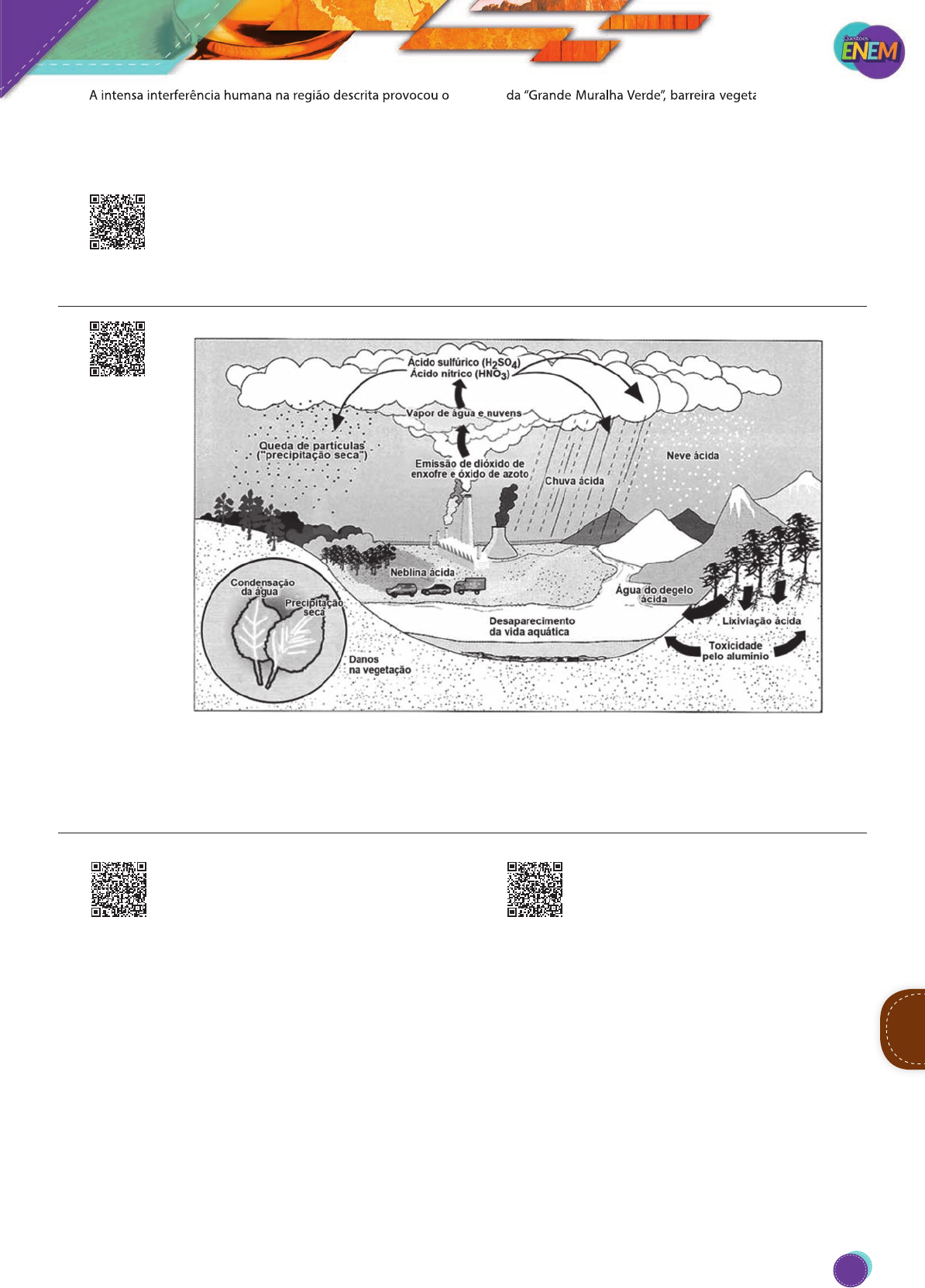 A intensa interferência humana na região descrita provocou o surgimento de uma área desértica em decorrência da A) erosão. B) salinização. C) laterização. D) compactação. E) sedimentação. 64. (Enem-2014) Antes de o sol começar a esquentar as terras da faixa ao sul do Saara conhecida como Sahel, duas dezenas de mulheres da aldeia Widou, no norte do Senegal, regam a horta cujas frutas e verduras alimentam a população local. É um pequeno terreno que, visto do céu, forma uma mancha verde – um dos primeiros pedaços 65. (Enem-2013) No esquema, o problema atmosférico relacionado ao ciclo da água acentuou-se após as revoluções industriais. Uma consequência direta desse problema está na A) redução da flora. B) elevação das marés. C) erosão das encostas. D) laterização dos solos. E) fragmentação das rochas. (Disponível em: . Acesso em: 23 ago. 2011. Adaptado.) da “Grande Muralha Verde”, barreira vegetal que se estenderá por 7 000 km do Senegal ao Djibuti, e é parte de um plano con- junto de vinte países africanos. O projeto ambiental descrito proporciona a seguinte conse- quência social imediata: A) facilita as trocas comerciais. B) soluciona os conflitos fundiários. C) restringe a diversidade biológica. D) fomenta a atividade de pastoreio. E) evita a expansão da desertificação. 66. (Enem-2011) A Floresta Amazônica, com toda a sua imensidão, não vai estar aí para sempre. Foi preciso alcançar toda essa taxa de desmatamento de quase 20 mil quilômetros quadrados ao ano, na última década do século XX, para que uma pequena parcela de brasi- leiros se desse conta de que o maior patrimônio natural do país está sendo torrado. (AB’SABER, A. Amazônia: do discurso à práxis. São Paulo: EdUSP, 1996.) Um processo econômico que tem contribuído na atualidade para acelerar o problema ambiental descrito é: A) expansão do Projeto Grande Carajás, com incentivos à che- gada de novas empresas mineradoras. B) difusão do cultivo da soja com a implantação de monocul- turas mecanizadas. C) construção da rodovia Transamazônica, com o objetivo de interligar a região Norte ao restante do país. D) criação de áreas extrativistas do látex das seringueiras para os chamados povos da floresta. E) ampliação do polo industrial da Zona Franca de Manaus, vi- sando atrair empresas nacionais e estrangeiras. 67. (Enem-2011) Um dos principais objetivos de se dar continuidade às pesquisas em erosão dos solos é o de procurar resolver os problemas oriundos desse pro- cesso, que, em última análise, geram uma série de impactos ambientais. Além disso, para a adoção de técnicas de conservação dos solos, é preciso conhecer como a água executa seu trabalho de remoção, transporte e deposição de sedimentos. A erosão causa, quase sempre, uma série de problemas ambien- tais, em nível local ou até mesmo em grandes áreas. (GUERRA, A. J. T. Processos erosivos nas encostas. In: GUERRA, A. J. T.; CUNHA, S. B. Geomorfologia: uma atualização de bases e conceitos. Rio de Janeiro: Bertrand Brasil, 2007. Adaptado.) A preservação do solo, principalmente em áreas de encostas, pode ser uma solução para evitar catástrofes em função da intensidade de fluxo hídrico. A prática humana que segue no caminho contrário a essa solução é A) a aração. B) o terraceamento. C) o pousio. D) a drenagem. E) o desmatamento. A intensa interferência humana na região descrita provocou o da “Grande Muralha Verde”, barreira vegetal que se estenderá GeografiaGeografia GeografiaGeografia 383 PG18EA445SD00_QE_2018_MIOLO.indb 383 26/02/2018 16:47:50