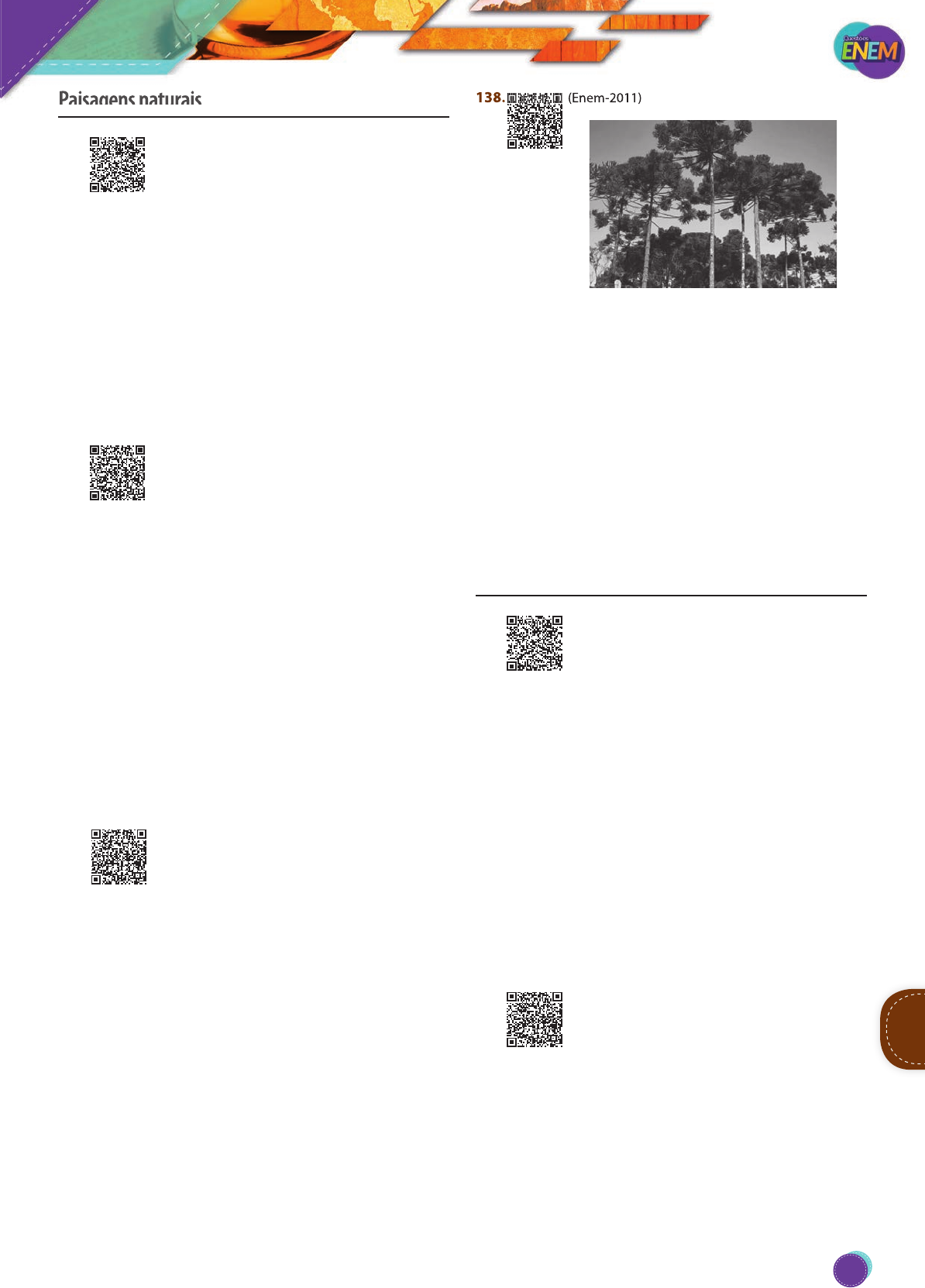 Paisagens naturais 135. (Enem-2017) Ao destruir uma paisagem de árvores de troncos retorcidos, folhas e arbustos ásperos sobre os solos ácidos, não raro laterizados ou tomados pelas formas bizarras dos cupinzeiros, essa modernização lineariza e aparentemente não permite que se questione a pretensão modernista de que a forma deve seguir a função. (HAESBAERT, R. "Gaúchos" e baianos no "novo" Nordeste: entre a globalização econômica e a reinvenção das identidades territoriais. ln: CASTRO, 1. E.; GOMES, P. C. C.; CORRÊA, R. L. (Org.). Brasil: questões atuais da reorganização do território. Rio de Janeiro: Bertrand Brasil, 2008.) O processo descrito ocorre em uma área biogeográfica com predomínio de vegetação A) tropófila e clima tropical. B) xerófila e clima semiárido. C) hidrófila e clima equatorial. D) aciculifoliada e clima subtropical. E) semidecídua e clima tropical úmido. 136. (Enem-2016) Texto I O Cerrado brasileiro apresenta diversos aspectos favoráveis, mas tem como problema a baixa fertilidade de seus solos. A grande maioria é ácido, com baixo pH. (Disponível em: . Acesso em: 21 dez. 2012. Adaptado.) Texto II O crescimento da participação da Região Central do Brasil na produção de soja foi estimulado, entre outros fatores, por avanços científicos em tecnologias para manejo de solos. (Disponível em: . Acesso em: 19 dez. 2012. Adaptado.) Nos textos, são apresentados aspectos do processo de ocupação de um bioma brasileiro. Uma tecnologia que permite corrigir os limites impostos pelas condições naturais está indicada em: A) Calagem. B) Hidroponia. C) Terraceamento. D) Cultivo orgânico. E) Rotação de culturas. 137. (Enem-2013) Então, a travessia das veredas sertanejas é mais exaustiva que a de uma estepe nua. Nesta, ao menos, o viajante tem o desafogo de um horizonte largo e a perspectiva das planuras francas. Ao passo que a outra o afoga; abrevia-lhe o olhar; agride-o e estonteia-o; enlaça-o na trama espinescente e não atrai; repulsa-o com as folhas urticantes, com o espinho, com os gravetos estalados em lanças, e desdobra-se-lhe na frente léguas e léguas, imutável no aspecto desolado; árvore sem folhas, de galhos estorcidos e secos, revoltos, entrecruzados, apontando rijamente no espaço ou estirando-se flexuosos pelo solo, lembrando um bracejar imenso, de tortura, da flora agonizante... (CUNHA, E. Os sertões. Disponível em: . Acesso em: 2 jun. 2012.) Os elementos da paisagem descritos no texto correspondem a aspectos biogeográficos presentes na A) composição de vegetação xerófila. B) formação de florestas latifoliadas. C) transição para mata de grande porte. D) adaptação à elevada salinidade. E) homogeneização da cobertura perenifólia. 138. (Enem-2011) (Disponível em: . Acesso em: 28 jul. 2010.) A imagem retrata a araucária, árvore que faz parte de um importante bioma brasileiro que, no entanto, já foi bastante degradado pela ocupação humana. Uma das formas de intervenção humana relacionada à degradação desse bioma foi A) o avanço do extrativismo de minerais metálicos voltados para a exportação na região Sudeste. B) a contínua ocupação agrícola intensiva de grãos na região Centro-Oeste do Brasil. C) o processo de desmatamento motivado pela expansão da atividade canavieira no Nordeste brasileiro. D) o avanço da indústria de papel e celulose a partir da explo- ração da madeira, extraída principalmente no Sul do Brasil. E) o adensamento do processo de favelização sobre áreas da Serra do Mar na região Sudeste. Espaço industrial 139. (Enem-2017) O fenômeno da mobilidade populacional vem, desde as últimas décadas do século XX, apresen- tando transformações significativas no seu compor- tamento, não só no Brasil como também em outras partes do mundo. Esses novos processos se materializam, entre outros aspectos, na dimensão interna, pelo redirecionamento dos fluxos migratórios para as cidades médias, em detrimento dos grandes centros urbanos; pelos deslocamentos de curta duração e a distâncias menores; pelos movimentos pendulares, que passam a assumir maior relevância nas estratégias de sobre- vivência, não mais restritos aos grandes aglomerados urbanos. (OLIVEIRA, L. A. P.; OLIVEIRA, A. T. R. Reflexões sobre os deslocamentos populacionais no Brasil. Rio de Janeiro: IBGE, 2011. Adaptado.) A redefinição dos fluxos migratórios internos no Brasil, no período apontado no texto, tem como causa a intensificação do processo de A) descapitalização do setor primário. B) ampliação da economia informal. C) tributação da área residencial citadina. D) desconcentração da atividade industrial. E) saturação da empregabilidade no setor terciário. 140. (Enem-2016) A mundialização introduz o aumento da produtividade do trabalho sem acumulação de capital, justamente pelo caráter divisível da forma técnica molecular-digital do que resulta a permanên- cia da má distribuição da renda: exemplificando mais uma vez, os vendedores de refrigerantes às portas dos estádios viram sua produtividade aumentada graças ao just in time dos fabricantes e distribuidores de bebidas, mas para realizar o valor de tais mercadorias, a forma do trabalho dos vendedores é a mais primitiva. Combinam-se, pois, acumulação molecular-digital com o puro uso da força de trabalho. (OLIVEIRA, F. Crítica à razão dualista e o ornitorrinco. Campinas: Boitempo, 2003.) Paisagens naturais 138. (Enem-2011) GeografiaGeografia GeografiaGeografia 397 PG18EA445SD00_QE_2018_MIOLO.indb 397 26/02/2018 16:48:04
