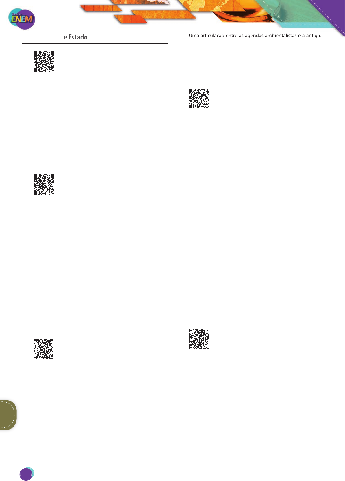 Poder, política e Estado 33. (Enem-2017) A participação da mulher no processo de decisão política ainda é extremamente limitada em praticamente todos os países, independentemen- te do regime econômico e social e da estrutura insti- tucional vigente em cada um deles. É fato público e notório, além de empiricamente comprovado, que as mulheres estão em geral sub-representadas nos órgãos do poder, pois a proporção não corresponde jamais ao peso relativo dessa parte da população. (TABAK, F. Mulheres públicas: participação política e poder. Rio de Janeiro: Letra Capital, 2002.) No âmbito do Poder Legislativo brasileiro, a tentativa de reverter esse quadro de sub-representação tem envolvido a implemen- tação, pelo Estado, de A) leis de combate à violência doméstica. B) cotas de gênero nas candidaturas partidárias. C) programas de mobilização política nas escolas. D) propagandas de incentivo ao voto consciente. E) apoio financeiro às lideranças femininas. 34. (Enem-2017) TEXTO I A Resolução nº 7 do Conselho Nacional de Justiça (CNJ) passou a disciplinar o exercício do nepotismo cruzado, isto é, a troca de parentes entre agentes para que tais parentes sejam contratados diretamente, sem concurso. Exemplificando: o desembargador A nomeia como assessor o filho do desembargador B que, em contrapartida, nomeia o filho deste como seu assessor. (COSTA, W. S. Do nepotismo cruzado: características e pressupostos. Jusnavigandi, n. 950, 8 fev. 2006.) TEXTO II No Brasil, pode-se dizer que só excepcionalmente tivemos um sistema administrativo e um corpo de funcionários puramente dedicados a interesses objetivos e fundados nesses interesses. (HOLANDA, S. B. Raízes do Brasil. Rio de Janeiro: José Olympio, 1993.) A administração pública no Brasil possui raízes históricas mar- cadas pela A) valorização do mérito individual. B) punição dos desvios de conduta. C) distinção entre o público e o privado. D) prevalência das vontades particulares. E) obediência a um ordenamento impessoal. 35. (Enem-2016) Cúpula dos Povos começa como contraponto à Rio+20 Enquanto a conferência oficial no Riocentro, na Barra, é restrita a participantes credenciados, que só entram depois de passar por um forte controle de segurança, a Cúpula dos Povos é aberta ao público, em tendas ao ar livre no Aterro do Flamengo. Ela é aberta também às tribos e discussões mais diversas, em mesas de debate e painéis geridos pelos próprios participantes, buscando promover a mobilização social. Problemas ambientais, econômi- cos, sociais, políticos e de minorias serão discutidos no evento, afirma uma ativista norte-americana, em alusão ao movimento que ocupou Wall Street, em Nova York, no ano passado. (Disponível em: . Acesso em: 14 ago. 2012.) Uma articulação entre as agendas ambientalistas e a antiglo- balização indica a A) humanização do sistema capitalista financeiro. B) consolidação do movimento operário internacional. C) promoção de consenso com as elites políticas locais. D) constituição de espaços de debates transversais globais. E) construção das pautas com os partidos políticos socialistas. 36. (Enem-2016) Texto I Até aqui expus a natureza do homem (cujo orgulho e outras paixões o obrigaram a submeter-se ao governo), juntamente com o grande poder do seu governante, o qual com- parei com o Leviatã, tirando essa comparação dos dois últimos versículos do capítulo 41 de Jó, onde Deus, após ter estabelecido o grande poder do Leviatã, lhe chamou Rei dos Soberbos. Não há nada na Terra, disse ele, que se lhe possa comparar. (HOBBES, T. O Leviatã. São Paulo: Martins Fontes, 2003.) Texto II Eu asseguro, tranquilamente, que o governo civil é a solução adequada para as inconveniências do estado de natureza, que devem certamente ser grandes quando os homens podem ser juízes em causa própria, pois é fácil imaginar que um homem tão injusto a ponto de lesar o irmão dificilmente será justo para condenar a si mesmo pela mesma ofensa. (LOCKE, J. Segundo tratado sobre o governo civil. Petrópolis: Vozes, 1994.) Thomas Hobbes e John Locke, importantes teóricos contratualis- tas, discutiram aspectos ligados à natureza humana e ao Estado. Thomas Hobbes, diferentemente de John Locke, entende o estado de natureza como um(a) A) condição de guerra de todos contra todos, miséria univer- sal, insegurança e medo da morte violenta. B) organização pré-social e pré-política em que o homem nasce com os direitos naturais: vida, liberdade, igualdade e propriedade. C) capricho típico da menoridade, que deve ser eliminado pela exigência moral, para que o homem possa constituir o Estado civil. D) situação em que os homens nascem como detentores de livre-arbítrio, mas são feridos em sua livre decisão pelo pe- cado original. E) estado de felicidade, saúde e liberdade que é destruído pela civilização, que perturba as relações sociais e violenta a humanidade. 37. (Enem-2016) Texto I Dezenas de milhares de pessoas compareceram à maior manifestação anti-troika (Comissão Europeia, Banco Central Europeu e FMI) em Atenas contra a austeridade e os cortes de gastos públicos aprovados neste domingo no parlamento grego. (Disponível em: . Acesso em: 8 nov. 2013.) Texto II As políticas de austeridade transferem o ônus econômico para as classes trabalhadoras. Para diminuir os prejuízos do capital financeiro, socializam as perdas entre as classes trabalhadoras. O capitalismo não foi capaz de integrar os trabalhadores e ao mesmo tempo protegê-los. (Entrevista com Ruy Braga. Revista IHU online. Disponível em: . Acesso em: 8 nov. 2013. Adaptado.) SociologiaSociologia Poder, política e Estado Uma articulação entre as agendas ambientalistas e a antiglo- SociologiaSociologia 410 PG18EA445SD00_QE_2018_MIOLO.indb 410 26/02/2018 16:48:17