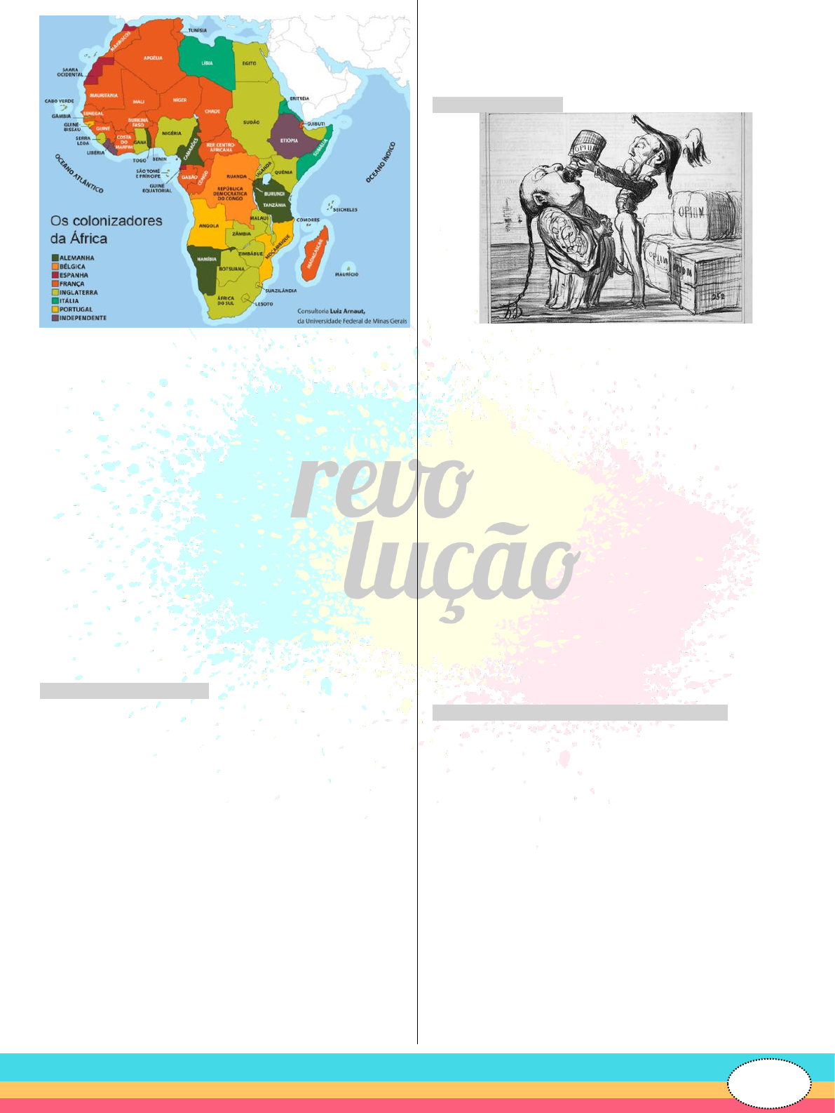 66 África, 1911 (Luiz Arnaut. Os colonizadores da África, disponível em ) A partir de seus conhecimentos e da comparação entre os dois mapas, pode-se afirmar que a) a partilha do continente africano ocorreu no início do sé- culo XIX, assegurando o equilíbrio entre as áreas territoriais controladas pelas potências europeias. b) o processo de libertação da África do domínio colonial europeu desenvolveu-se no decorrer do século XIX, a partir de acordos diplomáticos com as potências europeias. c) a ocupação do centro africano ocorreu no decorrer do século XIX e reafirmou a hegemonia das mesmas potências europeias que já colonizavam o litoral do continente. d) a ocupação principal da África ocorreu no decorrer do século XIX, culminando com a partilha do continente pelas potências europeias. e) o avanço da ocupação europeia para o centro do conti- nente africano foi pacífico e de natureza semelhante à do- minação do litoral no princípio do século XIX. 251. (PUCCamp SP/2019) Ao ser inaugurada em Paris, em 1900, a grandiosa Exposição Universal pretendia exibir uma civilização florescente, que tinha em seu nú- cleo a Europa, e entoar um vibrante hino de louvor ao progresso. [...] O fulgor do “Palácio da Eletricidade”, iluminado por 5 mil lâmpadas elétricas, literalmente ofuscava seus visitantes. [...] Vinte e quatro nações eu- ropeias e os Estados Unidos, além de países africanos, asiáticos e latino-americanos fizeram-se representar com pavilhões requintados. [...] Com o imperialismo em seu apogeu as representações de possessões coloni- ais distantes, sempre de opulento exotismo, transmiti- ram uma impressão avassaladora de domínio europeu no mundo. (Adaptado de: KERSHAW, Ian. De volta do Inferno: Europa, 1914- 1949. São Paulo: Companhia das Letras, 2016, p. 28-29) No contexto de apogeu do imperialismo europeu a que o texto se refere, as nações que se destacaram como os maiores impérios coloniais foram a) Império Austro-húngaro e Inglaterra. b) Estados Unidos e França. c) Portugal e Espanha. d) Inglaterra e França. e) Alemanha e Holanda. 252. (UNIT AL/2019) Disponível em: . Acesso em: 11 nov. 2018. A charge caracteriza um tipo de política externa desen- volvida pelos países capitalistas do século XIX, que pode ser identificada a) na Doutrina Monroe, formulada pelos Estados Unidos para impedir a ação do imperialismo britânico sobre as áreas de influência estadunidense na Ásia e América. b) no combate ao narcotráfico na América Latina, como jus- tificativa para a intervenção dos Estados Unidos na Bolívia e o controle estadunidense sobre o canal do Panamá. c) no estabelecimento da Lei Seca, nos Estados Unidos, que contribuiu para o surgimento de grupos mafiosos que dominavam o tráfico de drogas, cujos lucros financiavam movimentos armados marxistas. d) no processo de dominação inglesa sobre a Índia, base- ado na imposição de costumes ocidentais, como o uso de opiáceos, e na aliança com a minoria muçulmana contra os hindus liderados por Mahatma Gandhi. e) na política britânica na Ásia, que provocou a partilha da China entre as nações imperialistas ocidentais e a abertura ao capital estrangeiro, através da Guerra do Ópio. 253. (Faculdade Baiana de Direito BA/2018) “Sustento que somos a primeira raça no mundo, e quanto mais do mundo habitarmos, tanto melhor será para a raça hu- mana... Se houver um Deus, creio que Ele gostaria que eu pintasse o mapa da África com as cores britânicas.” Cecil Rhodes Disponível em: . Acesso em: ago. 2017. O pensamento de Cecil Rhodes reflete o processo polí- tico e econômico de a) estabelecimento das Cruzadas, pelas quais a nobreza feudal, interessada nas riquezas do norte da África, que bar- raram a expansão muçulmana, impedindo a conquista islâ- mica sobre o continente africano. b) expansão marítima e comercial mercantilista através das quais a conquista, o domínio e a partilha da África possibili- taram o controle da rota comercial de escravos e da sua utilização na exploração das riquezas africanas.