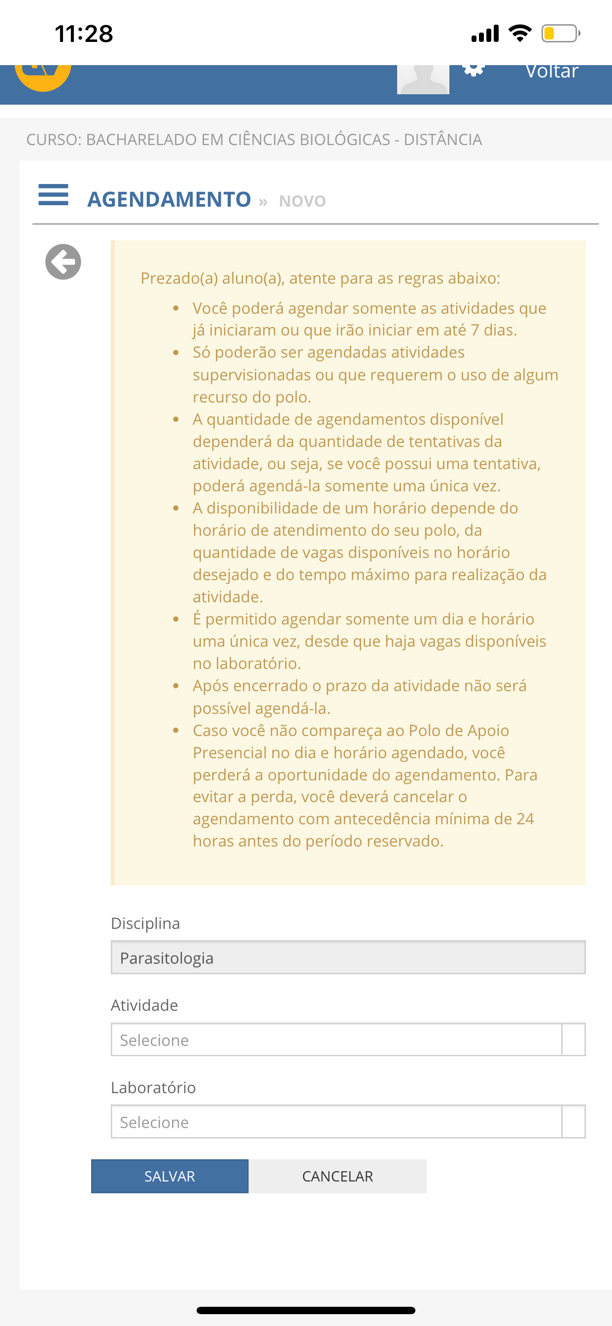 11:28 Voltar CURSO: BACHARELADO EM CIÊNCIAS BIOLÓGICAS DISTÂNCIA AGENDAMENTO NOVO Prezado(a) aluno(a), atente para as regras abaixo: Você poderá agendar somente as atividades que já iniciaram ou que irão iniciar em até 7 dias. Só poderão ser agendadas atividades supervisionadas ou que requerem o uso de algum recurso do polo. A quantidade de agendamentos disponível dependerá da quantidade de tentativas da atividade, ou seja, se você possui uma tentativa, poderá agendá-la somente uma única vez. A disponibilidade de um horário depende do horário de atendimento do seu polo, da quantidade de vagas disponíveis no horário desejado e do tempo máximo para realização da atividade. É permitido agendar somente um dia e horário uma única vez, desde que haja vagas disponíveis no laboratório. Após encerrado o prazo da atividade não será possível agendá-la. Caso você não compareça ao Polo de Apoio Presencial no dia e horário agendado, você perderá a oportunidade do agendamento. Para evitar a perda, você deverá cancelar o agendamento com antecedência mínima de 24 horas antes do período reservado. Disciplina Parasitologia Atividade Selecione Laboratório Selecione SALVAR CANCELAR