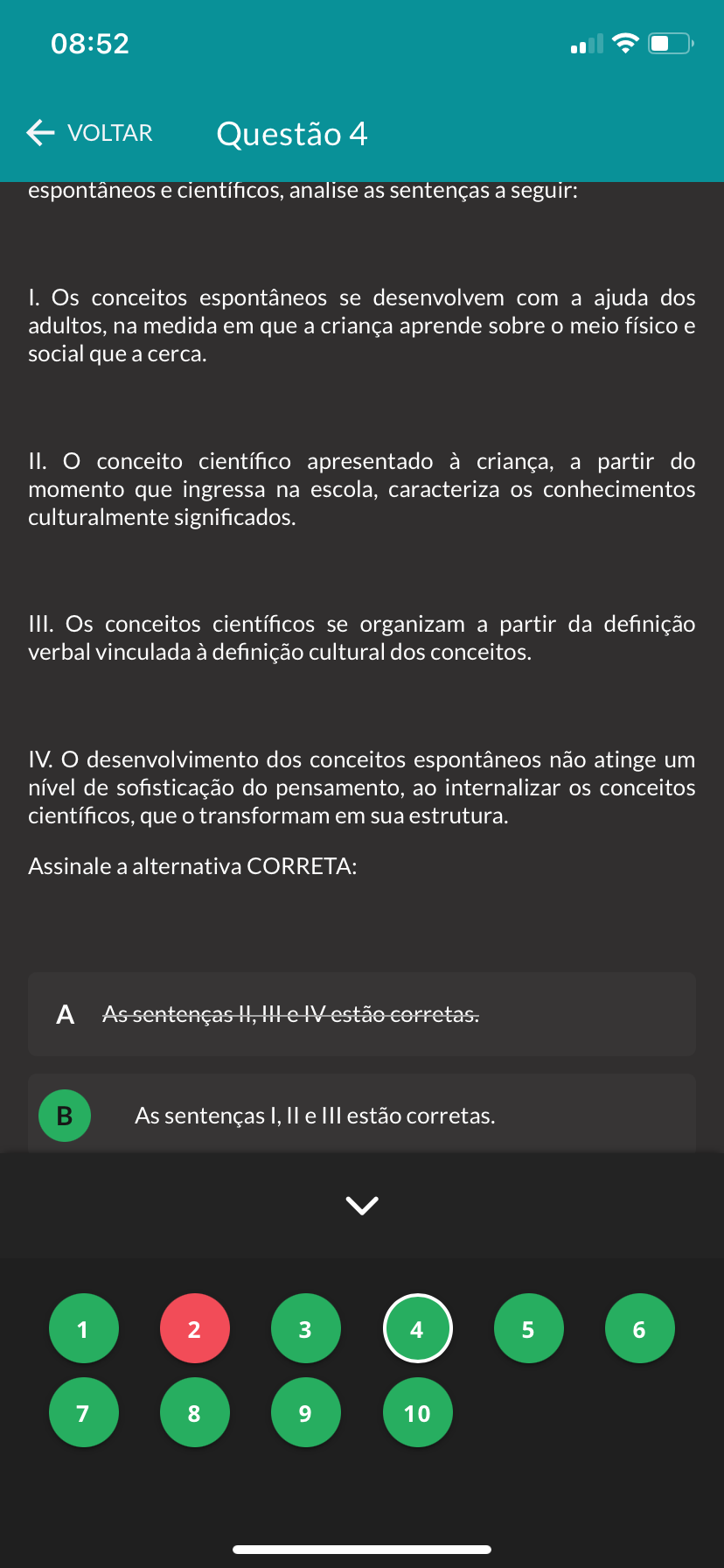 08:52 VOLTAR Questão 4 espontâneos e analise as sentenças a seguir: I. Os conceitos espontâneos se desenvolvem com a ajuda dos adultos, na medida em que a criança aprende sobre meio físico e social que a cerca. II. O conceito científico apresentado à criança, a partir do momento que ingressa na escola, caracteriza os conhecimentos culturalmente significados. III. Os conceitos científicos se organizam a partir da definição verbal vinculada à definição cultural dos conceitos. IV. O desenvolvimento dos conceitos espontâneos não atinge um nível de sofisticação do pensamento, ao internalizar os conceitos científicos, que transformam em sua estrutura. Assinale a alternativa CORRETA: A e corretas. B As sentenças I, II e III estão corretas. V 1 2 3 4 5 6 7 8 9 10