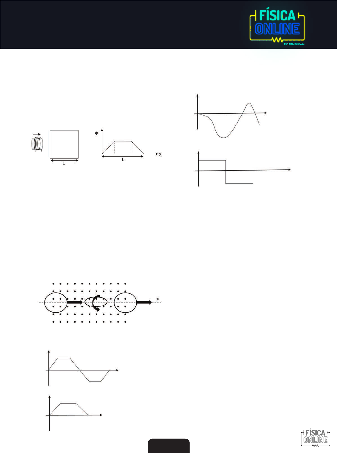 283 Fí si ca - 1. 00 0 Q ue st õe s FARADAY 1. Uma bobina entra e sai de uma região delimitada pelo quadrado, onde existe um campo magnético uniforme, provocando uma variação do uxo magnético (Φ) no interior da bobina, como mostra o gráfico a seguir. Para que tal fato aconteça, o campo magnético dentro da região quadrada deve ter sua direção e sentido A) perpendicular a esta folha, entrando nela. B) perpendicular a esta folha, saindo dela. C) horizontal para a esquerda. D) vertical para cima. 2. Uma espira circular se move na horizontal para a direita, entrando em uma região de campo magnético uniforme, conforme indica a figura a seguir. Ao chegar ao centro dessa região de campo, gira em 180o em torno do eixo x e, em eguida, continua se movendo na horizontal até sair da região de campo magnético. O gráfico que melhor representa o uxo magnético em função do tempo é dado por: A) B) C) D) 3. Sabendo que Φ0 = 4 . π . 10–7 T . m/A e utilizando π = 3, o valor do raio de uma espira circular, quando percorrida por uma corrente elétrica de intensidade i e que gera um campo magnético que possui como módulo o triplo do valor referente à corrente, é: A) 0,5 . 10–7 m B) 1,5 . 10–7 m C) 2 . 10–7 m D) 3 . 10–7 m 4. Sobre indução eletromagnética, assinale V, para verda- deiro e F, para falso. • Existindo o uxo magnético sobre uma espira, haverá corrente elétrica induzida. • Independente da posição da espira relativamente ao campo de indução magnética, existirá corrente elétrica induzida. • O uxo magnético depende do campo magnético indutor, da área da espira e do cosseno do ângulo entre o versor, que é perpendicular ao plano da espira, e o campo mag- nético indutor. • O módulo da força eletromotriz é dado pela rapidez com que ocorre a variação do uxo magnético. A) V-V-V-V B) F-F-F-F C) F-F-V-V D) F-V-F-V E) V-F-V-F