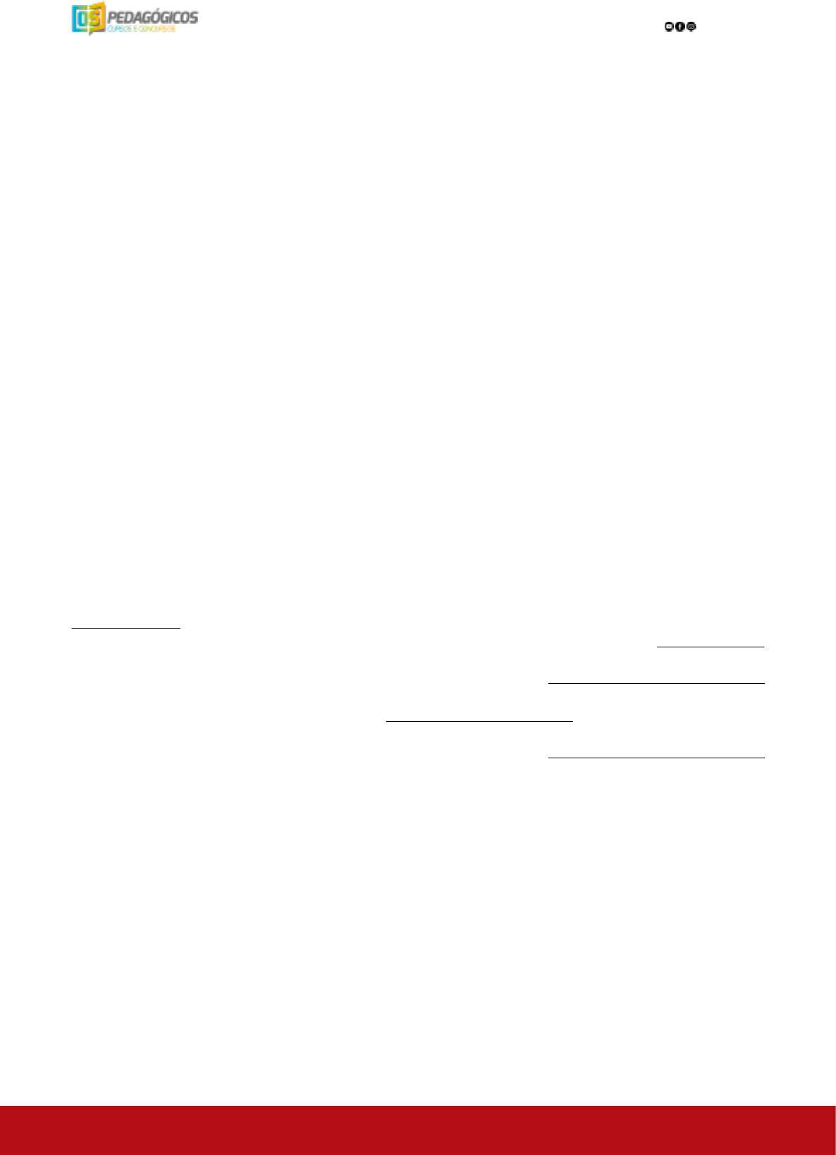 OSPEDAGÓGICOS SIMULADO DE CONHECIMENTOS PEDAGÓGICOS 216 724 - (Cacimbinhas – 2015 – MASTER) Questão 04. Nascida na Itália, Maria Montessori, foi a primeira mulher de seu país a formar-se em medicina. Inicialmente ela se dedicou às crianças com deficiência, depois com crianças normais. Em 1909, foi publicado os princípios básicos do Método Montessoriano. (GADOTTI, 2010) A este respeito observe quais afirmativas são VERDADEIRAS e quais são FALSAS: ( ) O professor deveria oferecer meios para a auto formação da criança. ( ) A proposta Montessoriana consiste no estímulo e na promoção da autoeducação da criança. ( ) Montessori reuniu algumas crianças abandonadas e passou a cuidar da educação daqueles pequenos. ( ) Seu método empregava bastante material pedagógico (cartões, blocos lógicos de encaixe, cubos, prismas, sólidos...) Todos os materiais eram destinados a desenvolver a atividade dos sentidos e a autocorreção. ( ) As atividades oferecidas aos alunos prezava a ênfase no desenvolvimento do mais simples ao mais complexo, do concreto ao abstrato. A ordem sequencial correta é: a) V – V – V – F – F b) V – V – F – V – F c) F – F – F – V – F d) V – F – V – V – F e) V – V – F – V – V 725 - (Cacimbinhas – 2015 – MASTER) Questão 05. Vygotsky e Piaget contribuíram significativamente para as ideias sobre a educação de crianças. Entre os dois há semelhanças: a relevância apontada nas conexões entre sujeito e meio; defendem a importância do respeito ao nível de aprendizagem entre mínimo e máximo conforme para cada aprendizado. (SOARES, 2013) Partindo dessa afirmativa, indique qual teórico se refere cada item descrito abaixo – Vygostsky ou Piaget. Privilegia o ambiente social, reconhece que variando o ambiente também varia o desenvolvimento. Não aceita uma visão universal sobre do desenvolvimento humano. Considera que desenvolvimento e aprendizagem são processos que se influenciam simultaneamente. A isto se conclui: quanto mais aprendizado, mais desenvolvimento. Os conhecimentos são elaborados espontaneamente pela criança, de acordo com o estágio de desenvolvimento que a criança se encontra. O pensamento aparece antes da linguagem, sendo uma das suas formas de expressão. Pensamento depende da coordenação dos esquemas sensório-motores e não da linguagem. Pensamento e linguagem são processos interdependentes desde o início da vida. A aquisição da linguagem da criança modifica suas funções mentais superiores, dando uma forma ao pensamento, possibilitando o aparecimento da imaginação, da memória e do planejamento da ação. A sequência certa sobre as ideias e seus respectivos teóricos é: a) Vygotsky, Piaget, Vygotsky, Vygotsky, Piaget b) Piaget, Piaget, Vygotsky, Vygotsky, Piaget c) Vygotsky, Piaget, Vygotsky, Piaget, Vygotsky d) Vygotsky, Vygotsky, Piaget, Piaget, Vygotsky d) Piaget, Vygotsky, Vygotsky, Piaget, Vygotsky