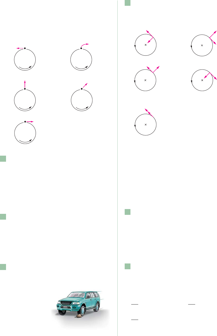 16 Depois que as roupas são lavadas, esse cilindro gira com alta velocidade no sentido indicado, a fim de que a água seja retirada das roupas. Olhando o ci- lindro de cima, indique a alternativa que possa re- presentar a trajetória de uma gota de água que sai do furo A: a) d) b) e) c) 80 (FUC-MT) Um ponto material percorre uma circunferência de raio igual a 0,1 m em movimento uniforme de forma, a dar 10 voltas por segundo. Determine o período do movimento. a) 10,0 s d) 0,1 s b) 10,0 Hz e) 100 s c) 0,1 Hz 81 (ITE-SP) Uma roda tem 0,4 m de raio e gira com velocidade constante, dando 20 voltas por minuto. Quanto tempo gasta um ponto de sua periferia para percorrer 200 m: a) 8 min c) 3,98 min b) 12,5 min d) n.d.a. 82 Uma pedra se engasta num pneu de automóvel que está com uma velocidade uniforme de 90 km/h. Considerando que o pneu não patina nem escorrega e que o sen- tido de movimento do automóvel é o positi- vo, calcule os valores máximo e mínimo da velocidade da pedra em relação ao solo. 83 (UFOP-MG) I – Os vetores velocidade (v) e acele- ração (a) de uma partícula em movimento circular uniforme, no sentido indicado, estão corretamente representados na figura: a) d) b) e) c) III – A partir das definições dos vetores velocidade (v) e aceleração (a) justifique a resposta dada no item anterior. III – Se o raio da circunferência é R � 2 m e a fre- qüência do movimento é f � 120 rotações por mi- nuto, calcule os módulos da velocidade e da acele- ração. Adote � 3,14. 84 (Puccamp-SP) Na última fila de poltronas de um ônibus, dois passageiros estão distando 2 m entre si. Se o ônibus faz uma curva fechada, de raio 40 m, com velocidade de 36 km/h, a diferença das veloci- dades dos passageiros é, aproximadamente, em metros por segundo, a) 0,1 b) 0,2 c) 0,5 d) 1,0 e) 1,5 85 (Unimep-SP) Uma partícula percorre uma traje- tória circular de raio 10 m com velocidade constan- te em módulo, gastando 4,0 s num percurso de 80 m. Assim sendo, o período e a aceleração desse movimento serão, respectivamente, iguais a: a) 2 s e zero d) 3 s e zero b) 3 s e 40 m/s2 e) s e 40 m/s2 c) s e 20 m/s2 A A A A A v a v a v a v a va