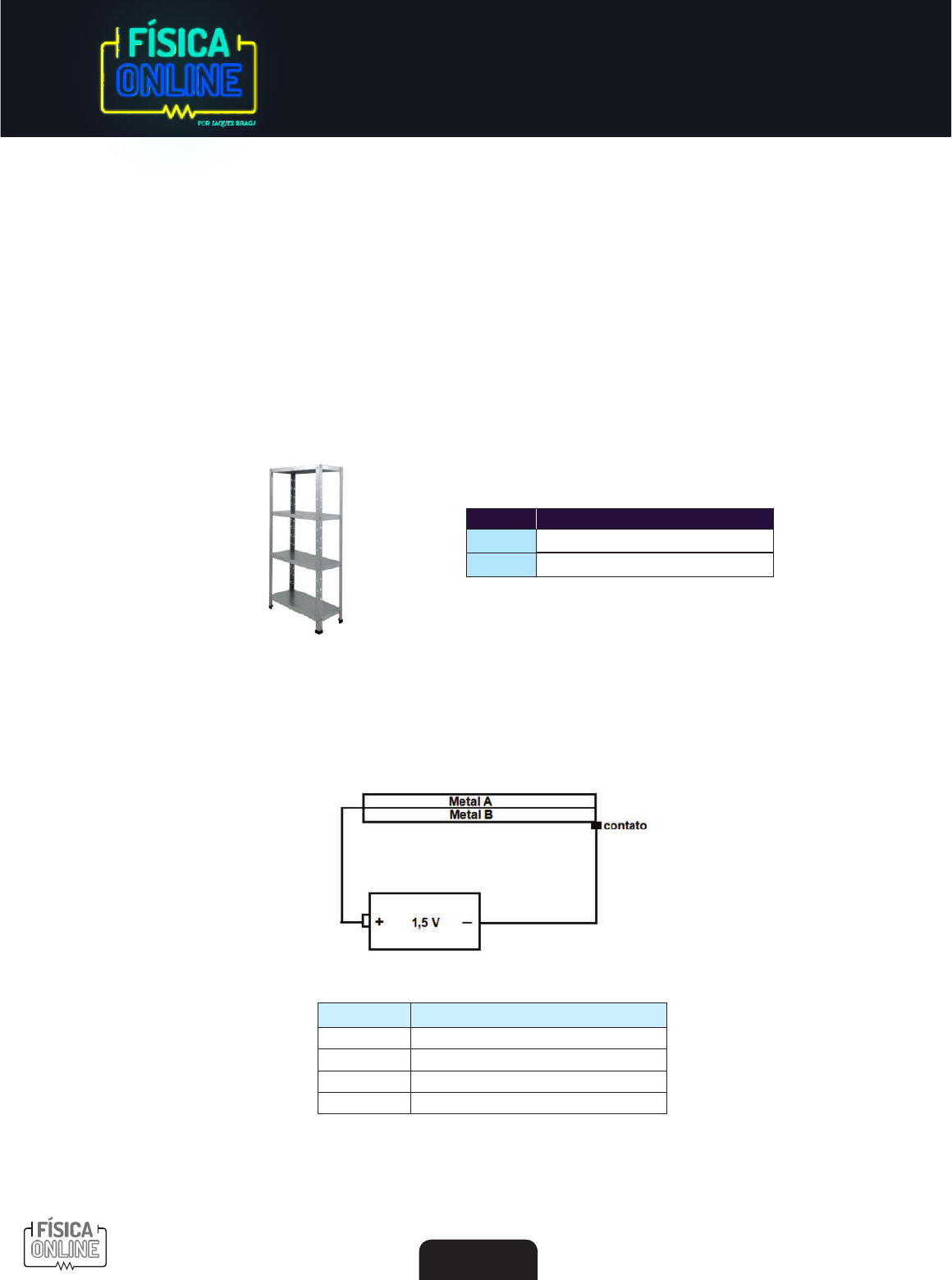 128 Fí si ca - 1. 00 0 Q ue st õe s A) DILATAÇÃO DOS SÓLIDOS E LÍQUIDOS_II 1. Quando um termômetro de mercúrio é aquecido, o nível do mercúrio parece momentaneamente abaixar, antes de se elevar. Isso ocorre porque A) o coeficiente de dilatação térmica do mercúrio é maior que o do vidro. B) o coeficiente de dilatação térmica do mercúrio é menor que o do vidro. C) o mercúrio tem alta condutividade térmica. D) o vidro tem baixa condutividade térmica. 2. Devido ao carregamento descuidado de uma companhia de mudanças, uma estante de aço (como a representada na figura a seguir) tem as duas hastes de sustentação do lado esquerdo amassadas. A companhia se encarrega do conserto, porém tais hastes são substituídas por outras de alumínio. MATERIAL COEFICIENTE DE DILATAÇÃO LINEAR (°C–1) AÇO 1,1 . 10–5 ALUMÍNIO 2,4 . 10–5 Sabendo que as hastes, a uma dada temperatura, possuem o mesmo comprimento de 2,0 metros, qual será a diferença de tamanho entre as hastes do lado direito e do lado esquerdo se essa estante sofrer uma variação de temperatura de 50 oC? A) 1,0 mm B) 2,4 mm C) 1,3 mm D) 3,5 mm 3. Para testar experimentalmente os conhecimentos adquiridos nas aulas de Física, Joãozinho decidiu construir uma lâmina bimetálica. Para isso, ele precisará utilizar duas tiras de dois metais, A e B, com mesmo comprimento inicial à temperatura ambiente e ligar a lâmina, utilizando um fio condutor, a uma pilha de 1,5 volts. A tabela mostra quatro materiais de que Joãozinho dispõe para montar o experimento desejado. Material Coeficiente de dilatação (10-6 ºC-1) Aço 11 Níquel 13 Cobre 17 Alumínio 24 Dentre os pares de metais apresentados a seguir, assinale aquele que deverá ser utilizado para que a lâmina se afaste do con- tato devido ao aquecimento provocado pelo curto-circuito e desarme o circuito elétrico com a MENOR variação de temperatura. A) Metal A: aço e metal B: níquel. B) Metal A: cobre e metal B: alumínio. C) Metal A: alumínio e metal B: aço. D) Metal A: cobre e metal B: níquel.