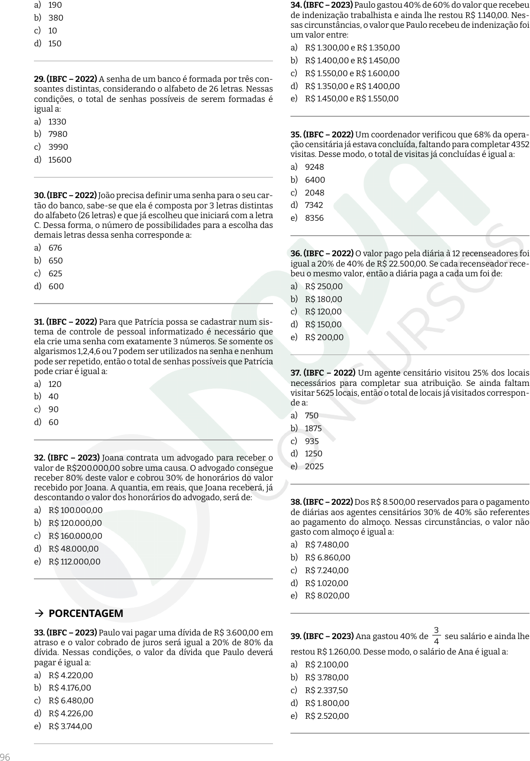 Ste ffa ny d a S ilv a A bid el - 1 64 .02 3.5 27 -2 1 96 a) 190 b) 380 c) 10 d) 150 29. (IBFC – 2022) A senha de um banco é formada por três con- soantes distintas, considerando o alfabeto de 26 letras. Nessas condições, o total de senhas possíveis de serem formadas é igual a: a) 1330 b) 7980 c) 3990 d) 15600 30. (IBFC – 2022) João precisa definir uma senha para o seu car- tão do banco, sabe-se que ela é composta por 3 letras distintas do alfabeto (26 letras) e que já escolheu que iniciará com a letra C. Dessa forma, o número de possibilidades para a escolha das demais letras dessa senha corresponde a: a) 676 b) 650 c) 625 d) 600 31. (IBFC – 2022) Para que Patrícia possa se cadastrar num sis- tema de controle de pessoal informatizado é necessário que ela crie uma senha com exatamente 3 números. Se somente os algarismos 1,2,4,6 ou 7 podem ser utilizados na senha e nenhum pode ser repetido, então o total de senhas possíveis que Patrícia pode criar é igual a: a) 120 b) 40 c) 90 d) 60 32. (IBFC – 2023) Joana contrata um advogado para receber o valor de R$200.000,00 sobre uma causa. O advogado consegue receber 80% deste valor e cobrou 30% de honorários do valor recebido por Joana. A quantia, em reais, que Joana receberá, já descontando o valor dos honorários do advogado, será de: a) R$ 100.000,00 b) R$ 120.000,00 c) R$ 160.000,00 d) R$ 48.000,00 e) R$ 112.000,00 Æ PORCENTAGEM 33. (IBFC – 2023) Paulo vai pagar uma dívida de R$ 3.600,00 em atraso e o valor cobrado de juros será igual a 20% de 80% da dívida. Nessas condições, o valor da dívida que Paulo deverá pagar é igual a: a) R$ 4.220,00 b) R$ 4.176,00 c) R$ 6.480,00 d) R$ 4.226,00 e) R$ 3.744,00 34. (IBFC – 2023) Paulo gastou 40% de 60% do valor que recebeu de indenização trabalhista e ainda lhe restou R$ 1.140,00. Nes- sas circunstâncias, o valor que Paulo recebeu de indenização foi um valor entre: a) R$ 1.300,00 e R$ 1.350,00 b) R$ 1.400,00 e R$ 1.450,00 c) R$ 1.550,00 e R$ 1.600,00 d) R$ 1.350,00 e R$ 1.400,00 e) R$ 1.450,00 e R$ 1.550,00 35. (IBFC – 2022) Um coordenador verificou que 68% da opera- ção censitária já estava concluída, faltando para completar 4352 visitas. Desse modo, o total de visitas já concluídas é igual a: a) 9248 b) 6400 c) 2048 d) 7342 e) 8356 36. (IBFC – 2022) O valor pago pela diária à 12 recenseadores foi igual a 20% de 40% de R$ 22.500,00. Se cada recenseador rece- beu o mesmo valor, então a diária paga a cada um foi de: a) R$ 250,00 b) R$ 180,00 c) R$ 120,00 d) R$ 150,00 e) R$ 200,00 37. (IBFC – 2022) Um agente censitário visitou 25% dos locais necessários para completar sua atribuição. Se ainda faltam visitar 5625 locais, então o total de locais já visitados correspon- de a: a) 750 b) 1875 c) 935 d) 1250 e) 2025 38. (IBFC – 2022) Dos R$ 8.500,00 reservados para o pagamento de diárias aos agentes censitários 30% de 40% são referentes ao pagamento do almoço. Nessas circunstâncias, o valor não gasto com almoço é igual a: a) R$ 7.480,00 b) R$ 6.860,00 c) R$ 7.240,00 d) R$ 1.020,00 e) R$ 8.020,00 39. (IBFC – 2023) Ana gastou 40% de 4 3 seu salário e ainda lhe restou R$ 1.260,00. Desse modo, o salário de Ana é igual a: a) R$ 2.100,00 b) R$ 3.780,00 c) R$ 2.337,50 d) R$ 1.800,00 e) R$ 2.520,00 O conteúdo deste livro eletrônico é licenciado para Steffany da Silva Abidel - 164.023.527-21, vedada, por quaisquer meios e a qualquer título, a sua reprodução, cópia, divulgação ou distribuição, sujeitando-se aos infratores à responsabilização civil e criminal.