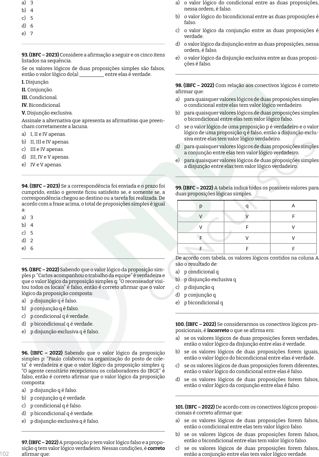 Ste ffa ny d a S ilv a A bid el - 1 64 .02 3.5 27 -2 1 102 a) 3 b) 4 c) 5 d) 6 e) 7 93. (IBFC – 2023) Considere a afirmação a seguir e os cinco itens listados na sequência. Se os valores lógicos de duas proposições simples são falsos, então o valor lógico do(a) entre elas é verdade. I. Disjunção. II. Conjunção. III. Condicional. IV. Bicondicional. V. Disjunção exclusiva. Assinale a alternativa que apresenta as afirmativas que preen- cham corretamente a lacuna. a) I, II e IV apenas. b) II, III e IV apenas. c) III e IV apenas. d) III, IV e V apenas. e) IV e V apenas. 94. (IBFC – 2023) Se a correspondência foi enviada e o prazo foi cumprido, então o gerente ficou satisfeito se, e somente se, a correspondência chegou ao destino ou a tarefa foi realizada. De acordo com a frase acima, o total de proposições simples é igual a: a) 3 b) 4 c) 5 d) 2 e) 6 95. (IBFC – 2022) Sabendo que o valor lógico da proposição sim- ples p: “Carlos acompanhou o trabalho da equipe” é verdadeira e que o valor lógico da proposição simples q: “O recenseador visi- tou todos os locais” é falso, então é correto afirmar que o valor lógico da proposição composta: a) p disjunção q é falso. b) p conjunção q é falso. c) p condicional q é verdade. d) p bicondicional q é verdade. e) p disjunção exclusiva q é falso. 96. (IBFC – 2022) Sabendo que o valor lógico da proposição simples p: “Paulo colaborou na organização do posto de cole- ta” é verdadeira e que o valor lógico da proposição simples q: “O agente censitário recepcionou os colaboradores do IBGE” é falso, então é correto afirmar que o valor lógico da proposição composta: a) p disjunção q é falso. b) p conjunção q é verdade. c) p condicional q é falso. d) p bicondicional q é verdade. e) p disjunção exclusiva q é falso. 97. (IBFC – 2022) A proposição p tem valor lógico falso e a propo- sição q tem valor lógico verdadeiro. Nessas condições, é correto afirmar que: a) o valor lógico do condicional entre as duas proposições, nessa ordem, é falso. b) o valor lógico do bicondicional entre as duas proposições é falso. c) o valor lógico da conjunção entre as duas proposições é verdade. d) o valor lógico da disjunção entre as duas proposições, nessa ordem, é falso. e) o valor lógico da disjunção exclusiva entre as duas proposi- ções é falso. 98. (IBFC – 2022) Com relação aos conectivos lógicos é correto afirmar que: a) para quaisquer valores lógicos de duas proposições simples o condicional entre elas tem valor lógico verdadeiro. b) para quaisquer valores lógicos de duas proposições simples o bicondicional entre elas tem valor lógico falso. c) se o valor lógico de uma proposição p é verdadeiro e o valor lógico de uma proposição q é falso, então a disjunção exclu- siva entre elas tem valor lógico verdadeiro. d) para quaisquer valores lógicos de duas proposições simples a conjunção entre elas tem valor lógico verdadeiro. e) para quaisquer valores lógicos de duas proposições simples a disjunção entre elas tem valor lógico verdadeiro. 99. (IBFC – 2022) A tabela indica todos os possíveis valores para duas proposições lógicas simples. p q A V V F V F V F V V F F F De acordo com tabela, os valores lógicos contidos na coluna A são o resultado de: a) p condicional q b) p disjunção exclusiva q c) p disjunção q d) p conjunção q e) p bicondicional q 100. (IBFC – 2022) Se considerarmos os conectivos lógicos pro- posicionais, é incorreto o que se afirma em: a) se os valores lógicos de duas proposições forem verdades, então o valor lógico da disjunção entre elas é verdade. b) se os valores lógicos de duas proposições forem iguais, então o valor lógico do bicondicional entre elas é verdade. c) se os valores lógicos de duas proposições forem diferentes, então o valor lógico do condicional entre elas é falso. d) se os valores lógicos de duas proposições forem falsos, então o valor lógico da conjunção entre elas é falso. 101. (IBFC – 2022) De acordo com os conectivos lógicos proposi- cionais é correto afirmar que: a) se os valores lógicos de duas proposições forem falsos, então o condicional entre elas tem valor lógico falso. b) se os valores lógicos de duas proposições forem falsos, então o bicondicional entre elas tem valor lógico falso. c) se os valores lógicos de duas proposições forem falsos, então a conjunção entre elas tem valor lógico verdade. O conteúdo deste livro eletrônico é licenciado para Steffany da Silva Abidel - 164.023.527-21, vedada, por quaisquer meios e a qualquer título, a sua reprodução, cópia, divulgação ou distribuição, sujeitando-se aos infratores à responsabilização civil e criminal.