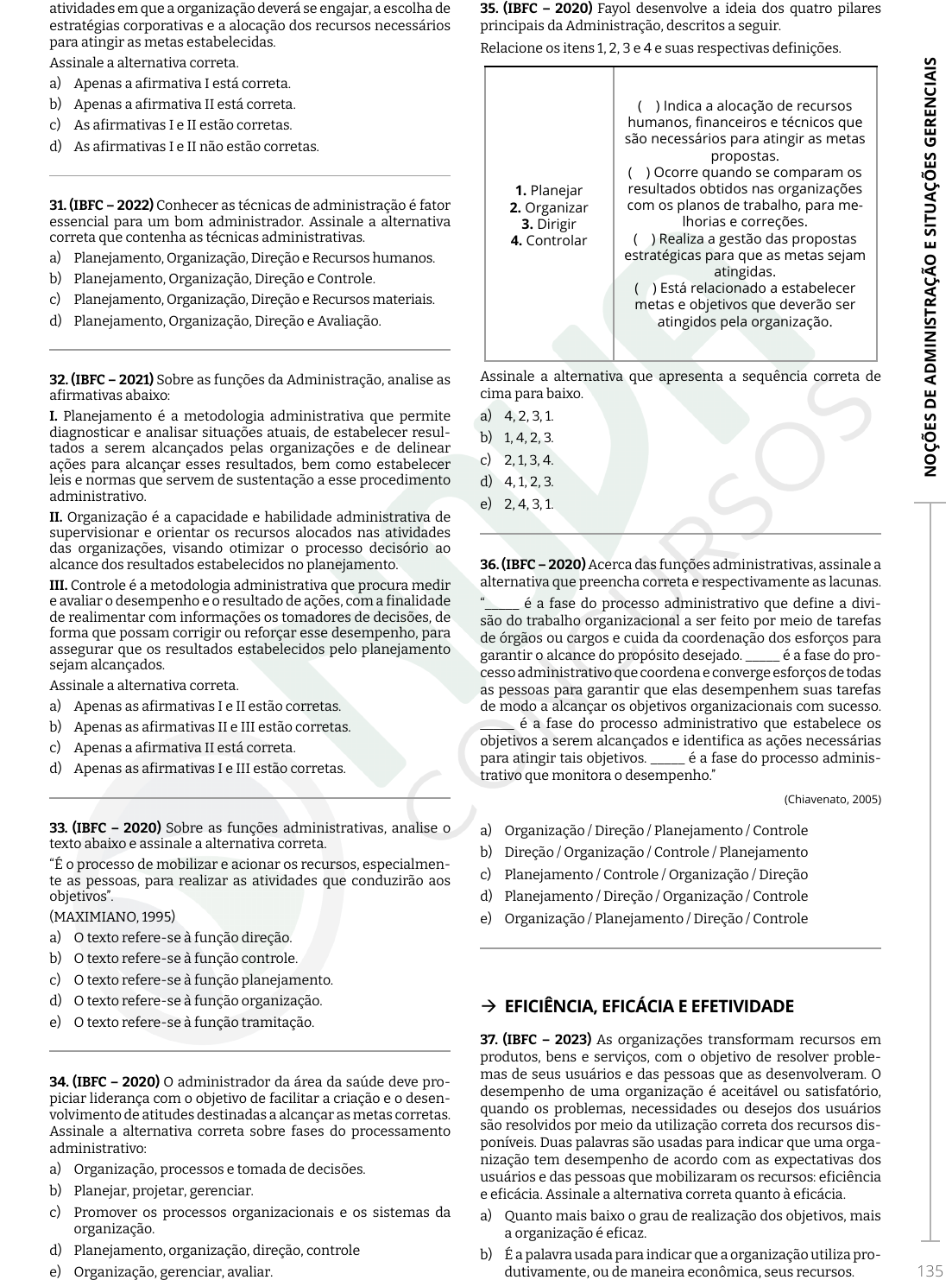 Ste ffa ny d a S ilv a A bid el - 1 64 .02 3.5 27 -2 1 N O ÇÕ ES D E A D M IN IS TR A ÇÃ O E S IT U A ÇÕ ES G ER EN CI A IS 135 atividades em que a organização deverá se engajar, a escolha de estratégias corporativas e a alocação dos recursos necessários para atingir as metas estabelecidas. Assinale a alternativa correta. a) Apenas a afirmativa I está correta. b) Apenas a afirmativa II está correta. c) As afirmativas I e II estão corretas. d) As afirmativas I e II não estão corretas. 31. (IBFC – 2022) Conhecer as técnicas de administração é fator essencial para um bom administrador. Assinale a alternativa correta que contenha as técnicas administrativas. a) Planejamento, Organização, Direção e Recursos humanos. b) Planejamento, Organização, Direção e Controle. c) Planejamento, Organização, Direção e Recursos materiais. d) Planejamento, Organização, Direção e Avaliação. 32. (IBFC – 2021) Sobre as funções da Administração, analise as afirmativas abaixo: I. Planejamento é a metodologia administrativa que permite diagnosticar e analisar situações atuais, de estabelecer resul- tados a serem alcançados pelas organizações e de delinear ações para alcançar esses resultados, bem como estabelecer leis e normas que servem de sustentação a esse procedimento administrativo. II. Organização é a capacidade e habilidade administrativa de supervisionar e orientar os recursos alocados nas atividades das organizações, visando otimizar o processo decisório ao alcance dos resultados estabelecidos no planejamento. III. Controle é a metodologia administrativa que procura medir e avaliar o desempenho e o resultado de ações, com a finalidade de realimentar com informações os tomadores de decisões, de forma que possam corrigir ou reforçar esse desempenho, para assegurar que os resultados estabelecidos pelo planejamento sejam alcançados. Assinale a alternativa correta. a) Apenas as afirmativas I e II estão corretas. b) Apenas as afirmativas II e III estão corretas. c) Apenas a afirmativa II está correta. d) Apenas as afirmativas I e III estão corretas. 33. (IBFC – 2020) Sobre as funções administrativas, analise o texto abaixo e assinale a alternativa correta. “É o processo de mobilizar e acionar os recursos, especialmen- te as pessoas, para realizar as atividades que conduzirão aos objetivos”. (MAXIMIANO, 1995) a) O texto refere-se à função direção. b) O texto refere-se à função controle. c) O texto refere-se à função planejamento. d) O texto refere-se à função organização. e) O texto refere-se à função tramitação. 34. (IBFC – 2020) O administrador da área da saúde deve pro- piciar liderança com o objetivo de facilitar a criação e o desen- volvimento de atitudes destinadas a alcançar as metas corretas. Assinale a alternativa correta sobre fases do processamento administrativo: a) Organização, processos e tomada de decisões. b) Planejar, projetar, gerenciar. c) Promover os processos organizacionais e os sistemas da organização. d) Planejamento, organização, direção, controle e) Organização, gerenciar, avaliar. 35. (IBFC – 2020) Fayol desenvolve a ideia dos quatro pilares principais da Administração, descritos a seguir. Relacione os itens 1, 2, 3 e 4 e suas respectivas definições. 1. Planejar 2. Organizar 3. Dirigir 4. Controlar ( ) Indica a alocação de recursos humanos, financeiros e técnicos que são necessários para atingir as metas propostas. ( ) Ocorre quando se comparam os resultados obtidos nas organizações com os planos de trabalho, para me- lhorias e correções. ( ) Realiza a gestão das propostas estratégicas para que as metas sejam atingidas. ( ) Está relacionado a estabelecer metas e objetivos que deverão ser atingidos pela organização. Assinale a alternativa que apresenta a sequência correta de cima para baixo. a) 4, 2, 3, 1. b) 1, 4, 2, 3. c) 2, 1, 3, 4. d) 4, 1, 2, 3. e) 2, 4, 3, 1. 36. (IBFC – 2020) Acerca das funções administrativas, assinale a alternativa que preencha correta e respectivamente as lacunas. “_____ é a fase do processo administrativo que define a divi- são do trabalho organizacional a ser feito por meio de tarefas de órgãos ou cargos e cuida da coordenação dos esforços para garantir o alcance do propósito desejado. _____ é a fase do pro- cesso administrativo que coordena e converge esforços de todas as pessoas para garantir que elas desempenhem suas tarefas de modo a alcançar os objetivos organizacionais com sucesso. _____ é a fase do processo administrativo que estabelece os objetivos a serem alcançados e identifica as ações necessárias para atingir tais objetivos. _____ é a fase do processo adminis- trativo que monitora o desempenho.” (Chiavenato, 2005) a) Organização / Direção / Planejamento / Controle b) Direção / Organização / Controle / Planejamento c) Planejamento / Controle / Organização / Direção d) Planejamento / Direção / Organização / Controle e) Organização / Planejamento / Direção / Controle Æ EFICIÊNCIA, EFICÁCIA E EFETIVIDADE 37. (IBFC – 2023) As organizações transformam recursos em produtos, bens e serviços, com o objetivo de resolver proble- mas de seus usuários e das pessoas que as desenvolveram. O desempenho de uma organização é aceitável ou satisfatório, quando os problemas, necessidades ou desejos dos usuários são resolvidos por meio da utilização correta dos recursos dis- poníveis. Duas palavras são usadas para indicar que uma orga- nização tem desempenho de acordo com as expectativas dos usuários e das pessoas que mobilizaram os recursos: eficiência e eficácia. Assinale a alternativa correta quanto à eficácia. a) Quanto mais baixo o grau de realização dos objetivos, mais a organização é eficaz. b) É a palavra usada para indicar que a organização utiliza pro- dutivamente, ou de maneira econômica, seus recursos. O conteúdo deste livro ele