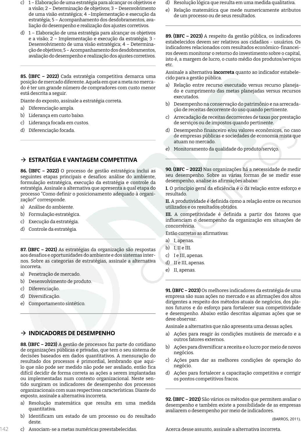 Ste ffa ny d a S ilv a A bid el - 1 64 .02 3.5 27 -2 1 142 c) 1 – Elaboração de uma estratégia para alcançar os objetivos e a visão; 2 – Determinação de objetivos; 3 – Desenvolvimento de uma visão estratégica; 4 –Implementação e execução da estratégia; 5 – Acompanhamento dos desdobramentos, ava- liação do desempenho e realização dos ajustes corretivos. d) 1 – Elaboração de uma estratégia para alcançar os objetivos e a visão; 2 – Implementação e execução da estratégia; 3 - Desenvolvimento de uma visão estratégica; 4 – Determina- ção de objetivos; 5 – Acompanhamento dos desdobramentos, avaliação do desempenho e realização dos ajustes corretivos. 85. (IBFC – 2022) Cada estratégia competitiva demarca uma posição de mercado diferente. Aquela em que a meta no merca- do é ter um grande número de compradores com custo menor está descrita a seguir. Diante do exposto, assinale a estratégia correta. a) Diferenciação ampla. b) Liderança em custo baixo. c) Liderança focada em custos. d) Diferenciação focada. Æ ESTRATÉGIA E VANTAGEM COMPETITIVA 86. (IBFC – 2022) O processo de gestão estratégica inclui as seguintes etapas principais e desafios: análise do ambiente, formulação estratégica, execução da estratégia e controle da estratégia. Assinale a alternativa que apresenta a qual etapa do processo “Como definir o posicionamento adequado à organi- zação?” corresponde. a) Análise do ambiente. b) Formulação estratégica. c) Execução da estratégia. d) Controle da estratégia. 87. (IBFC – 2021) As estratégias da organização são respostas aos desafios e oportunidades do ambiente e dos sistemas inter- nos. Sobre as categorias de estratégias, assinale a alternativa incorreta. a) Penetração de mercado. b) Desenvolvimento de produto. c) Diferenciação. d) Diversificação. e) Comportamento sintético. Æ INDICADORES DE DESEMPENHO 88. (IBFC – 2023) A gestão de processos faz parte do cotidiano de organizações públicas e privadas, que tem o seu sistema de decisões baseados em dados quantitativos. A mensuração do resultado dos processos é primordial, lembrando que aqui- lo que não pode ser medido não pode ser avaliado, então fica difícil decidir de forma correta as ações a serem implantadas ou implementadas num contexto organizacional. Neste sen- tido surgiram os indicadores de desempenho dos processos organizacionais com suas respectivas características. Diante do exposto, assinale a alternativa incorreta. a) Resolução matemática que resulta em uma medida quantitativa. b) Identificam um estado de um processo ou do resultado deste. c) Associam-se a metas numéricas preestabelecidas. d) Resolução lógica que resulta em uma medida qualitativa. e) Relação matemática que mede numericamente atributos de um processo ou de seus resultados. 89. (IBFC – 2023) A respeito da gestão pública, os indicadores estabelecidos devem ser relativos aos cidadãos - usuários. Os indicadores relacionados com resultados econômico-financei- ros devem monitorar o retorno do investimento sobre o capital, isto é, a margem de lucro, o custo médio dos produtos/serviços etc. Assinale a alternativa incorreta quanto ao indicador estabele- cido para a gestão pública. a) Relação entre recurso executado versus recurso planeja- do e cumprimento das metas planejadas versus recursos executados. b) Desempenho na conservação do patrimônio e na arrecada- ção de receitas decorrente do uso quando pertinente. c) Arrecadação de receitas decorrentes de taxas por prestação de serviços ou de impostos quando pertinente. d) Desempenho financeiro e/ou valores econômicos, no caso de empresas públicas e sociedades de economia mista que atuam no mercado. e) Monitoramento da qualidade do produto/serviço. 90. (IBFC – 2022) Nas organizações há a necessidade de medir seu desempenho. Sobre as várias formas de se medir esse desempenho, analise as afirmações abaixo. I. O princípio geral da eficiência é o da relação entre esforço e resultado. II. A produtividade é definida como a relação entre os recursos utilizados e os resultados obtidos. III. A competitividade é definida a partir dos fatores que influenciam o desempenho da organização em situações de concorrência. Estão corretas as afirmativas: a) I, apenas. b) I, II e III. c) I e III, apenas. d) II e III, apenas. e) II, apenas. 91. (IBFC – 2023) Os melhores indicadores da estratégia de uma empresa são suas ações no mercado e as afirmações dos altos dirigentes a respeito dos métodos atuais de negócios, dos pla- nos futuros e do esforço para fortalecer sua competitividade e desempenho. Abaixo estão descritas algumas ações que se deve observar. Assinale a alternativa que não apresenta uma dessas ações. a) Ações para reagir às condições mutáveis de mercado e a outros fatores externos. b) Ações para diversificar a receita e o lucro por meio de novos negócios. c) Ações para dar as melhores condições de operação do negócio. d) Ações para fortalecer a capacitação competitiva e corrigir os pontos competitivos fracos. 92. (IBFC – 2021) São vários os métodos que permitem avaliar o desempenho e também existe a possibilidade de as empresas avaliarem o desempenho por meio de indicadores. (BARROS, 2011). Acerca desse assunto, assinale a alternativa incorreta. O conteúdo deste livro eletrônico é licenciado para Steffany da Silva Abidel - 164.023.527-21, vedada, por quaisquer meios e a qualquer título, a sua reprodução, cópia, divulgação ou distribuição, sujeitando-se aos infratores à responsabilização civil e criminal.