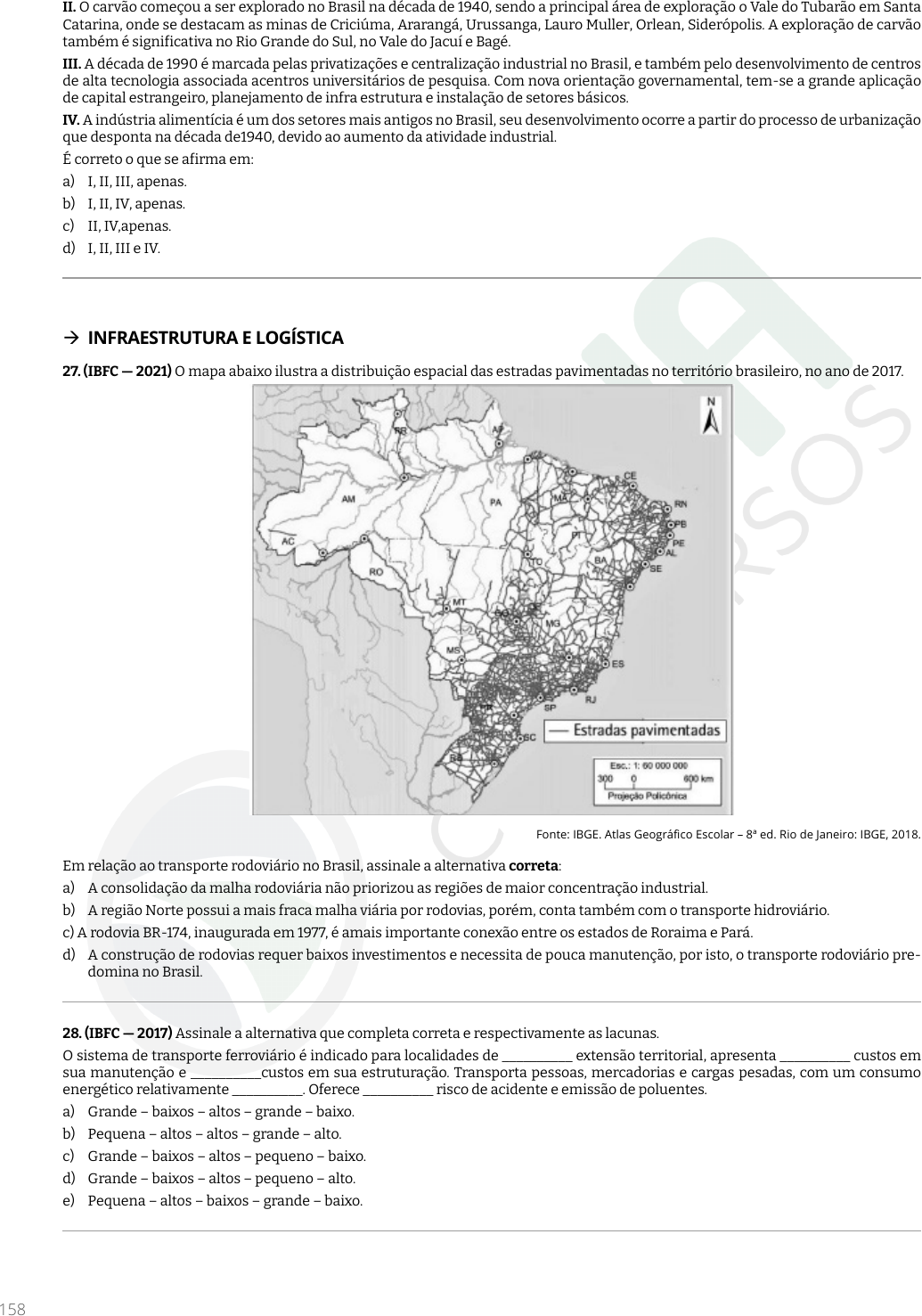 Ste ffa ny d a S ilv a A bid el - 1 64 .02 3.5 27 -2 1 158 II. O carvão começou a ser explorado no Brasil na década de 1940, sendo a principal área de exploração o Vale do Tubarão em Santa Catarina, onde se destacam as minas de Criciúma, Ararangá, Urussanga, Lauro Muller, Orlean, Siderópolis. A exploração de carvão também é significativa no Rio Grande do Sul, no Vale do Jacuí e Bagé. III. A década de 1990 é marcada pelas privatizações e centralização industrial no Brasil, e também pelo desenvolvimento de centros de alta tecnologia associada acentros universitários de pesquisa. Com nova orientação governamental, tem-se a grande aplicação de capital estrangeiro, planejamento de infra estrutura e instalação de setores básicos. IV. A indústria alimentícia é um dos setores mais antigos no Brasil, seu desenvolvimento ocorre a partir do processo de urbanização que desponta na década de1940, devido ao aumento da atividade industrial. É correto o que se afirma em: a) I, II, III, apenas. b) I, II, IV, apenas. c) II, IV,apenas. d) I, II, III e IV. Æ INFRAESTRUTURA E LOGÍSTICA 27. (IBFC — 2021) O mapa abaixo ilustra a distribuição espacial das estradas pavimentadas no território brasileiro, no ano de 2017. Fonte: IBGE. Atlas Geográfico Escolar – 8ª ed. Rio de Janeiro: IBGE, 2018. Em relação ao transporte rodoviário no Brasil, assinale a alternativa correta: a) A consolidação da malha rodoviária não priorizou as regiões de maior concentração industrial. b) A região Norte possui a mais fraca malha viária por rodovias, porém, conta também com o transporte hidroviário. c) A rodovia BR-174, inaugurada em 1977, é amais importante conexão entre os estados de Roraima e Pará. d) A construção de rodovias requer baixos investimentos e necessita de pouca manutenção, por isto, o transporte rodoviário pre- domina no Brasil. 28. (IBFC — 2017) Assinale a alternativa que completa correta e respectivamente as lacunas. O sistema de transporte ferroviário é indicado para localidades de __________ extensão territorial, apresenta __________ custos em sua manutenção e __________custos em sua estruturação. Transporta pessoas, mercadorias e cargas pesadas, com um consumo energético relativamente __________. Oferece __________ risco de acidente e emissão de poluentes. a) Grande – baixos – altos – grande – baixo. b) Pequena – altos – altos – grande – alto. c) Grande – baixos – altos – pequeno – baixo. d) Grande – baixos – altos – pequeno – alto. e) Pequena – altos – baixos – grande – baixo. O conteúdo deste livro eletrônico é licenciado para Steffany da Silva Abidel - 164.023.527-21, vedada, por quaisquer meios e a qualquer título, a sua reprodução, cópia, divulgação ou distribuição, sujeitando-se aos infratores à responsabilização civil e criminal.