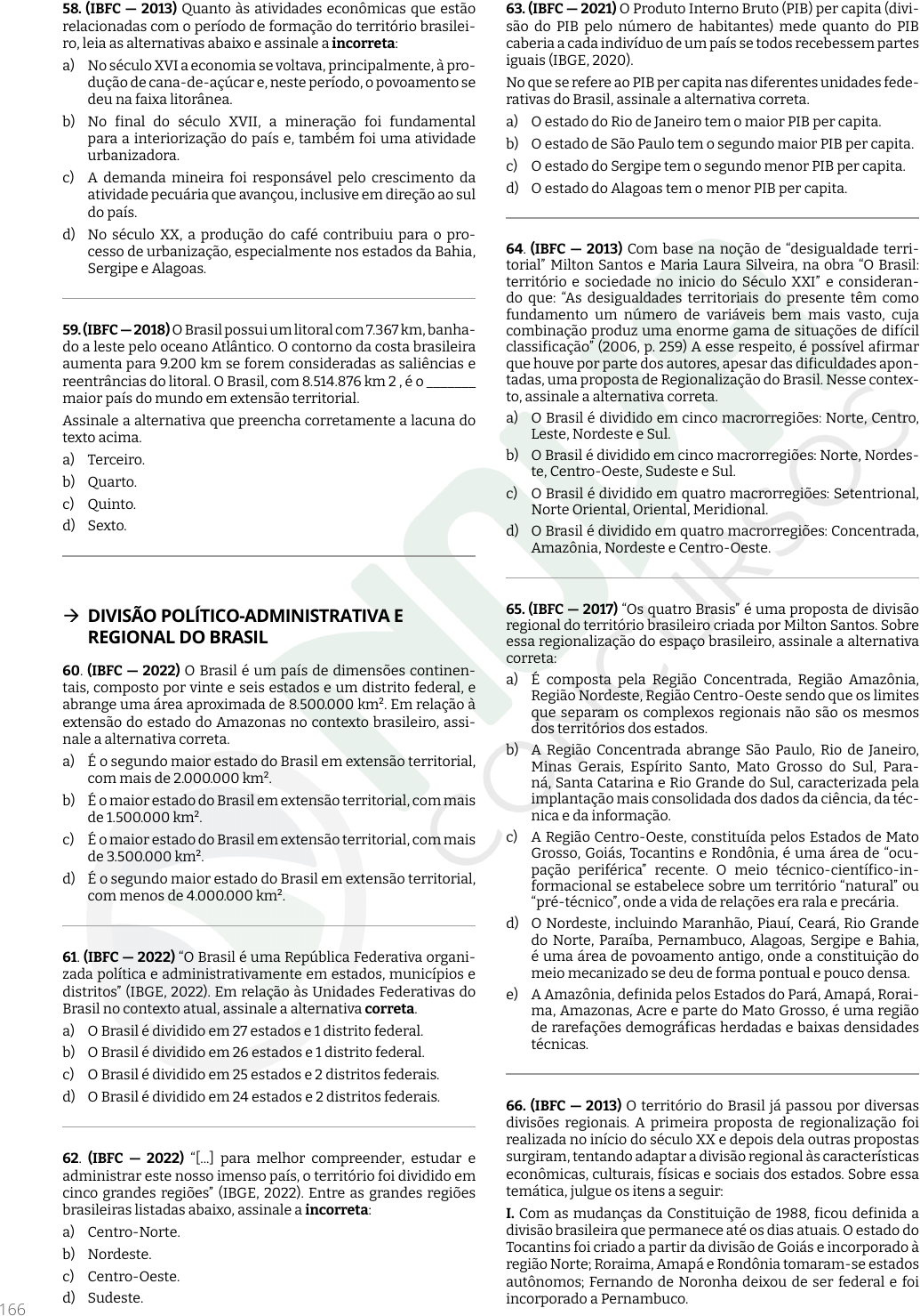 Ste ffa ny d a S ilv a A bid el - 1 64 .02 3.5 27 -2 1 166 58. (IBFC — 2013) Quanto às atividades econômicas que estão relacionadas com o período de formação do território brasilei- ro, leia as alternativas abaixo e assinale a incorreta: a) No século XVI a economia se voltava, principalmente, à pro- dução de cana-de-açúcar e, neste período, o povoamento se deu na faixa litorânea. b) No final do século XVII, a mineração foi fundamental para a interiorização do país e, também foi uma atividade urbanizadora. c) A demanda mineira foi responsável pelo crescimento da atividade pecuária que avançou, inclusive em direção ao sul do país. d) No século XX, a produção do café contribuiu para o pro- cesso de urbanização, especialmente nos estados da Bahia, Sergipe e Alagoas. 59. (IBFC — 2018) O Brasil possui um litoral com 7.367 km, banha- do a leste pelo oceano Atlântico. O contorno da costa brasileira aumenta para 9.200 km se forem consideradas as saliências e reentrâncias do litoral. O Brasil, com 8.514.876 km 2 , é o _______ maior país do mundo em extensão territorial. Assinale a alternativa que preencha corretamente a lacuna do texto acima. a) Terceiro. b) Quarto. c) Quinto. d) Sexto. Æ DIVISÃO POLÍTICO-ADMINISTRATIVA E REGIONAL DO BRASIL 60. (IBFC — 2022) O Brasil é um país de dimensões continen- tais, composto por vinte e seis estados e um distrito federal, e abrange uma área aproximada de 8.500.000 km². Em relação à extensão do estado do Amazonas no contexto brasileiro, assi- nale a alternativa correta. a) É o segundo maior estado do Brasil em extensão territorial, com mais de 2.000.000 km². b) É o maior estado do Brasil em extensão territorial, com mais de 1.500.000 km². c) É o maior estado do Brasil em extensão territorial, com mais de 3.500.000 km². d) É o segundo maior estado do Brasil em extensão territorial, com menos de 4.000.000 km². 61. (IBFC — 2022) “O Brasil é uma República Federativa organi- zada política e administrativamente em estados, municípios e distritos” (IBGE, 2022). Em relação às Unidades Federativas do Brasil no contexto atual, assinale a alternativa correta. a) O Brasil é dividido em 27 estados e 1 distrito federal. b) O Brasil é dividido em 26 estados e 1 distrito federal. c) O Brasil é dividido em 25 estados e 2 distritos federais. d) O Brasil é dividido em 24 estados e 2 distritos federais. 62. (IBFC — 2022) “[...] para melhor compreender, estudar e administrar este nosso imenso país, o território foi dividido em cinco grandes regiões” (IBGE, 2022). Entre as grandes regiões brasileiras listadas abaixo, assinale a incorreta: a) Centro-Norte. b) Nordeste. c) Centro-Oeste. d) Sudeste. 63. (IBFC — 2021) O Produto Interno Bruto (PIB) per capita (divi- são do PIB pelo número de habitantes) mede quanto do PIB caberia a cada indivíduo de um país se todos recebessem partes iguais (IBGE, 2020). No que se refere ao PIB per capita nas diferentes unidades fede- rativas do Brasil, assinale a alternativa correta. a) O estado do Rio de Janeiro tem o maior PIB per capita. b) O estado de São Paulo tem o segundo maior PIB per capita. c) O estado do Sergipe tem o segundo menor PIB per capita. d) O estado do Alagoas tem o menor PIB per capita. 64. (IBFC — 2013) Com base na noção de “desigualdade terri- torial” Milton Santos e Maria Laura Silveira, na obra “O Brasil: território e sociedade no inicio do Século XXI” e consideran- do que: “As desigualdades territoriais do presente têm como fundamento um número de variáveis bem mais vasto, cuja combinação produz uma enorme gama de situações de difícil classificação” (2006, p. 259) A esse respeito, é possível afirmar que houve por parte dos autores, apesar das dificuldades apon- tadas, uma proposta de Regionalização do Brasil. Nesse contex- to, assinale a alternativa correta. a) O Brasil é dividido em cinco macrorregiões: Norte, Centro, Leste, Nordeste e Sul. b) O Brasil é dividido em cinco macrorregiões: Norte, Nordes- te, Centro-Oeste, Sudeste e Sul. c) O Brasil é dividido em quatro macrorregiões: Setentrional, Norte Oriental, Oriental, Meridional. d) O Brasil é dividido em quatro macrorregiões: Concentrada, Amazônia, Nordeste e Centro-Oeste. 65. (IBFC — 2017) “Os quatro Brasis” é uma proposta de divisão regional do território brasileiro criada por Milton Santos. Sobre essa regionalização do espaço brasileiro, assinale a alternativa correta: a) É composta pela Região Concentrada, Região Amazônia, Região Nordeste, Região Centro-Oeste sendo que os limites que separam os complexos regionais não são os mesmos dos territórios dos estados. b) A Região Concentrada abrange São Paulo, Rio de Janeiro, Minas Gerais, Espírito Santo, Mato Grosso do Sul, Para- ná, Santa Catarina e Rio Grande do Sul, caracterizada pela implantação mais consolidada dos dados da ciência, da téc- nica e da informação. c) A Região Centro-Oeste, constituída pelos Estados de Mato Grosso, Goiás, Tocantins e Rondônia, é uma área de “ocu- pação periférica” recente. O meio técnico-científico-in- formacional se estabelece sobre um território “natural” ou “pré-técnico”, onde a vida de relações era rala e precária. d) O Nordeste, incluindo Maranhão, Piauí, Ceará, Rio Grande do Norte, Paraíba, Pernambuco, Alagoas, Sergipe e Bahia, é uma área de povoamento antigo, onde a constituição do meio mecanizado se deu de forma pontual e pouco densa. e) A Amazônia, definida pelos Estados do Pará, Amapá, Rorai- ma, Amazonas, Acre e parte do Mato Grosso, é uma região de rarefações demográficas herdadas e baixas densidades técnicas. 66. (IBFC — 2013) O território do Brasil já passou por diversas divisões regionais. A primeira proposta de regionalização foi realizada no início do século XX e depois dela outras propostas surgiram, tentando adaptar a divisão regional às car