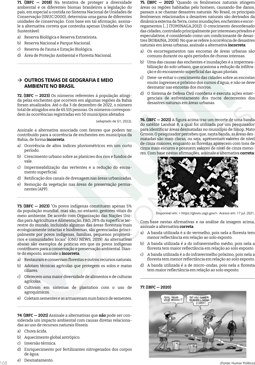 Ste ffa ny d a S ilv a A bid el - 1 64 .02 3.5 27 -2 1 168 71. (IBFC — 2018) Na tentativa de proteger a diversidade ambiental e os diferentes biomas brasileiros a legislação do país, em especial a contida no Sistema Nacional de Unidades de Conservação (SNUC/2000), determina uma gama de diferentes unidades de conservação. Com base em tal afirmação, assina- le a alternativa correta que contenha apenas Unidades de Uso Sustentável: a) Reserva Biológica e Reserva Extrativista. b) Reserva Nacional e Parque Nacional. c) Reserva de Fauna e Estação Biológica. d) Área de Proteção Ambiental e Floresta Nacional. Æ OUTROS TEMAS DE GEOGRAFIA E MEIO AMBIENTE NO BRASIL 72. (IBFC — 2023) Os números referentes à população atingi- da pelas enchentes que ocorrem em algumas regiões da Bahia foram atualizados. Até o dia 3 de dezembro de 2022, o número total de atingidos era de 65.515 pessoas. Os números correspon- dem às ocorrências registradas em 50 municípios afetados (adaptado de G1, 2022). Assinale a alternativa associada com fatores que podem ter contribuído para a ocorrência de enchentes em municípios da Bahia, de forma incorreta. a) Ocorrência de altos índices pluviométricos em um curto período. b) Crescimento urbano sobre as planícies dos rios e fundos de vale. c) Impermeabilização das vertentes e a redução do escoa- mento superficial. d) Retificação dos canais de drenagem nas áreas urbanizadas. e) Remoção da vegetação nas áreas de preservação perma- nentes (APP). 73. (IBFC — 2023) “Os povos indígenas constituem apenas 5% da população mundial, mas são, no entanto, gestores vitais do meio ambiente. De acordo com Organização das Nações Uni- das para Agricultura e Alimentação, FAO, 28% da superfície ter- restre do mundo, incluindo algumas das áreas florestais mais ecologicamente intactas e biodiversas, são gerenciadas princi- palmente por povos indígenas, famílias, pequenos proprietá- rios e comunidades locais” (ONU NEWS, 2019). As alternativas abaixo são exemplos de práticas em que os povos indígenas contribuem para a conservação e preservação ambiental. Dian- te do exposto, assinale a incorreta. a) Restauram e conservam florestas e outros recursos naturais. b) Adotam técnicas agrícolas que protegem os solos e matas ciliares. c) Oferecem uma maior diversidade de alimentos e de culturas agrícolas. d) Cultivam em sistemas de plantation com o uso de agroquímicos. e) Coletam sementes e as armazenam num banco de sementes. 74. (IBFC — 2021) Assinale a alternativas que não pode ser con- siderada um impacto ambiental com causas diretas relaciona- das ao uso de recursos naturais fósseis. a) Chuva ácida. b) Aquecimento global antrópico. c) Inversão térmica. d) Enriquecimento por fertilizantes nitrogenados dos corpos de água. e) Desmatamento. 75. (IBFC — 2021) “Quando os fenômenos naturais atingem áreas ou regiões habitadas pelo homem, causando-lhe danos, passam a se chamar desastres naturais. No Brasil, os principais fenômenos relacionados a desastres naturais são derivados da dinâmica externa da Terra, como inundações, enchentes e escor- regamentos [...] (TOMINAGA,2012). O crescimento desordenado das cidades, controlado principalmente por interesses privados e especulativos, é considerado como um condicionante de desas- tres (ROBAINA, 2008). No que se refere à ocorrência de desastres naturais em áreas urbanas, assinale a alternativa incorreta: a) Os escorregamentos nas encostas de áreas urbanas são comuns durante ou após períodos de chuvas intensas. b) Uma das causas das enchentes e inundações é a impermea- bilização do solo urbano, que ocasiona a redução da infiltra- ção e do escoamento superficial das águas pluviais. c) Deve-se evitar o crescimento das cidades sobre as encostas muito íngremes e próximo dos cursos d’água, e não se deve desmatar nas encostas dos morros. d) O Sistema de Defesa Civil coordena e executa ações emer- genciais de enfrentamento dos riscos decorrentes dos desastres naturais em áreas urbanas. 76. (IBFC — 2021) A figura acima traz um recorte de uma banda do satélite Landsat 8, a qual foi utilizada por um pesquisador para identificar áreas desmatadas no município de Sinop, Mato Grosso. O pesquisador percebeu que, nesta banda, as áreas des- matadas são mais claras, ou seja, apresentam valores de nível de cinza maiores, enquanto as florestas aparecem com tons de cinza mais escuros e possuem valores de nível de cinza meno- res. Com base nestas afirmações, assinale a alternativa correta: Disponível em: . Acesso em: 17 jul. 2021. Com base nestas afirmativas e na análise da imagem acima, assinale a alternativa correta: a) A banda utilizada é a do vermelho, pois nela a floresta tem menor reflectância em relação ao solo exposto. b) A banda utilizada é a do infravermelho médio, pois nela a floresta tem maior reflectância em relação ao solo exposto. c) A banda utilizada é a do infravermelho próximo, pois nela a floresta tem menor reflectância em relação ao solo exposto. d) A banda utilizada é a de micro-ondas, pois nela a floresta tem maior reflectância em relação ao solo exposto. 77. (IBFC — 2020) (Fonte: Humor Político) O conteúdo deste livro eletrônico é licenciado para Steffany da Silva Abidel - 164.023.527-21, vedada, por quaisquer meios e a qualquer título, a sua reprodução, cópia, divulgação ou distribuição, sujeitando-se aos infratores à responsabilização civil e criminal.