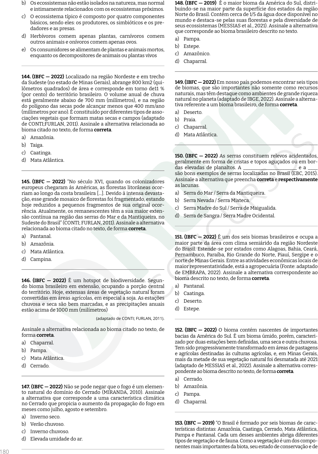 Ste ffa ny d a S ilv a A bid el - 1 64 .02 3.5 27 -2 1 180 b) Os ecossistemas não estão isolados na natureza, mas normal e intimamente relacionados com os ecossistemas próximos. c) O ecossistema típico é composto por quatro componentes básicos, sendo eles: os produtores, os simbióticos e os pre- dadores e as presas. d) Herbívoros comem apenas plantas, carnívoros comem outros animais e onívoros comem apenas ovos. e) Os consumidores se alimentam de plantas e animais mortos, enquanto os decompositores de animais ou plantas vivos 144. (IBFC — 2022) Localizado na região Nordeste e em trecho da Sudeste (no estado de Minas Gerais), abrange 800 km2 (qui- lômetros quadrados) de área e corresponde em torno de11 % (por cento) do território brasileiro. O volume anual de chuva está geralmente abaixo de 700 mm (milímetros), e na região do polígono das secas pode alcançar menos que 400 mm/ano (milímetros por ano). É constituído por diferentes tipos de asso- ciações vegetais que formam matas secas e campos (adaptado de CONTI;FURLAN, 2011). Assinale a alternativa relacionada ao bioma citado no texto, de forma correta. a) Amazônia. b) Taiga. c) Caatinga. d) Mata Atlântica. 145. (IBFC — 2022) “No século XVI, quando os colonizadores europeus chegaram às Américas, as florestas litorâneas ocor- riam ao longo da costa brasileira [...]. Devido à intensa devasta- ção, esse grande mosaico de florestas foi fragmentado, estando hoje reduzidos a pequenos fragmentos de sua original ocor- rência. Atualmente, os remanescentes têm a sua maior exten- são contínua na região das serras do Mar e da Mantiqueira, no Sudeste do Brasil” (CONTI; FURLAN, 2011). Assinale a alternativa relacionada ao bioma citado no texto, de forma correta. a) Pantanal. b) Amazônia. c) Mata Atlântica. d) Campina. 146. (IBFC — 2022) É um hotspot de biodiversidade. Segun- do bioma brasileiro em extensão, ocupando a porção central do território. Hoje, extensas áreas de vegetação natural foram convertidas em áreas agrícolas, em especial a soja. As estações chuvosa e seca são bem marcadas, e as precipitações anuais estão acima de 1000 mm (milímetros) (adaptado de CONTI; FURLAN, 2011). Assinale a alternativa relacionada ao bioma citado no texto, de forma correta. a) Chaparral. b) Pampa. c) Mata Atlântica. d) Cerrado. 147. (IBFC — 2022) Não se pode negar que o fogo é um elemen- to natural do domínio do Cerrado (MIRANDA, 2010). Assinale a alternativa que corresponde a uma característica climática no Cerrado que propicia o aumento da propagação do fogo em meses como julho, agosto e setembro. a) Inverno seco. b) Verão chuvoso. c) Inverno chuvoso. d) Elevada umidade do ar. 148. (IBFC — 2019) É o maior bioma da América do Sul, distri- buindo-se na maior parte da superfície dos estados da região Norte do Brasil. Contém cerca de 1/5 da água doce disponível no mundo e destaca-se pelas suas florestas e pela diversidade de seus ecossistemas (MESSIAS et al., 2021). Assinale a alternativa que corresponde ao bioma brasileiro descrito no texto. a) Pampa. b) Estepe. c) Amazônico. d) Chaparral. 149. (IBFC — 2022) Em nosso país podemos encontrar seis tipos de biomas, que são importantes não somente como recursos naturais, mas têm destaque como ambientes de grande riqueza natural no planeta (adaptado de IBGE, 2022). Assinale a alterna- tiva referente a um bioma brasileiro, de forma correta. a) Deserto. b) Praia. c) Chaparral. d) Mata Atlântica. 150. (IBFC — 2022) As serras constituem relevos acidentados, geralmente em forma de cristas e topos aguçados ou em bor- das elevadas de planaltos. A ______________________ e a ____ são bons exemplos de serras localizadas no Brasil (EBC, 2015). Assinale a alternativa que preencha correta e respectivamente as lacunas. a) Serra do Mar / Serra da Mantiqueira. b) Serra Nevada / Serra Mixteca. c) Serra Madre do Sul / Serra de Maigualida. d) Serra de Sangra / Serra Madre Ocidental. 151. (IBFC — 2022) É um dos seis biomas brasileiros e ocupa a maior parte da área com clima semiárido da região Nordeste do Brasil. Estende-se por estados como Alagoas, Bahia, Ceará, Pernambuco, Paraíba, Rio Grande do Norte, Piauí, Sergipe e o norte de Minas Gerais. Entre as atividades econômicas locais de maior representatividade, está a agropecuária (Fonte: adaptado de EMBRAPA, 2022). Assinale a alternativa correspondente ao bioma descrito no texto, de forma correta. a) Pantanal. b) Caatinga. c) Deserto. d) Estepe. 152. (IBFC — 2022) O bioma contém nascentes de importantes bacias da América do Sul. É um bioma úmido, porém, caracteri- zado por duas estações bem definidas, uma seca e outra chuvosa. Tem sido progressivamente transformado em áreas de pastagens e agrícolas destinadas às culturas agrícolas, e, em Minas Gerais, mais da metade de sua vegetação natural foi desmatada até 2021 (adaptado de MESSIAS et al., 2022). Assinale a alternativa corres- pondente ao bioma descrito no texto, de forma correta. a) Cerrado. b) Amazônia. c) Pampa. d) Chaparral. 153. (IBFC — 2019) “O Brasil é formado por seis biomas de carac- terísticas distintas: Amazônia, Caatinga, Cerrado, Mata Atlântica, Pampa e Pantanal. Cada um desses ambientes abriga diferentes tipos de vegetação e de fauna. Como a vegetação é um dos compo- nentes mais importantes da biota, seu estado de conservação e de O conteúdo deste livro eletrônico é licenciado para Steffany da Silva Abidel - 164.023.527-21, vedada, por quaisquer meios e a qualquer título, a sua reprodução, cópia, divulgação ou distribuição, sujeitando-se aos infratores à responsabilização civil e criminal.
