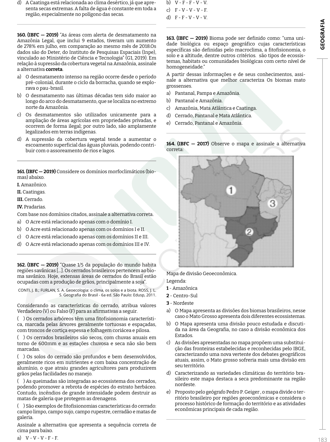 Ste ffa ny d a S ilv a A bid el - 1 64 .02 3.5 27 -2 1 G EO G RA FI A 183 d) A Caatinga está relacionada ao clima desértico, já que apre- senta secas extremas. A falta de água é constante em toda a região, especialmente no polígono das secas. 160. (IBFC — 2019) “As áreas com alerta de desmatamento na Amazônia Legal, que inclui 9 estados, tiveram um aumento de 278% em julho, em comparação ao mesmo mês de 2018.Os dados são do Deter, do Instituto de Pesquisas Espaciais (Inpe), vinculado ao Ministério de Ciência e Tecnologia” (G1, 2019). Em relação à supressão da cobertura vegetal na Amazônia, assinale a alternativa correta. a) O desmatamento intenso na região ocorre desde o período pré-colonial, durante o ciclo da borracha, quando se explo- rava o pau-brasil. b) O desmatamento nas últimas décadas tem sido maior ao longo do arco do desmatamento, que se localiza no extremo norte da Amazônia. c) Os desmatamentos são utilizados unicamente para a ampliação de áreas agrícolas em propriedades privadas, e ocorrem de forma ilegal; por outro lado, são amplamente legalizados em terras indígenas. d) A supressão da cobertura vegetal tende a aumentar o escoamento superficial das águas pluviais, podendo contri- buir com o assoreamento de rios e lagos. 161. (IBFC — 2019) Considere os domínios morfoclimáticos (bio- mas) abaixo. I. Amazônico. II. Caatingas. III. Cerrado. IV. Pradarias. Com base nos domínios citados, assinale a alternativa correta. a) O Acre está relacionado apenas com o domínio I. b) O Acre está relacionado apenas com os domínios I e II. c) O Acre está relacionado apenas com os domínios II e III. d) O Acre está relacionado apenas com os domínios III e IV. 162. (IBFC — 2019) “Quase 1/5 da população do mundo habita regiões savânicas [...]. Os cerrados brasileiros pertencem ao bio- ma savânico. Hoje, extensas áreas de cerrados do Brasil estão ocupadas com a produção de grãos, principalmente a soja”. CONTI, J. B.; FURLAN, S. A. Geoecologia: o clima, os solos e a biota. ROSS, J. L. S. Geografia do Brasil - 6a ed. São Paulo: Edusp, 2011. Considerando as características do cerrado, atribua valores Verdadeiro (V) ou Falso (F) para as afirmativas a seguir. ( ) Os cerrados arbóreos têm uma fitofisionomia característi- ca, marcada pelas árvores geralmente tortuosas e espaçadas, com troncos de cortiça espessa e folhagem coriácea e pilosa. ( ) Os cerrados brasileiros são secos, com chuvas anuais em torno de 600mm e as estações chuvosa e seca não são bem marcadas. ( ) Os solos do cerrado são profundos e bem desenvolvidos, geralmente ricos em nutrientes e com baixa concentração de alumínio, o que atraiu grandes agricultores para produzirem grãos pelas facilidades no manejo. ( ) As queimadas são integradas ao ecossistema dos cerrados, podendo promover a rebrota de espécies do estrato herbáceo. Contudo, incêndios de grande intensidade podem destruir as matas de galeria que protegem as drenagens. ( ) São exemplos de fitofisionomias características do cerrado: campo limpo, campo sujo, campo rupestre, cerradão e matas de galeria. Assinale a alternativa que apresenta a sequência correta de cima para baixo. a) V - V - V - F - F. b) V - F - F - V - V. c) F - V - V - V - F. d) F - F - V - V - V. 163. (IBFC — 2019) Bioma pode ser definido como: “uma uni- dade biológica ou espaço geográfico cujas características específicas são definidas pelo macroclima, a fitofisionomia, o solo e a altitude, dentre outros critérios. são tipos de ecossis- temas, habitats ou comunidades biológicas com certo nível de homogeneidade.” A partir dessas informações e de seus conhecimentos, assi- nale a alternativa que melhor caracteriza Os biomas mato grossenses. a) Pantanal, Pampa e Amazônia. b) Pantanal e Amazônia. c) Amazônia, Mata Atlântica e Caatinga. d) Cerrado, Pantanal e Mata Atlântica. e) Cerrado, Pantanal e Amazônia. 164. (IBFC — 2017) Observe o mapa e assinale a alternativa correta: Mapa de divisão Geoeconômica. Legenda: 1 - Amazônica 2 - Centro-Sul 3 - Nordeste a) O Mapa apresenta as divisões dos biomas brasileiros, nesse caso o Mato Grosso apresenta dois diferentes ecossistemas. b) O Mapa apresenta uma divisão pouco estudada e discuti- da na área da Geografia, no caso a divisão econômica dos Estados. c) As divisões apresentadas no mapa propõem uma substitui- ção das fronteiras estabelecidas e reconhecidas pelo IBGE, caracterizando uma nova vertente dos debates geográficos atuais, assim, o Mato grosso sofreria mais uma divisão em seu território. d) Caracterizando as variedades climáticas do território bra- sileiro este mapa destaca a seca predominante na região nordeste. e) Proposto pelo geógrafo Pedro P. Geiger , o mapa divide o ter- ritório brasileiro por regiões geoeconômicas e considera o processo histórico de formação do território e as atividades econômicas principais de cada região. O conteúdo deste livro eletrônico é licenciado para Steffany da Silva Abidel - 164.023.527-21, vedada, por quaisquer meios e a qualquer título, a sua reprodução, cópia, divulgação ou distribuição, sujeitando-se aos infratores à responsabilização civil e criminal.