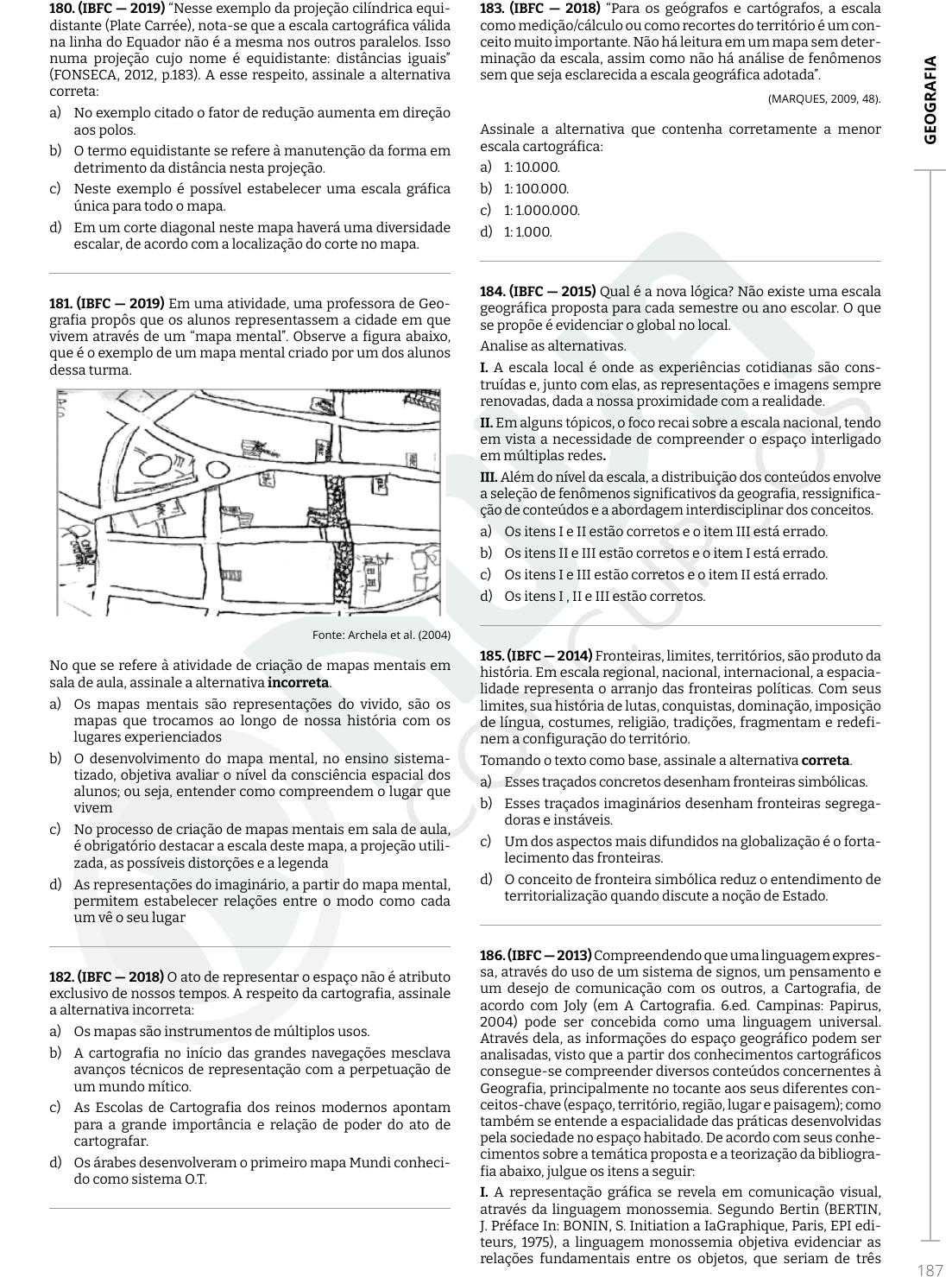 Ste ffa ny d a S ilv a A bid el - 1 64 .02 3.5 27 -2 1 G EO G RA FI A 187 180. (IBFC — 2019) “Nesse exemplo da projeção cilíndrica equi- distante (Plate Carrée), nota-se que a escala cartográfica válida na linha do Equador não é a mesma nos outros paralelos. Isso numa projeção cujo nome é equidistante: distâncias iguais” (FONSECA, 2012, p.183). A esse respeito, assinale a alternativa correta: a) No exemplo citado o fator de redução aumenta em direção aos polos. b) O termo equidistante se refere à manutenção da forma em detrimento da distância nesta projeção. c) Neste exemplo é possível estabelecer uma escala gráfica única para todo o mapa. d) Em um corte diagonal neste mapa haverá uma diversidade escalar, de acordo com a localização do corte no mapa. 181. (IBFC — 2019) Em uma atividade, uma professora de Geo- grafia propôs que os alunos representassem a cidade em que vivem através de um “mapa mental”. Observe a figura abaixo, que é o exemplo de um mapa mental criado por um dos alunos dessa turma. Fonte: Archela et al. (2004) No que se refere à atividade de criação de mapas mentais em sala de aula, assinale a alternativa incorreta. a) Os mapas mentais são representações do vivido, são os mapas que trocamos ao longo de nossa história com os lugares experienciados b) O desenvolvimento do mapa mental, no ensino sistema- tizado, objetiva avaliar o nível da consciência espacial dos alunos; ou seja, entender como compreendem o lugar que vivem c) No processo de criação de mapas mentais em sala de aula, é obrigatório destacar a escala deste mapa, a projeção utili- zada, as possíveis distorções e a legenda d) As representações do imaginário, a partir do mapa mental, permitem estabelecer relações entre o modo como cada um vê o seu lugar 182. (IBFC — 2018) O ato de representar o espaço não é atributo exclusivo de nossos tempos. A respeito da cartografia, assinale a alternativa incorreta: a) Os mapas são instrumentos de múltiplos usos. b) A cartografia no início das grandes navegações mesclava avanços técnicos de representação com a perpetuação de um mundo mítico. c) As Escolas de Cartografia dos reinos modernos apontam para a grande importância e relação de poder do ato de cartografar. d) Os árabes desenvolveram o primeiro mapa Mundi conheci- do como sistema O.T. 183. (IBFC — 2018) “Para os geógrafos e cartógrafos, a escala como medição/cálculo ou como recortes do território é um con- ceito muito importante. Não há leitura em um mapa sem deter- minação da escala, assim como não há análise de fenômenos sem que seja esclarecida a escala geográfica adotada”. (MARQUES, 2009, 48). Assinale a alternativa que contenha corretamente a menor escala cartográfica: a) 1: 10.000. b) 1: 100.000. c) 1: 1.000.000. d) 1: 1.000. 184. (IBFC — 2015) Qual é a nova lógica? Não existe uma escala geográfica proposta para cada semestre ou ano escolar. O que se propõe é evidenciar o global no local. Analise as alternativas. I. A escala local é onde as experiências cotidianas são cons- truídas e, junto com elas, as representações e imagens sempre renovadas, dada a nossa proximidade com a realidade. II. Em alguns tópicos, o foco recai sobre a escala nacional, tendo em vista a necessidade de compreender o espaço interligado em múltiplas redes. III. Além do nível da escala, a distribuição dos conteúdos envolve a seleção de fenômenos significativos da geografia, ressignifica- ção de conteúdos e a abordagem interdisciplinar dos conceitos. a) Os itens I e II estão corretos e o item III está errado. b) Os itens II e III estão corretos e o item I está errado. c) Os itens I e III estão corretos e o item II está errado. d) Os itens I , II e III estão corretos. 185. (IBFC — 2014) Fronteiras, limites, territórios, são produto da história. Em escala regional, nacional, internacional, a espacia- lidade representa o arranjo das fronteiras políticas. Com seus limites, sua história de lutas, conquistas, dominação, imposição de língua, costumes, religião, tradições, fragmentam e redefi- nem a configuração do território. Tomando o texto como base, assinale a alternativa correta. a) Esses traçados concretos desenham fronteiras simbólicas. b) Esses traçados imaginários desenham fronteiras segrega- doras e instáveis. c) Um dos aspectos mais difundidos na globalização é o forta- lecimento das fronteiras. d) O conceito de fronteira simbólica reduz o entendimento de territorialização quando discute a noção de Estado. 186. (IBFC — 2013) Compreendendo que uma linguagem expres- sa, através do uso de um sistema de signos, um pensamento e um desejo de comunicação com os outros, a Cartografia, de acordo com Joly (em A Cartografia. 6.ed. Campinas: Papirus, 2004) pode ser concebida como uma linguagem universal. Através dela, as informações do espaço geográfico podem ser analisadas, visto que a partir dos conhecimentos cartográficos consegue-se compreender diversos conteúdos concernentes à Geografia, principalmente no tocante aos seus diferentes con- ceitos-chave (espaço, território, região, lugar e paisagem); como também se entende a espacialidade das práticas desenvolvidas pela sociedade no espaço habitado. De acordo com seus conhe- cimentos sobre a temática proposta e a teorização da bibliogra- fia abaixo, julgue os itens a seguir: I. A representação gráfica se revela em comunicação visual, através da linguagem monossemia. Segundo Bertin (BERTIN, J. Préface In: BONIN, S. Initiation a IaGraphique, Paris, EPI edi- teurs, 1975), a linguagem monossemia objetiva evidenciar as relações fundamentais entre os objetos, que seriam de três O conteúdo deste livro eletrônico é licenciado para Steffany da Silva Abidel - 164.023.527-21, vedada, por quaisquer meios e a qualquer título, a sua reprodução, cópia, divulgação ou distribuição, sujeitando-se aos