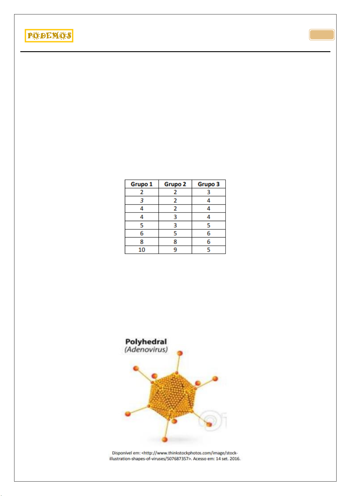 UFJF – PISM – MÓDULO II – TRIÊNIO 2015/2017 – 2017 Prof. Otávio Luciano Camargo Sales de Magalhães . 325 2)(Vestibular Seriado – PISM / UFJF – Triênio 2015/2017 – 2º ano do Ensino Médio – 2017) Uma calculadora possui duas teclas especiais: − a tecla A, que triplica o número que aparece no visor; e − a tecla B, que soma 4 unidades ao número que aparece no visor. Suponha que no visor esteja o número 12. Ao apertar, primeiramente, a tecla A um total de 9 vezes e, logo em seguida, ao apertar a tecla B um total de 4 vezes obtemos uma sequência de 13 resultados. É correto afirmar que: a)a soma dos 9 primeiros resultados é 6.(310-1). b)a soma dos 4 últimos resultados é 20.(310+2). c)o 12º resultado é 12.(39 +1)+4. d)o 10º resultado é 12.(39). e)a soma dos 13 resultados é 22.(310+1) 3)(Vestibular Seriado – PISM / UFJF – Triênio 2015/2017 – 2º ano do Ensino Médio – 2017) Um nutricionista indicou três dietas diferentes para grupos de pacientes que gostariam de perder peso (em quilogramas). A tabela a seguir indica a perda de peso (em quilogramas) por paciente de cada grupo. A partir desses dados, a média de perda de peso do Grupo 1, a mediana de perda de peso do grupo 3 e a moda da perda de peso do grupo 2 é dado, respectivamente, por: a)5,25 ; 4,5 ; 2,0 b)4,25 ; 4,5 ; 3,0 c)4,75 ; 2,0 ; 4,0 d)5,25 ; 3,0 ; 4,5 e)4,75 ; 4,0 ; 4,5 4)(Vestibular Seriado – PISM / UFJF – Triênio 2015/2017 – 2º ano do Ensino Médio – 2017) Observe, abaixo, uma imagem desse vírus que tem a forma de um sólido geométrico. Qual é a planificação do sólido representado por esse vírus?