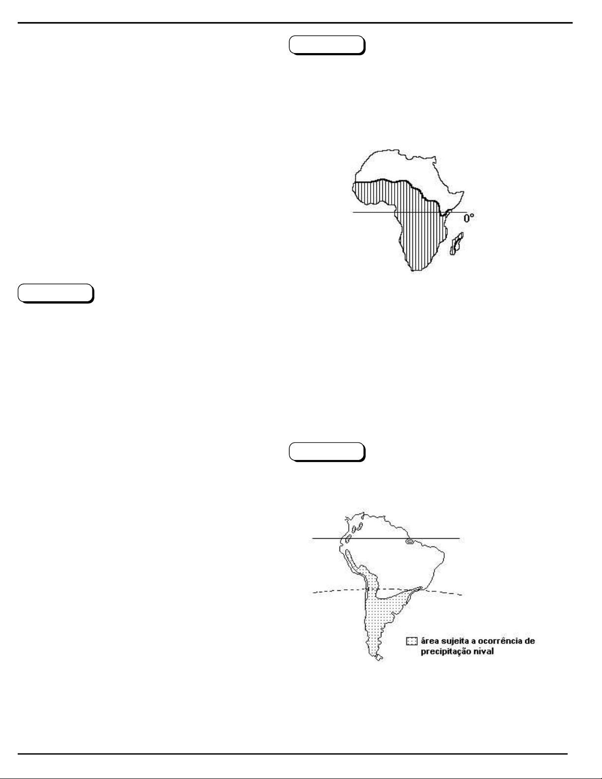 Tipos Climáticos 1. Temperado 2. Mediterrâneo 3. Semi-árido 4. Desértico 5. Semi-árido 6. Tropical 7. Equatorial No planisfério, essa seqüência de tipos climáticos pode ser encontrada no eixo: a) A-B b) I-J c) C-D d) G-H e) E-F Questão 301 O furacão "Katrina", anunciado com dias de antecedência, graças às fotos de satélites, atingiu o sul dos Estados Unidos no final do mês de agosto de 2005, provocando mortes e prejuízos. Sobre o fato, são feitas as seguintes afirmações: I. formados em áreas de águas frias nas médias latitudes do Atlântico, os furacões sempre ameaçaram a costa leste estadunidense nos meses de verão; II. a região destaca-se pela produção e refino de petróleo, e a intensidade do fenômeno provocou o comprometimento das atividades e gerou alta dos preços do barril do combustível; III. grande parte das vítimas e dos desabrigados pertencem às camadas sociais mais baixas, mostrando ao mundo a desigualdade socioeconômica encontrada na sociedade norte-americana; IV. os estados mais atingidos têm elevada predominância de imigrantes hispânicos que encontram na região melhores condições de trabalho do que aquelas existentes na Califórnia. Está correto somente o que se afirma em a) I e II. b) I e III. c) I e IV. d) II e III. e) III e IV. Questão 302 O mapa destaca o conjunto dos espaços onde vivem e predominam populações do grupo étnico negróide. A chamada "África Negra" se estende, principalmente, por áreas de climas. a) tropicais e equatoriais, com domínio dos desertos e savanas. b) temperadas e subtropicais, cobertas de savanas, desertos e estepes. c) equatoriais, com domínio das savanas, florestas e desertos. d) equatoriais e tropicais, onde ocorrem florestas, savanas e estepes. e) equatoriais, cobertas de florestas e desertos. Questão 303 Como se explica a ocorrência de precipitação de neve na região intertropical do mapa? a) Compartimentação do relevo b) Distribuição das formações vegetais c) Circulação das massas de ar d) Distribuição das correntes marinhas e) Forma do continente 79