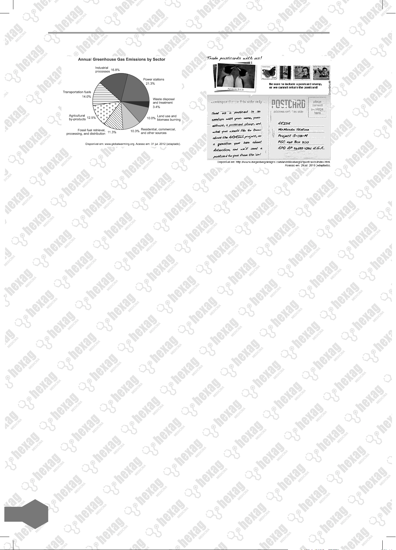 20 22. (Enem) A emissão de gases tóxicos na atmosfera traz diversas consequências para nosso planeta. De acordo com o gráfico, retirado do texto Global warming is an international issue, observa-se que: a) as queimadas poluem um pouco mais do que os combustíveis usados nos meios de transporte. b) as residências e comércios são os menores emis- sores de gases de efeito estufa na atmosfera. c) o processo de tratamento de água contribui para a emissão de gases poluentes no planeta. d) os combustíveis utilizados nos meios de transpor- tes poluem mais do que as indústrias. e) os maiores emissores de gases de efeito estufa na atmosfera são as usinas elétricas. 23. (Enem) Viva la Vida I used to rule the world Seas would rise when I gave the word Now in the morning and I sleep alone Sweep the streets I used to own I used to roll the dice Feel the fear in my enemy’s eyes Listen as the crowd would sing “Now the old king is dead! Long live the king!” One minute I held the key Next the walls were closed on me And I discovered that my castles stand Upon pillars of salt and pillars of sand […] MARTIN, C. Viva la vida, Coldplay. In: Viva la vida or Death and all his friends. Parlophone, 2008. Letras de músicas abordam temas que, de certa forma, podem ser reforçados pela re- petição de trechos ou palavras. O fragmento da canção Viva la vida, por exemplo, permite conhecer o relato de alguém que a) costumava ter o mundo aos seus pés e, de repente, se viu sem nada. b) almeja o título de rei e, por ele, tem enfren- tado inúmeros inimigos. c) causa pouco temor a seus inimigos, embora tenha muito poder. d) limpava as ruas e, com seu esforço, tornou- -se rei de seu povo. e) tinha a chave para todos os castelos nos quais desejava morar. 24. (Enem) Os cartões-postais costumam ser utilizados por viajantes que desejam enviar noticias dos lugares que visitam a parentes e ami- gos. Publicado no site do projeto ANDRILL, o texto em formato de cartão-postal tem o propósito de: a) comunicar o endereço da nova sede do pro- jeto nos Estados Unidos. b) convidar colecionadores de cartões-postais a se reunirem em um evento. c) anunciar uma nova coleção de selos para an- gariar fundos para a Antártica. d) divulgar as pessoas a possibilidade de rece- berem um cartão-postal da Antártica. e) solicitar que as pessoas visitem o site do mencionado projeto com maior frequência. 25. (Enem) How fake images change our memory and behaviour For decades, researchers have been exploring just how unreliable our own memories are. Not only is memory fick- le when we access it, but it’s also quite easily subverted and rewritten. Combine this susceptibility with modern image-editing software at our fingertips like Photoshop, and it’s a recipe for disaster. In a world where we can witness news and world events as they unfold, fake images surround us, and our minds accept these pictures as real, and remember them later. These fake memories don’t just distort how we see our past, they affect our current and future behaviour too – from what we eat, to how we protest and vote. The problem is there’s virtually nothing we can do to stop it. Old memories seem to be the easiest to ma- nipulate. In one study, subjects were showed images from their childhood. Along with real images, researchers snuck in manipulated photographs of the subject taking a hot-air balloon ride with his or her family. After seeing those images, 50% of subjects recalled some part of that hot-air balloon ride – thou- gh the event was entirely made up. EVELETH, R. Disponível em: www.bbc.com. Acesso em: 10 jan. 2013 (adaptado).