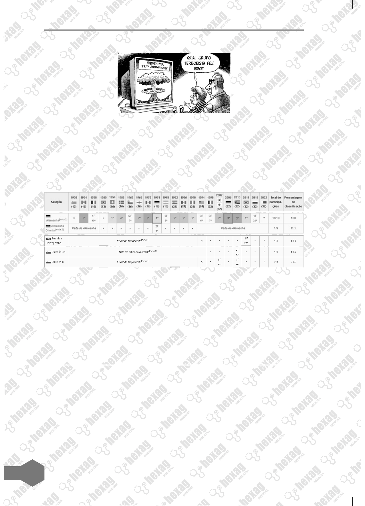 190 29. A charge faz uma crítica as recentes ações da política externa norte-americana, usando como base o histórico massacre de Hiroshima em 1945. Essa crítica se sustenta à medida que observamos o[a] a) antagonismo entre o fato histórico e os esforços da chamada guerra ao terror norte-americana. b) alienação do jovem frente o enriquecimento dos países produtores de petróleo. c) crítica do jovem em relação aos acontecimentos e a passividade do pai com o fato. d) inconformismo do menino frente a comemoração do ataque a cidade de Hiroshima. e) fracasso do sistema de ensino norte-americano que não investe em preservação da memória. 30. https://pt.wikipedia.org/wiki/Participa%C3%A7%C3%B5es_das_sele%C3%A7%C3%B5es_nacionais_na_Copa_do_Mundo_de_Futebol A História da participação das seleções em torneios de Copa do Mundo de futebol pode ser usada como fonte de análise da geopolítica mundial ao longo dos anos. Os países presentes nesse quadro comparativo tiveram como fator determinante para as suas par- ticipações nessa competição a) a inabilidade dos participantes dessas seleções de futebol. b) a falta de investimento no esporte como política de estado. c) as disputas ligadas a bipolaridade geopolítica do pós-segunda guerra mundial. d) os conflitos armados durante a primeira guerra mundial que marcaram a juventude local e) as disputas militares na Europa após o desmantelamento dos grandes impérios. GAbARito 1. A 2. B 3. A 4. C 5. B 6. C 7. C 8. C 9. C 10. E 11. D 12. D 13. B 14. A 15. A 16. E 17. E 18. D 19. B 20. B 21. B 22. B 23. C 24. C 25. C 26. D 27. D 28. B 29. A 30. C
