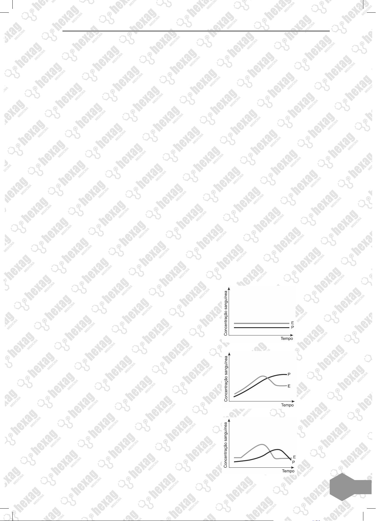 391 11. (Enem PPL) Os conhecimentos de fisiologia são aqueles básicos para compreender as al- terações que ocorrem durante as atividades físicas (frequência cardíaca, queima de calo- rias, perda de água e sais minerais) e aque- las que ocorrem em longo prazo (melhora da condição cardiorrespiratória, aumento da massa muscular, da força e da flexibilidade e diminuição de tecido adiposo). A bioquí- mica abordará conteúdos que subsidiam a fisiologia: alguns processos metabólicos de produção de energia, eliminação e reposição de nutrientes básicos. Os conhecimentos de biomecânica são relacionados à anatomia e contemplam, principalmente, a adequação dos hábitos posturais, como, por exemplo, levantar um peso e equilibrar objetos. BRASIL. Parâmetros Curriculares Nacionais: Educação Física. Brasília: MEC/SEF, 1997. Em um exercício físico, são exemplos da abordagem fisiológica, bioquímica e biome- cânica, respectivamente: a) a quebra da glicose na célula para produção de energia no ciclo de Krebs; o aumento da frequ- ência cardíaca e da pressão arterial; o tamanho da passada durante a execução da corrida. b) a quebra da glicose na célula para produção de energia no ciclo de Krebs; o tamanho da pas- sada durante a execução da corrida; o aumento da frequência cardíaca e da pressão arterial. c) o tamanho da passada durante a execução da corrida; o aumento da frequência cardíaca e da pressão arterial; a quebra da glicose na célula para produção de energia no ciclo de Krebs. d) o aumento da frequência cardíaca e da pres- são arterial; a quebra da glicose na célula para produção de energia no ciclo de Krebs; o tama- nho da passada durante a execução da corrida. e) o aumento da frequência cardíaca e pressão arterial; o tamanho da passada durante a exe- cução da corrida; a quebra da glicose na célula para produção de energia no ciclo de Krebs. 12. (Enem 2017) Os medicamentos são rotineira- mente utilizados pelo ser humano com o in- tuito de diminuir ou, por muitas vezes, curar possíveis transtornos de saúde. Os antibióti- cos são grupos de fármacos inseridos no tra- tamento de doenças causadas por bactérias. Na terapêutica das doenças mencionadas, al- guns desses fármacos atuam: a) ativando o sistema imunológico do hospe- deiro. b) interferindo na cascata bioquímica da infla- mação. c) removendo as toxinas sintetizadas pelas bactérias. d) combatendo as células hospedeiras das bac- térias. e) danificando estruturas específicas da célula bacteriana. 13. (Enem) Portadores de diabetes insipidus re- clamam da confusão feita pelos profissionais da saúde quanto aos dois tipos de diabetes: mellitus e insipidus. Enquanto o primeiro tipo está associado aos níveis ou à ação da insulina, o segundo não está ligado à defici- ência desse hormônio. O diabetes insipidus é caracterizado por um distúrbio na produção ou no funcionamento do hormônio antidiu- rético (na sigla em inglês, ADH), secretado pela neuro-hipófise para controlar a reabsor- ção de água pelos túbulos renais. Tendo em vista o papel funcional do ADH, qual é um sintoma clássico de um paciente acometido por diabetes insipidus? a) Alta taxa de glicose no sangue b) Aumento da pressão arterial c) Ganho de massa corporal d) Anemia crônica e) Desidratação 14. (Enem) A pílula anticoncepcional é um dos métodos contraceptivos de maior segurança, sendo constituída basicamente de dois hor- mônios sintéticos semelhantes aos hormô- nios produzidos pelo organismo feminino, o estrogênio (E) e a progesterona (P). Em um experimento médico, foi analisado o sangue de uma mulher que ingeriu ininterrupta- mente um comprimido desse medicamento por dia durante seis meses. Qual gráfico representa a concentração san- guínea desses hormônios durante o período do experimento? a) b) c)