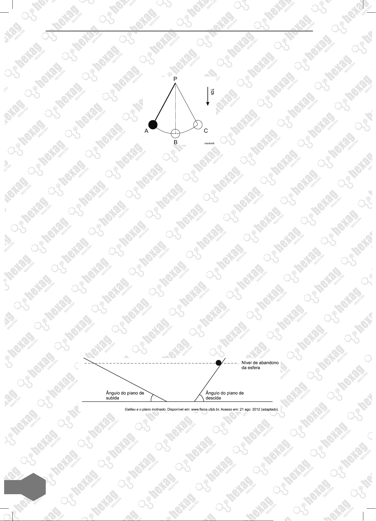 470 5. O pêndulo de um relógio é constituído por uma haste rígida com um disco de metal preso em uma de suas extremidades. O disco oscila entre as posições A e C, enquanto a outra extremidade da haste permanece imóvel no ponto P. A figura abaixo ilustra o sistema. A força resultante que atua no disco quando ele passa por B, com a haste na direção vertical, é: (Considere que g é a aceleração local da gravidade.) a) nula. b) vertical, com sentido para cima. c) vertical, com sentido para baixo. d) horizontal, com sentido para a direita. e) horizontal, com sentido para a esquerda. 6. (Enem) Num sistema de freio convencional, as rodas do carro travam e os pneus derrapam no solo, caso a força exercida sobre o pedal seja muito intensa. O sistema ABS evita o travamento das rodas, mantendo a força de atrito no seu valor estático máximo, sem derrapagem. O coeficiente de atrito estático da borracha em contato com o concreto vale me = 1,0 e o coeficiente de atrito cinético para o mesmo par de materiais é mc = 0,75. Dois carros, com velocidades iniciais iguais a 108 km/h iniciam a frenagem numa estrada perfeitamente horizontal de concreto no mesmo ponto. O carro 1 tem sistema ABS e utiliza a força de atrito estática máxima para a frenagem; já o carro 2 trava as rodas, de maneira que a força de atrito efetiva é a cinética. Considere g = 10 m/s2. As distâncias, medidas a partir do ponto em que iniciam a frenagem, que os carros 1 (d1) e 2 (d2) percorrem até parar são, respectivamente: a) d1 = 45 m e d2 = 60 m. b) d1 = 60 m e d2 = 45 m. c) d1 = 90 m e d2 = 120 m. d) d1 = 5,8·102 m e d2 = 7,8·102 m. e) d1 = 7,8·102 m e d2 = 5,8·102 m. 7. (Enem) Para entender os movimentos dos corpos, Galileu discutiu o movimento de uma esfera de metal em dois planos inclinados sem atritos e com a possibilidade de se alterarem os ângulos de inclinação, conforme mostra a figura. Na descrição do experimento, quando a esfera de metal é abandonada para descer um plano inclinado de um determinado nível, ela sempre atinge, no plano ascendente, no máximo, um nível igual àquele em que foi abandonada. (necessário desconsiderar o atrito com o ar e com o solo) Se o ângulo de inclinação do plano de subida for reduzido a zero, a esfera: a) manterá sua velocidade constante, pois o impulso resultante sobre ela será nulo. b) manterá sua velocidade constante, pois o impulso da descida continuará a empurrá-la. c) diminuirá gradativamente a sua velocidade, pois não haverá mais impulso para empurrá-la. d) diminuirá gradativamente a sua velocidade, pois o impulso resultante será contrário ao seu movimento. e) aumentará gradativamente a sua velocidade, pois não haverá nenhum impulso contrário ao seu movimento.